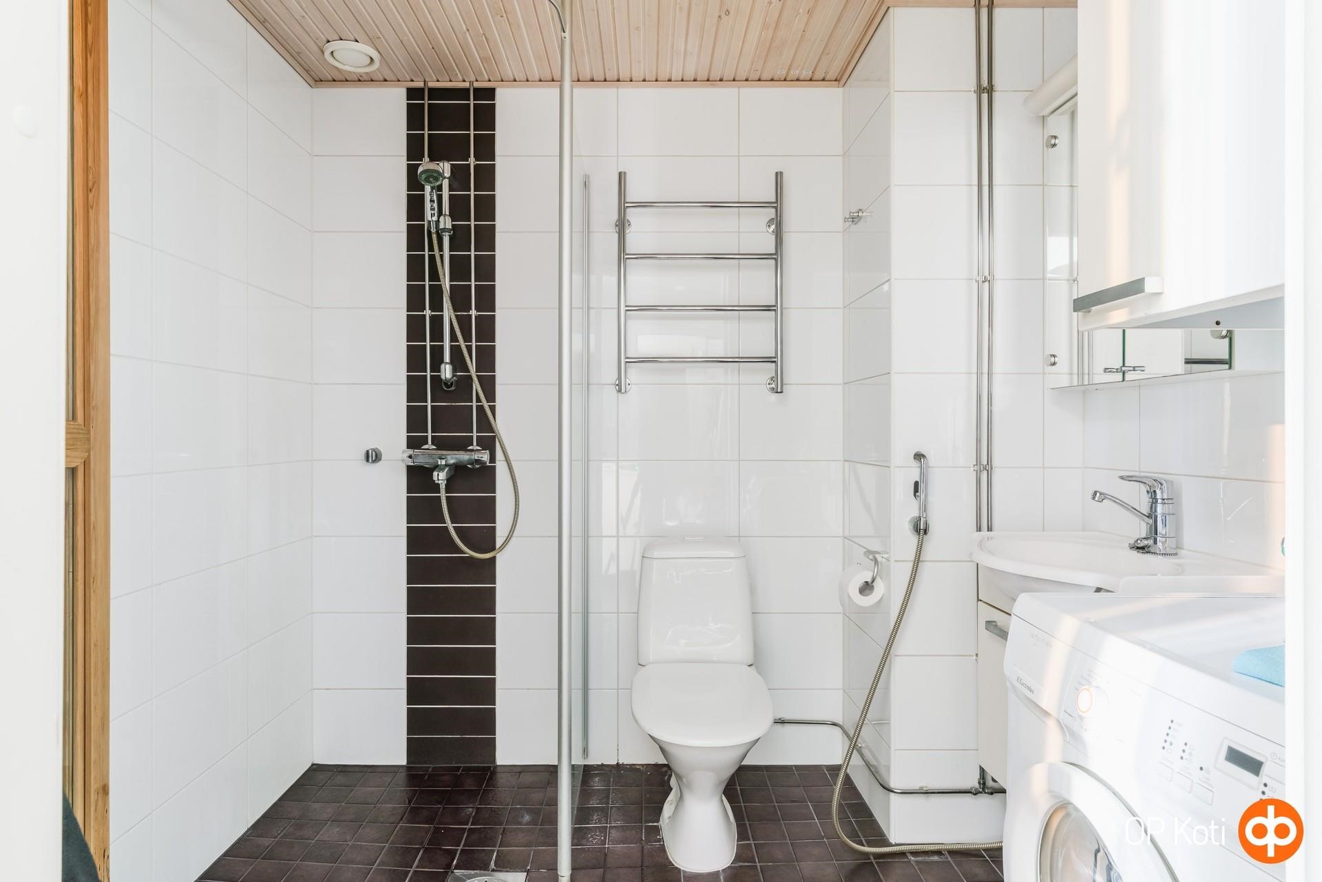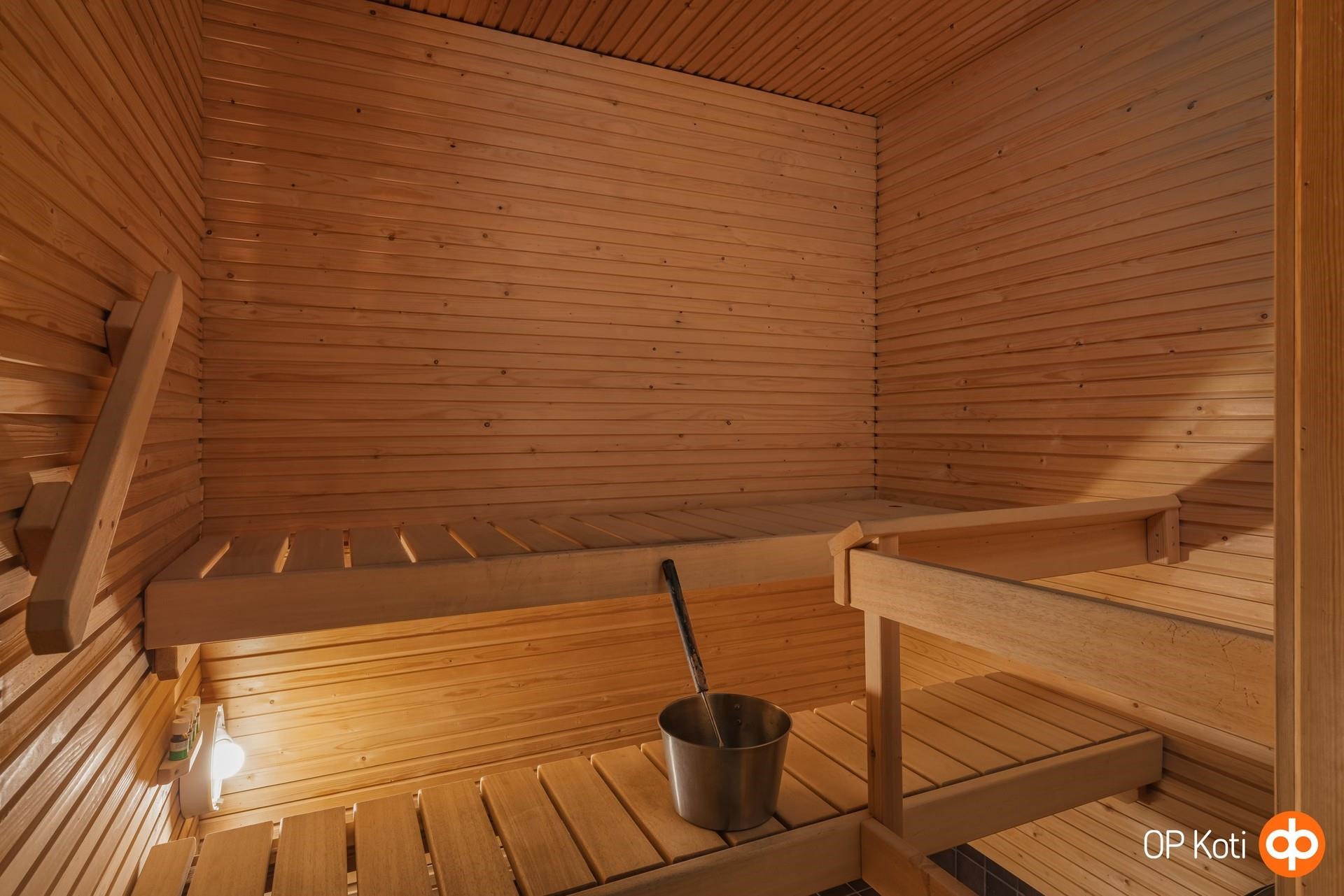 - Sauna, sähkökiuas, kylpyhuone, suihku, suihkuseinä, peilikaappi, allaskaappi, pesukoneliitäntä, lattialämmitys, kiinteät valaisimet, pyyhekuivain.