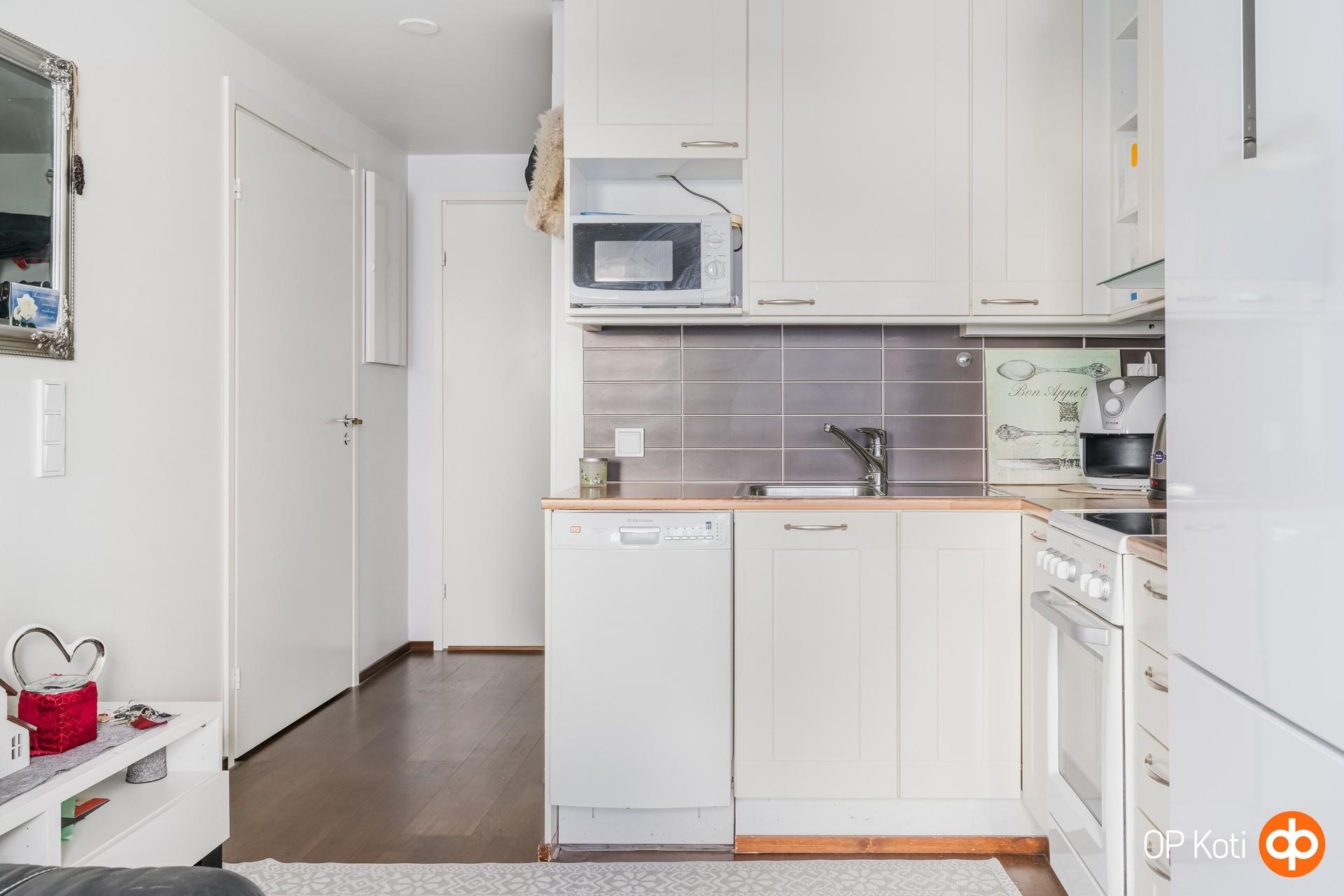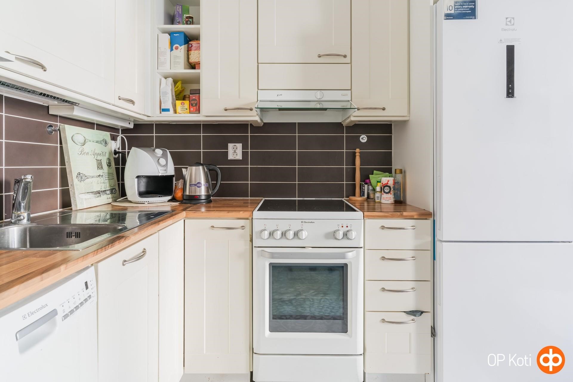 - Jääkaappipakastin, keraaminen liesi, liesikupu, astianpesukone, kaapistot, kiinteät valaisimet.