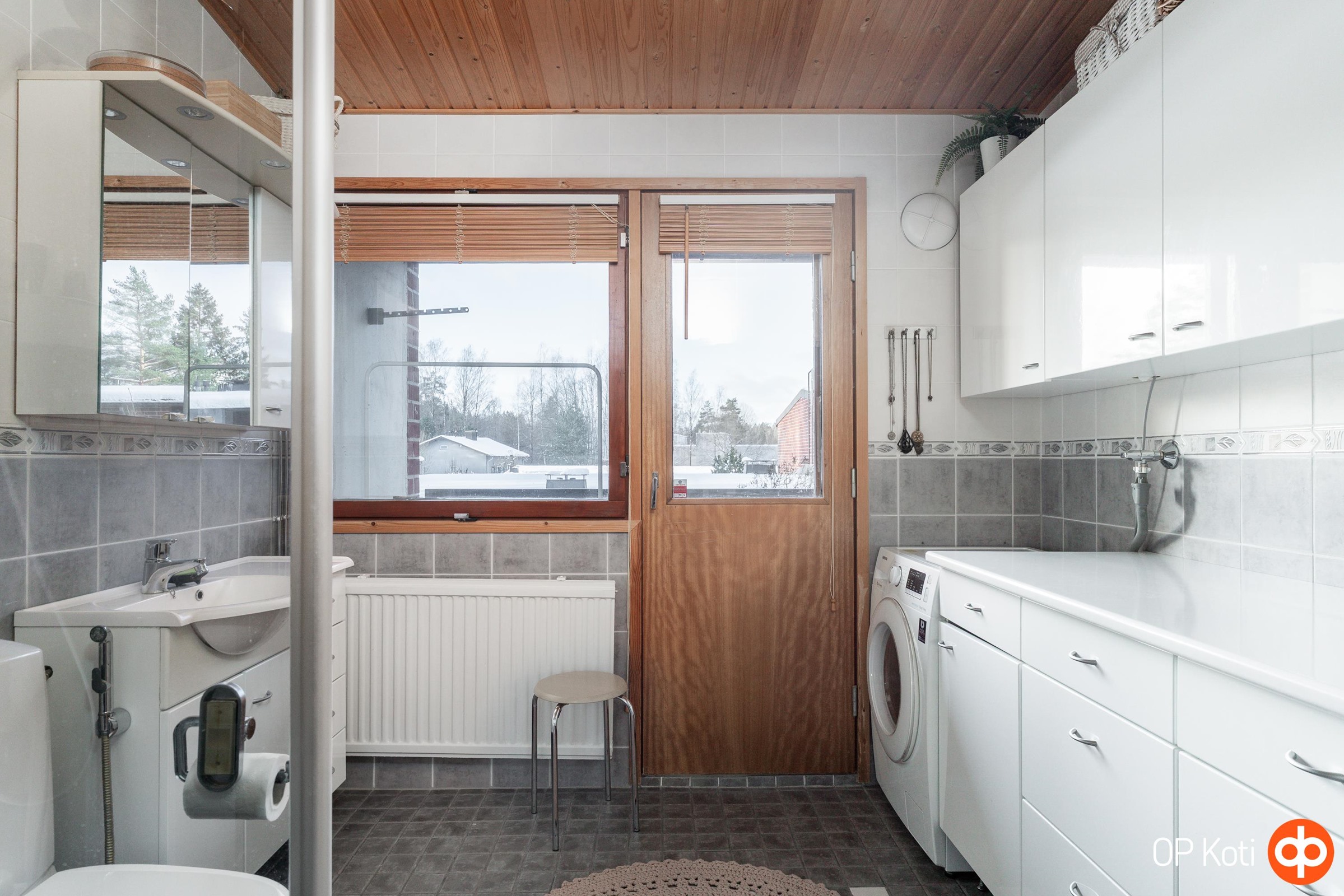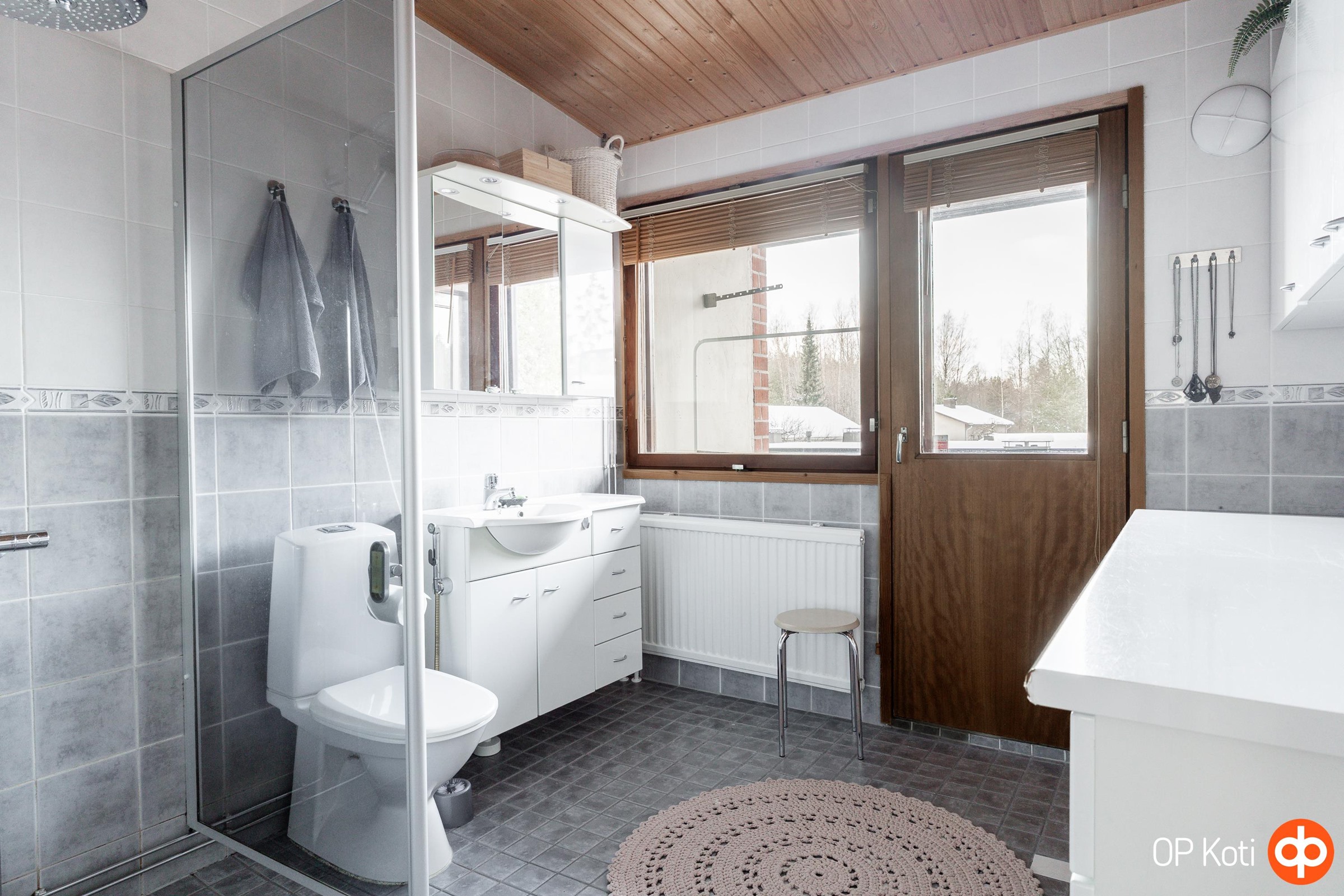 - Sauna, sähkökiuas, kylpyhuone, erillinen wc alakerrassa, suihku, suihkuseinä, peilikaappi, kaapit, allaskaappi alakerran wc, pesukoneliitäntä, lattialämmitys sähköinen kph ja wc, kiinteät valaisimet. Kylpyhuone tarkastettu 11.3.2025