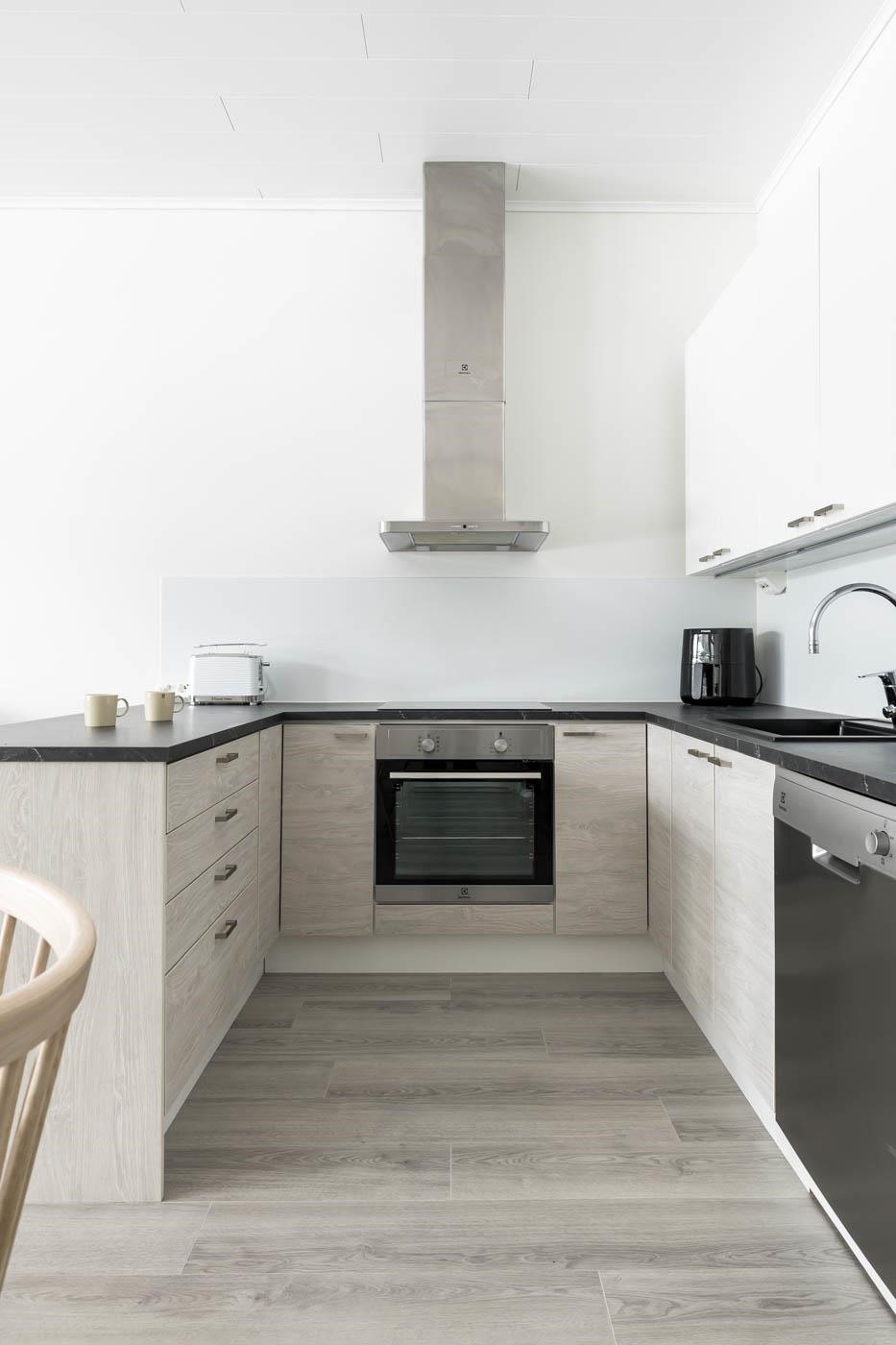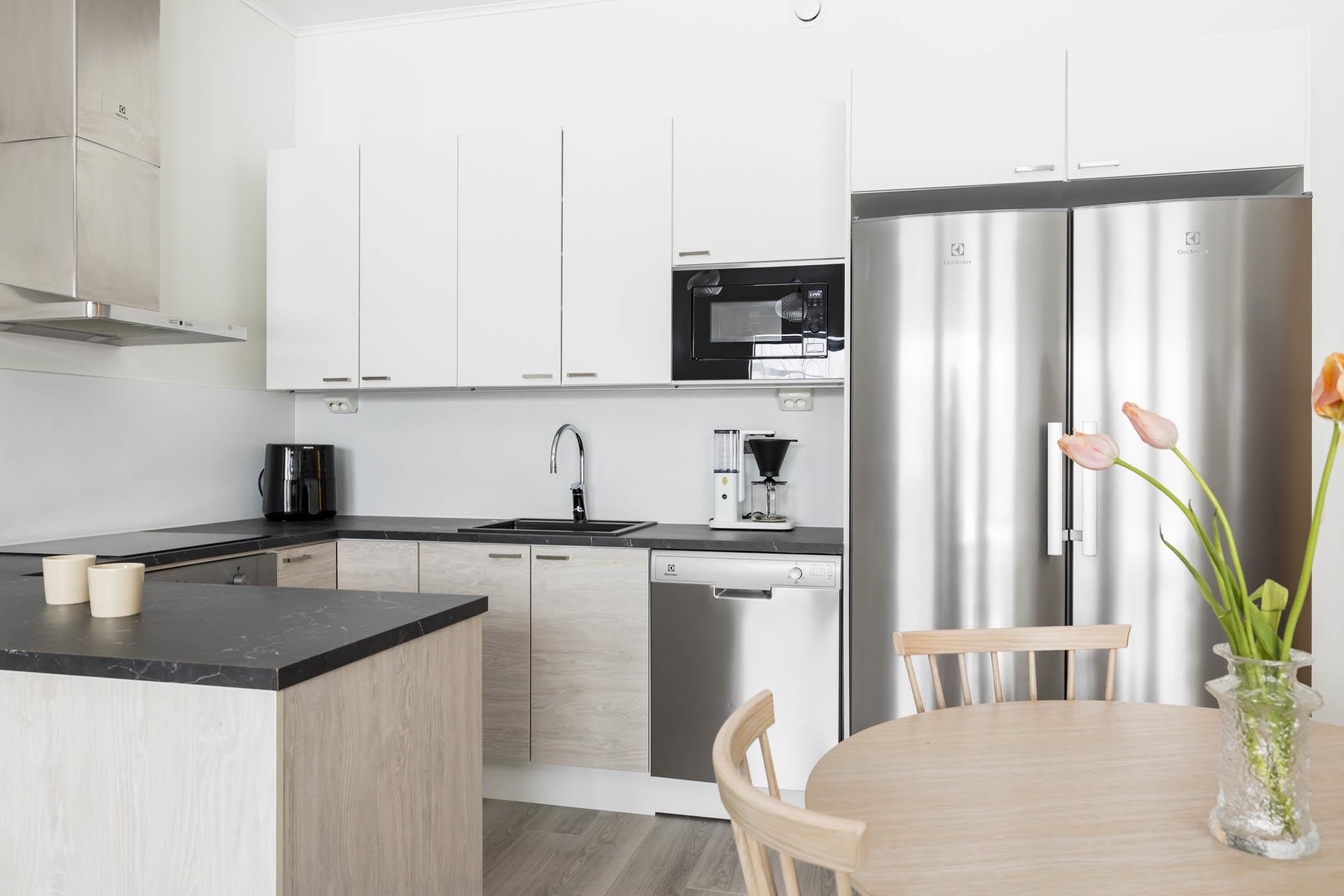 - Keittiössä jääkaappi, pakastekaappi, erillisuuni, induktioliesi, liesituuletin, integroitu mikroaaltouuni, astianpesukone, sekä kiinteät valaisimet välitilassa ja katossa.