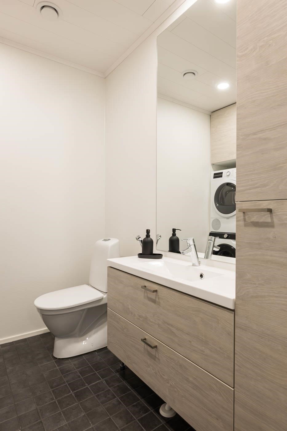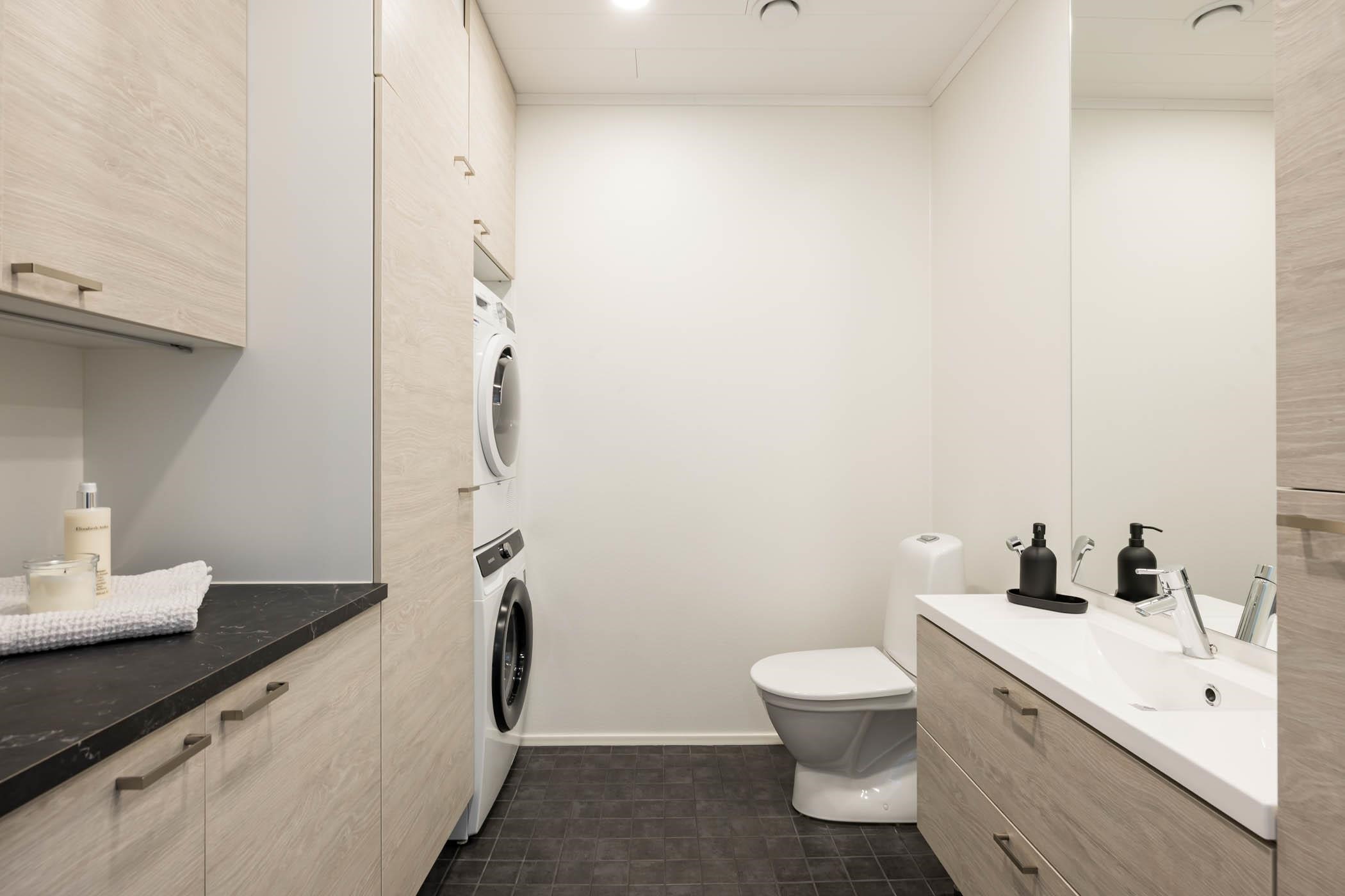 - Saunassa sähkökiuas, Kylpyhuoneessa, suihku, pesukoneliitäntä, vesikiertoinen lattialämmitys ja kiinteät valaisimet Erillisessä WC:ssä peilit, allaskaappi, vesikiertoinen lattialämmitys ja kiinteät valaisimet