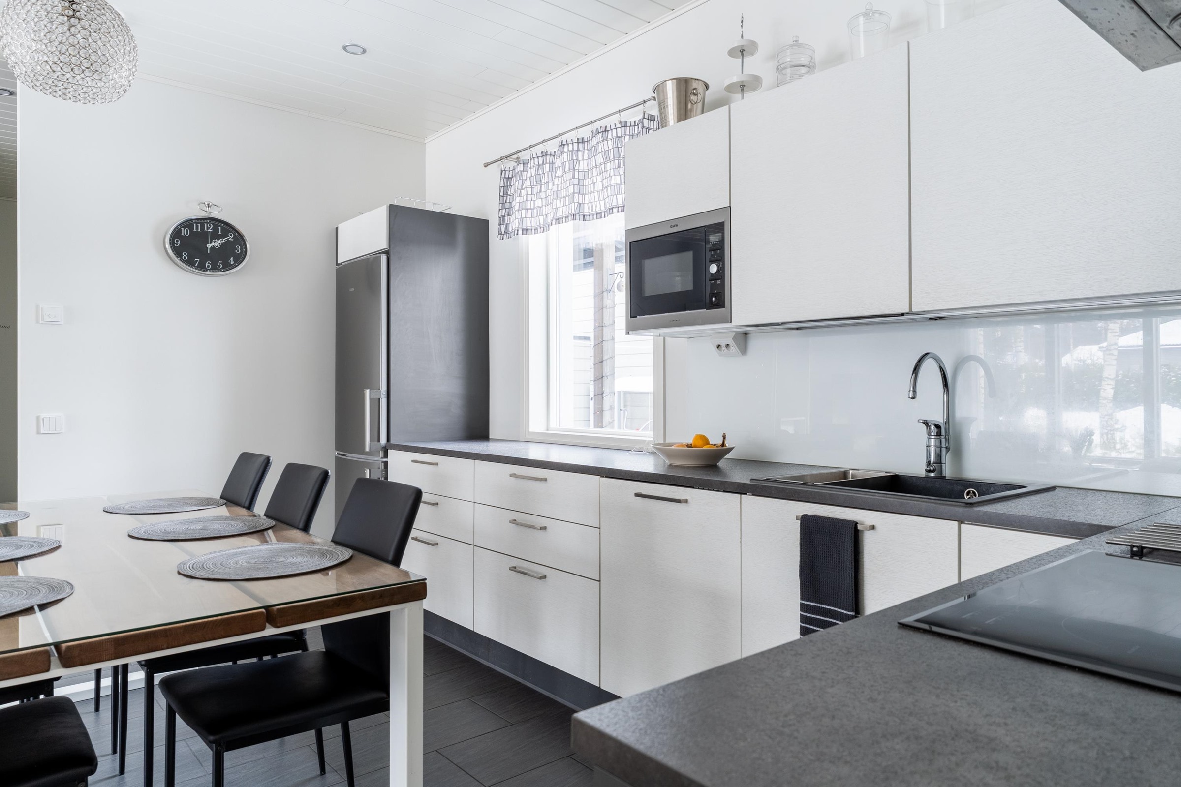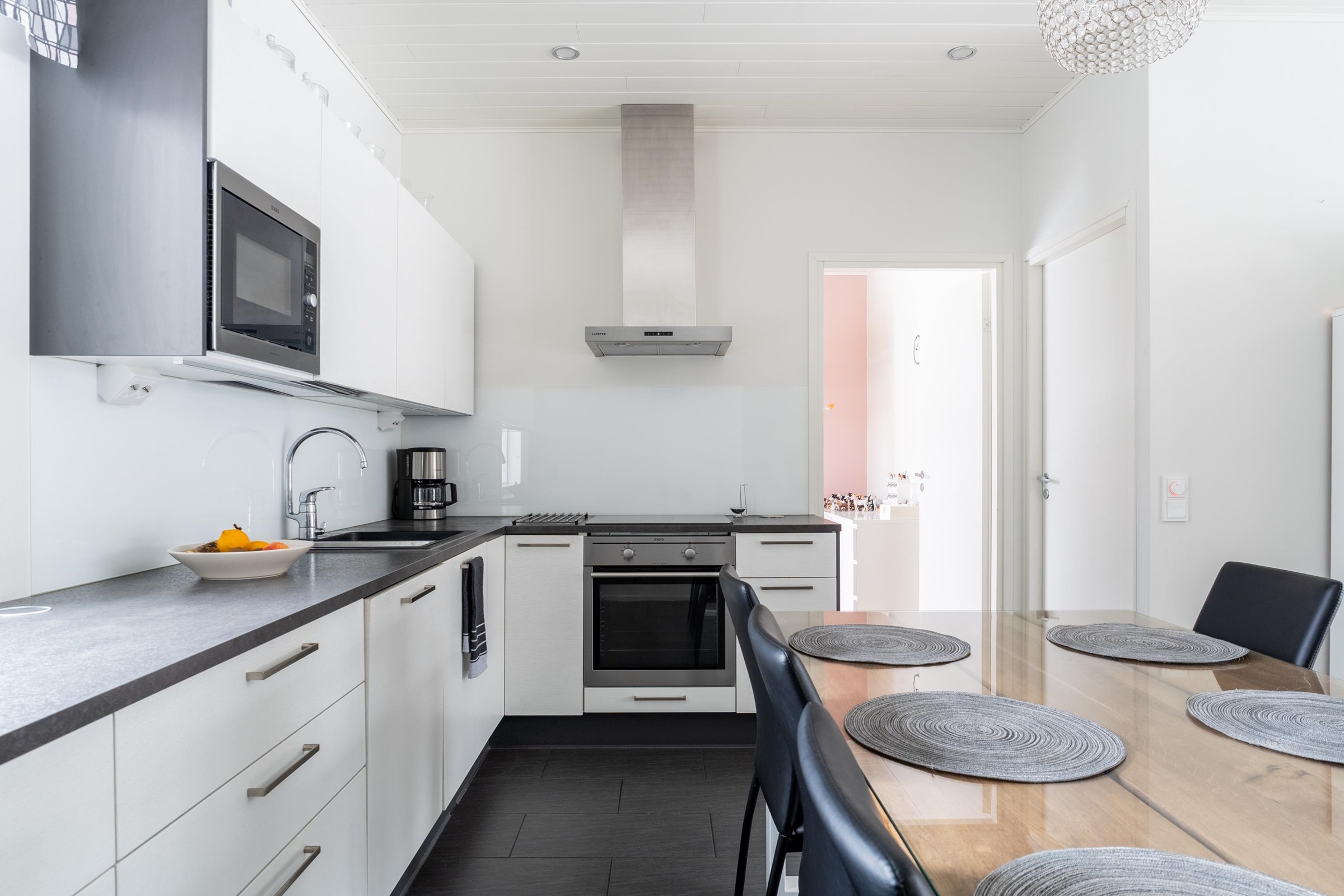 - Jääkaappipakastin AEG, erillisuuni AEG, induktioliesi AEG, liesituuletin Lapetek, mikroaaltouuni Integroitu AEG, astianpesukone Integroitu AEG, kaapistot Puustelli, kiinteät valaisimet, pöytätasojen materiaali Laminaatti.