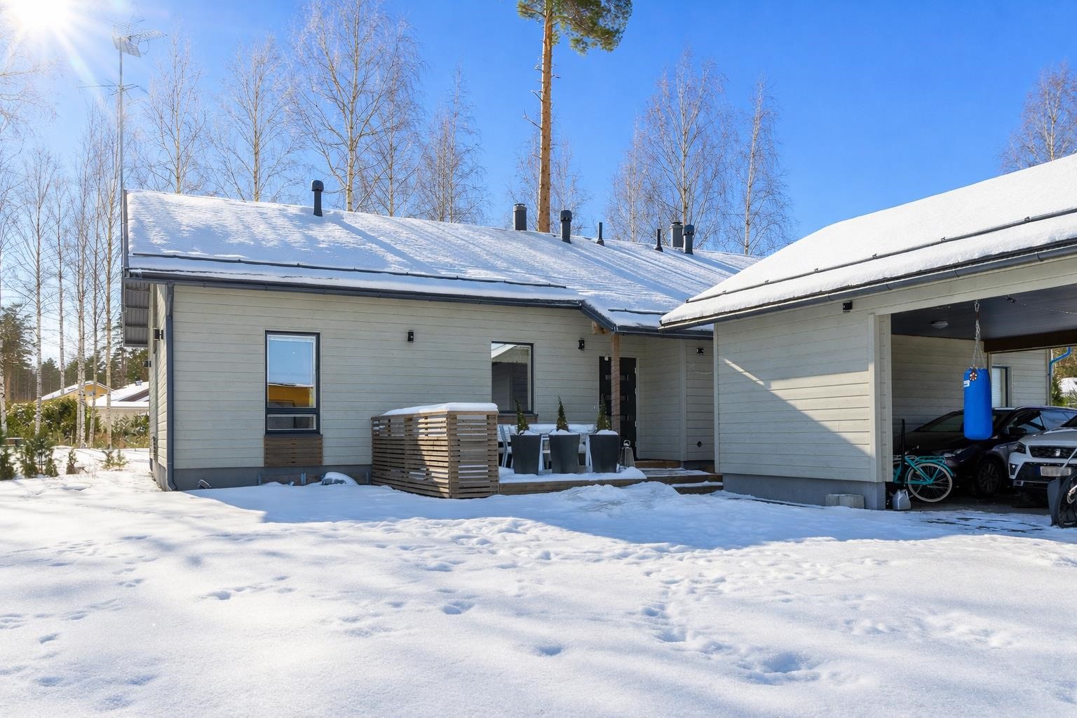 Asuntoon kuuluu autokatos, joka tuo arkeen mukavuutta ja suojaa ajoneuvoa ympäri vuoden.