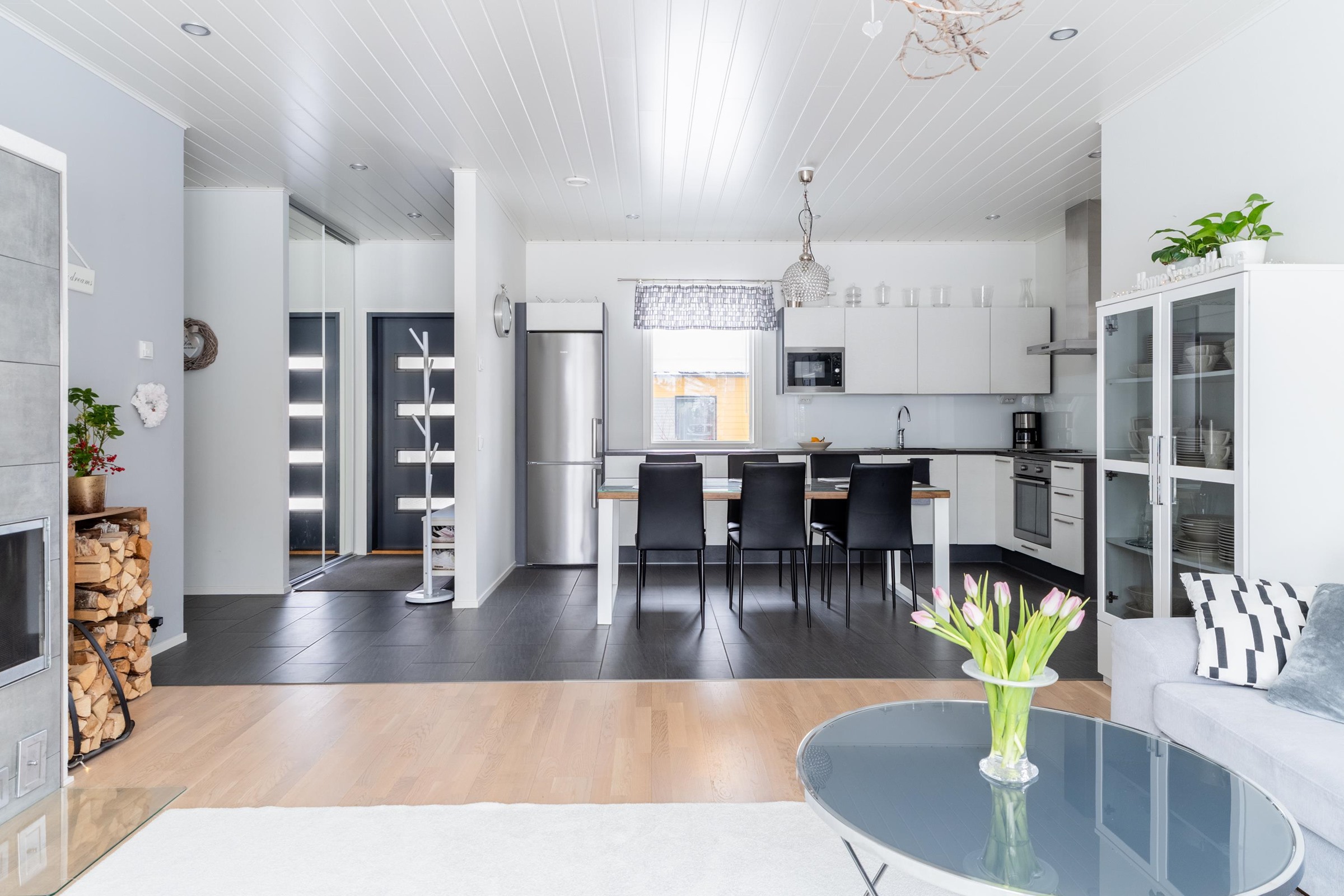 Tämä koti tarjoaa toimivan pohjaratkaisun, laadukkaat materiaalit sekä helppoa arkea yhdessä tasossa. Valoisa ja avara oleskelutila yhdistyy luontevasti keittiöön, luoden viihtyisän kokonaisuuden niin arkeen kuin juhlaan. Kolme makuuhuonetta tarjoaa mukavasti tilaa perheelle, työskentelyyn tai harrastuksille. Selkeä ja käytännöllinen pohjaratkaisu tekee asumisesta sujuvaa ja miellyttävää.