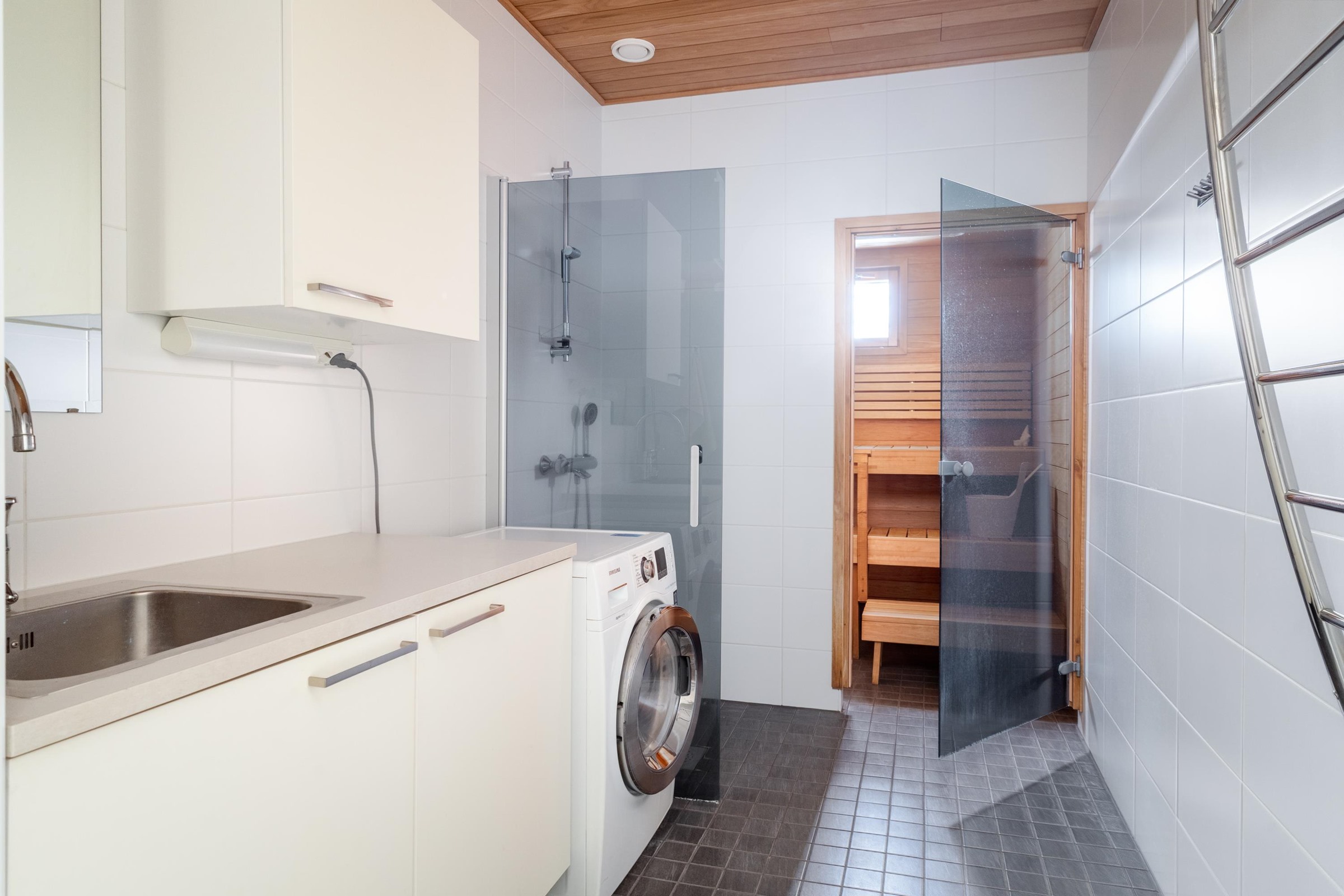 - Sauna, sähkökiuas, erillinen wc, suihku, suihkuseinä, peilit Pesuhuoneessa, peilikaappi WC:ssä, allaskaappi WC:ssä ja pesuhuoneessa, pesukoneliitäntä, lattialämmitys, kiinteät valaisimet. Pystykaappi WC:ssä, Bideesuihku . Kodinhoitotila pesuhuoneen yhteydessä. Pesuhuoneessa rättipatteri ja kaapistossa pyykkikori. seinäkaappi.