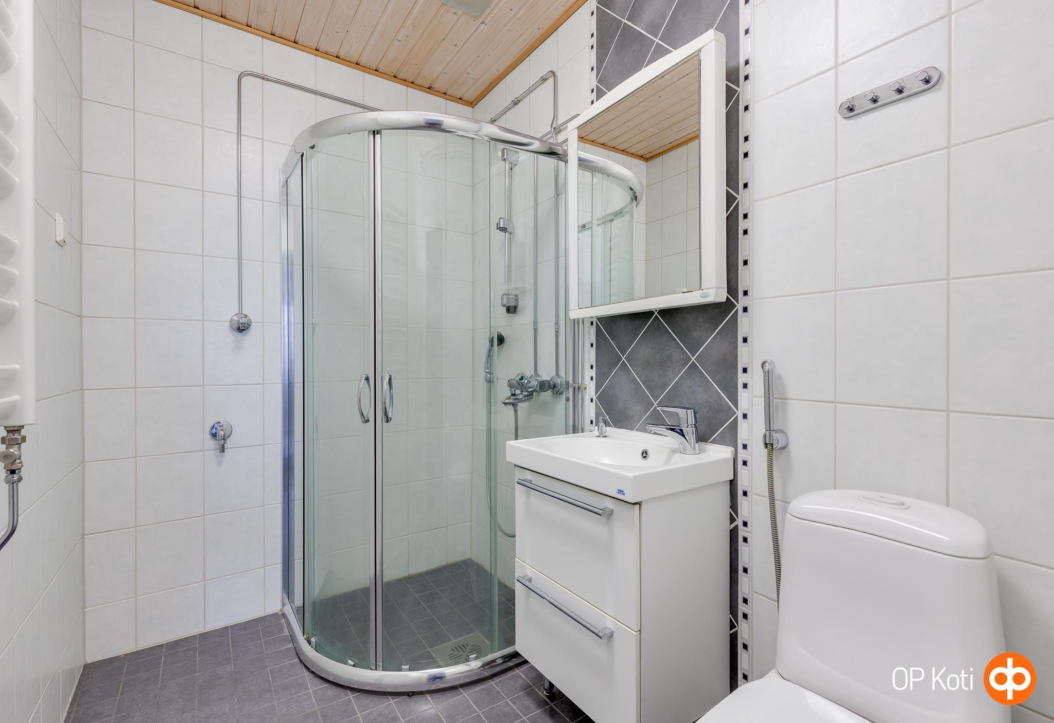 - Kylpyhuone, suihku, suihkuseinä, peilikaappi, allaskaappi, pesukoneliitäntä, lattialämmitys, kiinteät valaisimet.