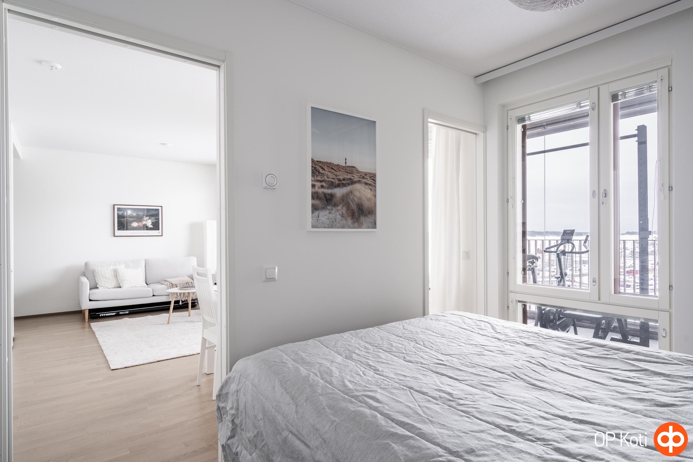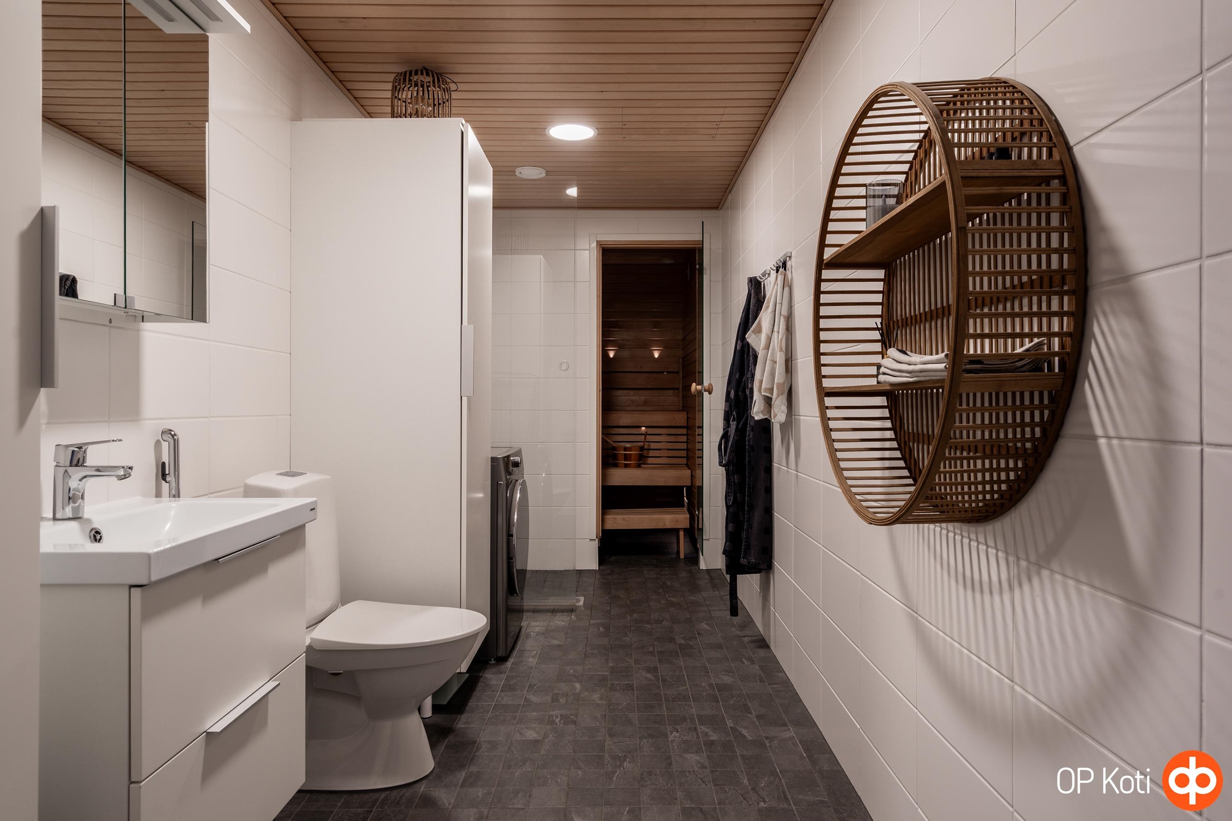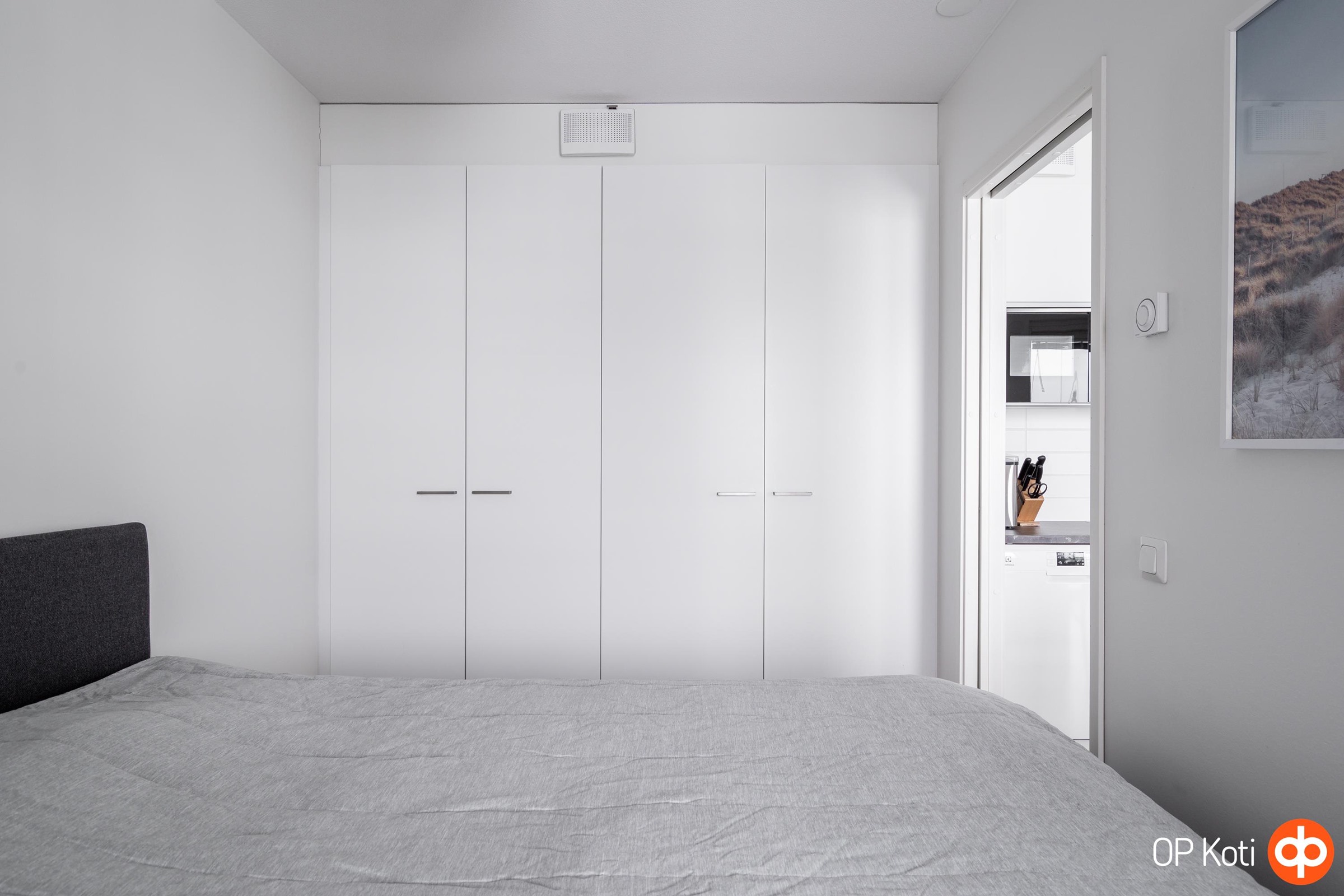 Kompaktissa makuuhuoneessa on liukuovet sekä koko seinän leveydeltä vaatekaapistoja. Kokonaan laatoitetun kylpyhuoneen lattiassa on ihana mukavuuslattialämmitys, reilusti säilytystilaa sekä hyvät tilat myös pyykkihuollolle. Oman saunan lämmöstä nautit niin usein kuin haluat.