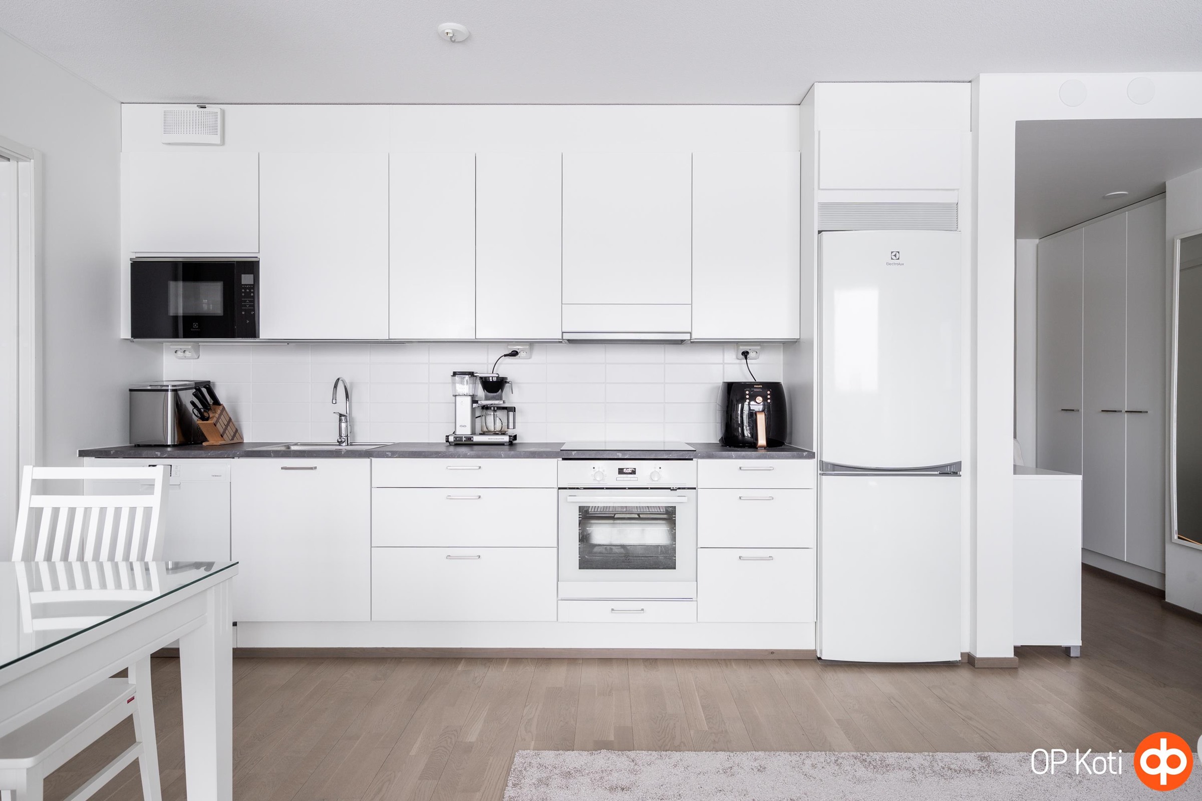 - Jääkaappipakastin, erillisuuni, liesitaso, induktioliesi, liesituuletin, mikroaaltouuni intergroitu, astianpesukone, irralliset kaapistot, kiinteät valaisimet keittiön välitilassa.