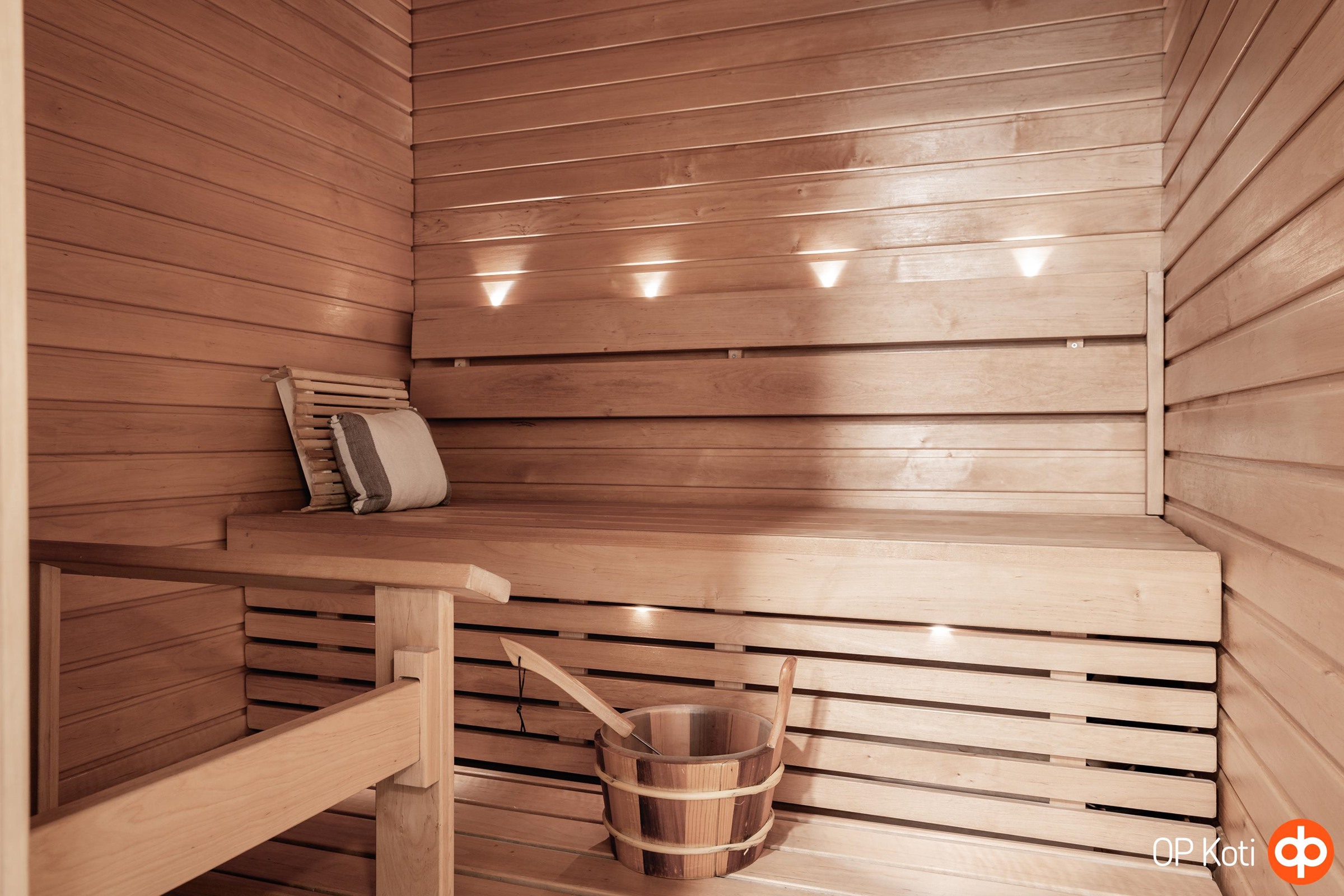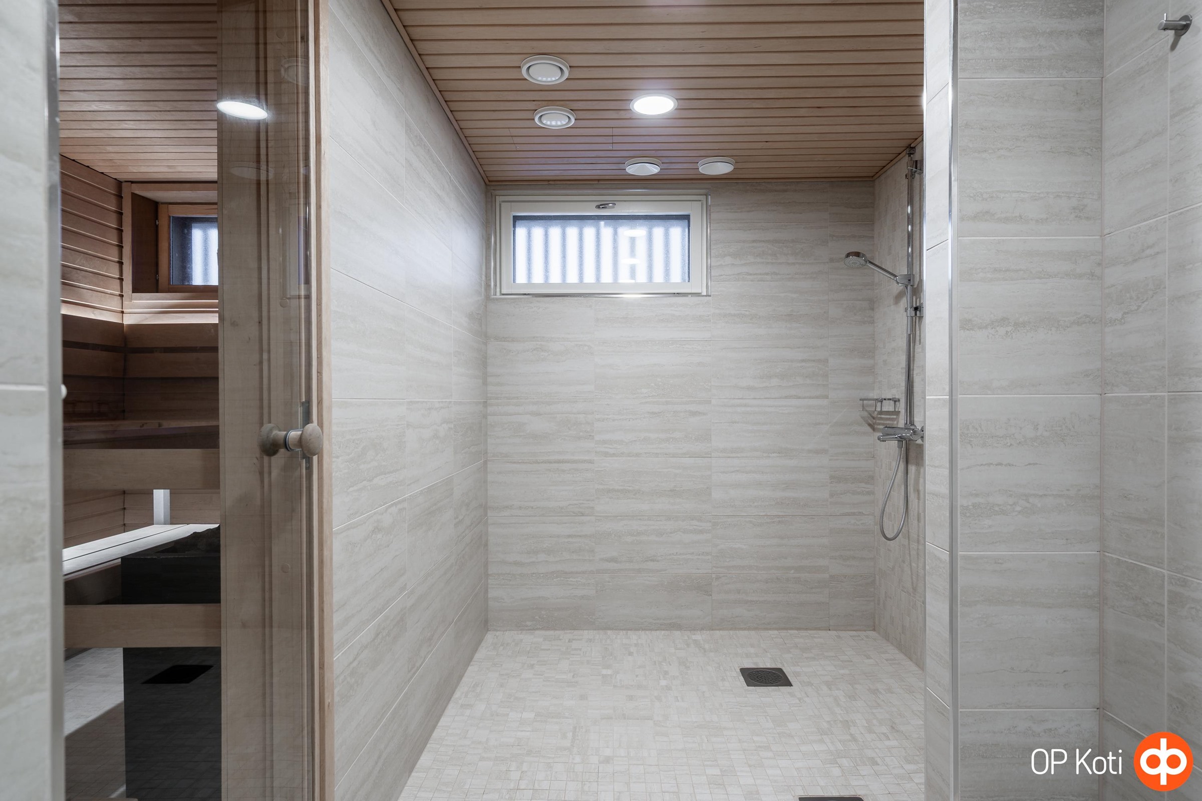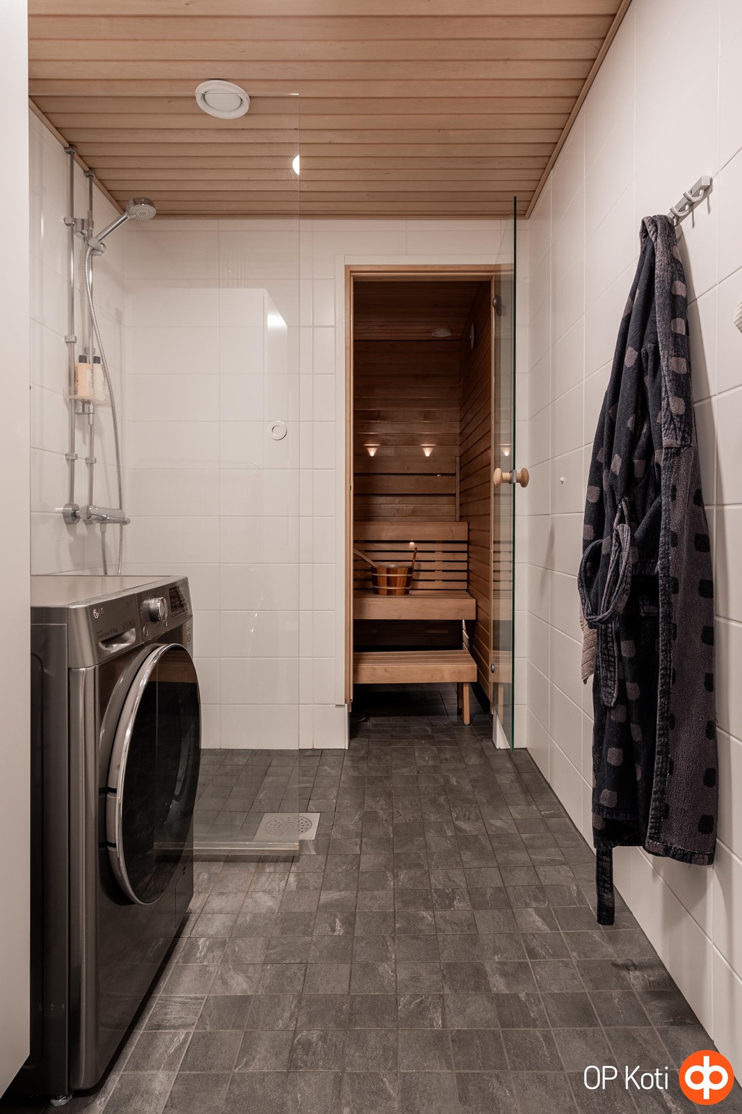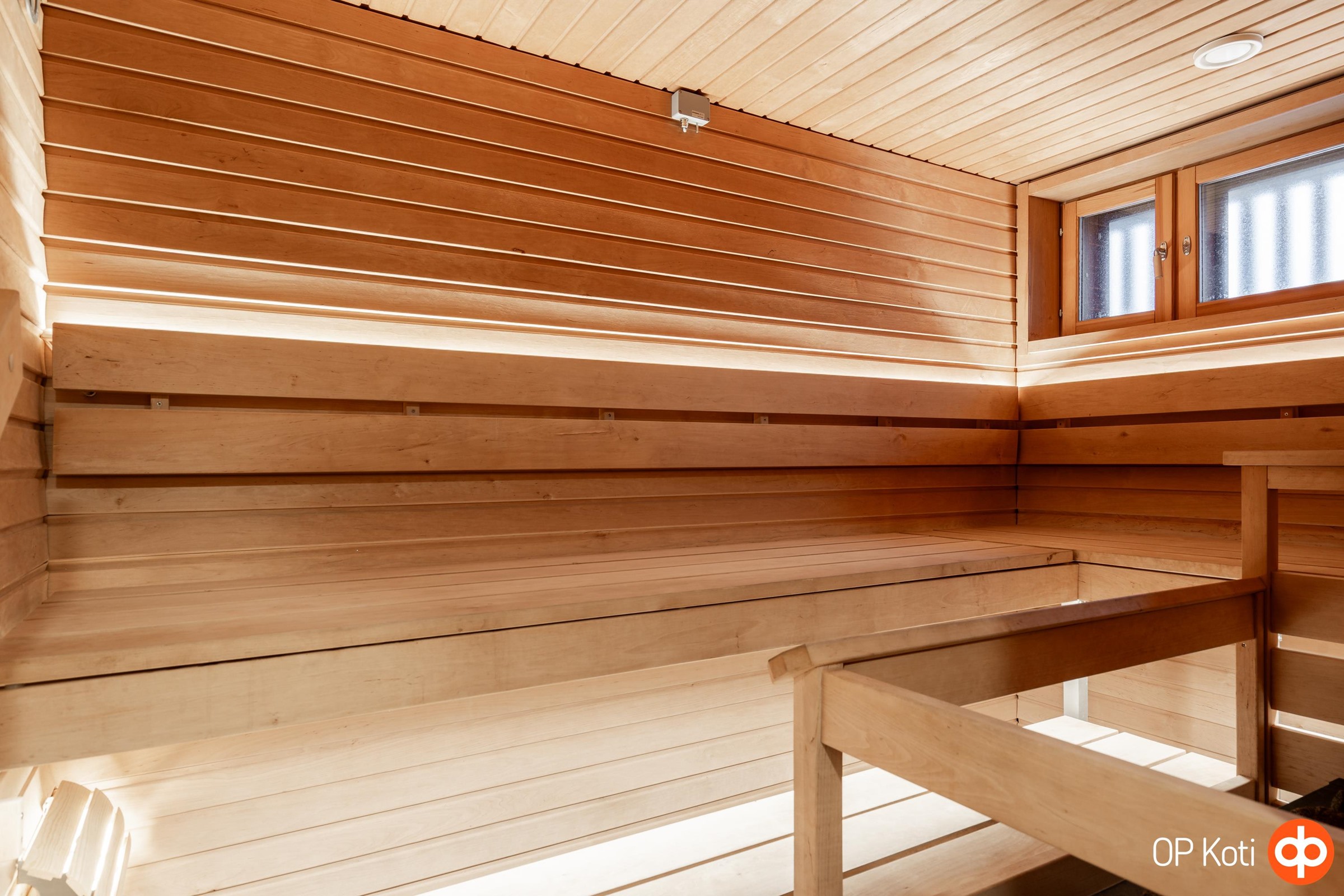 - Sauna, sähkökiuas, kylpyhuone, suihku, suihkuseinä, peilikaappi, kaapit, allaskaappi, pesukoneliitäntä, lattialämmitys, kiinteät valaisimet katossa ja saunassa led valot.