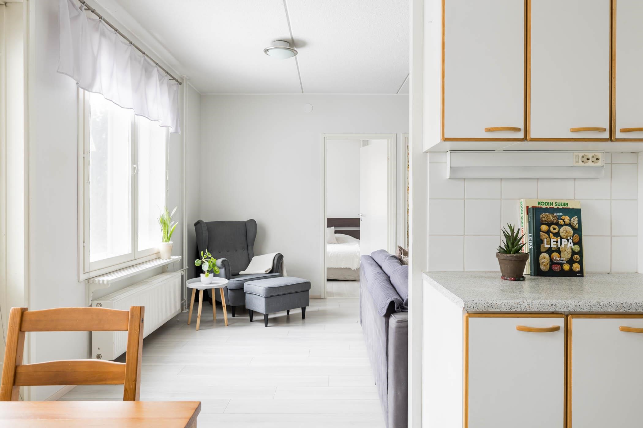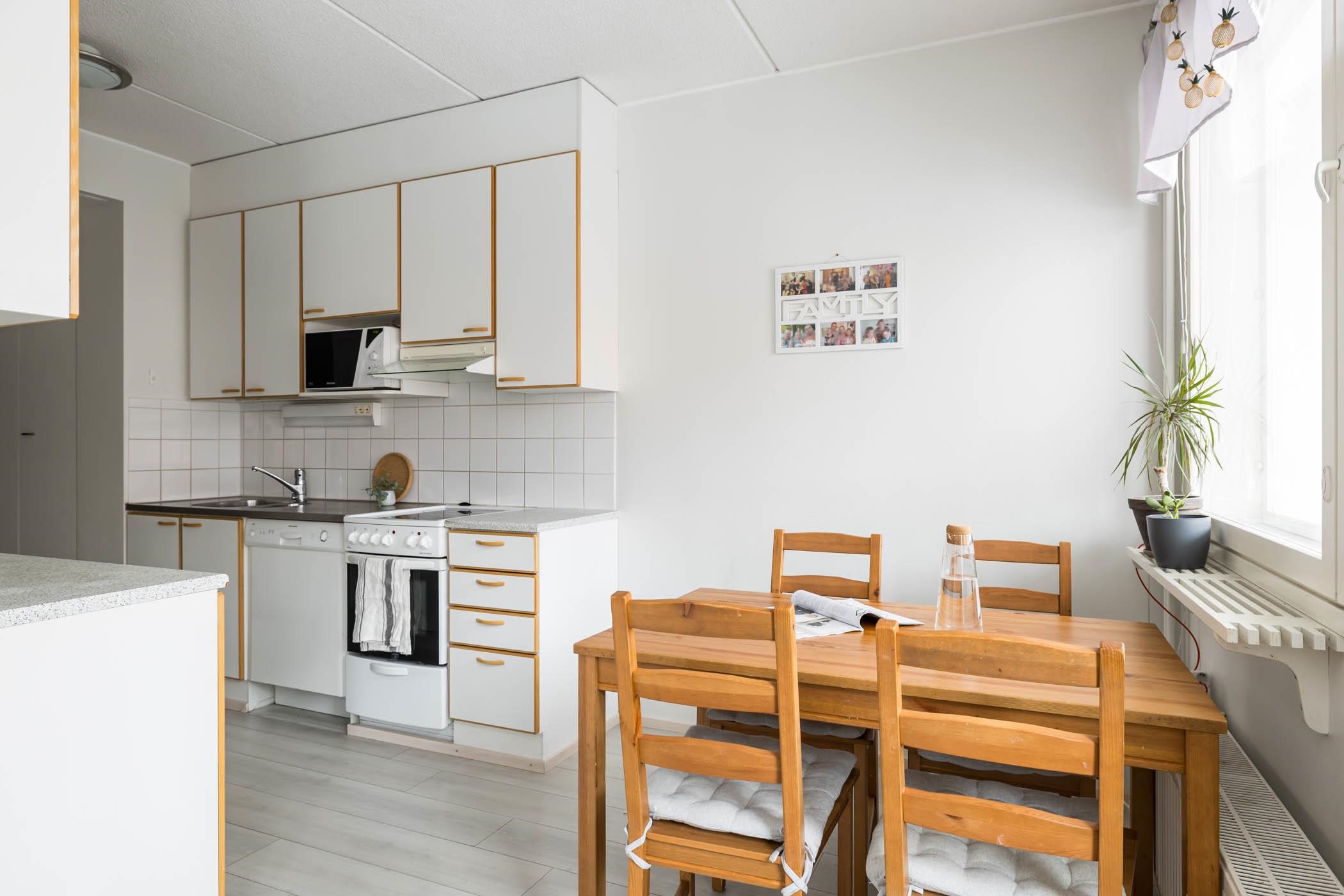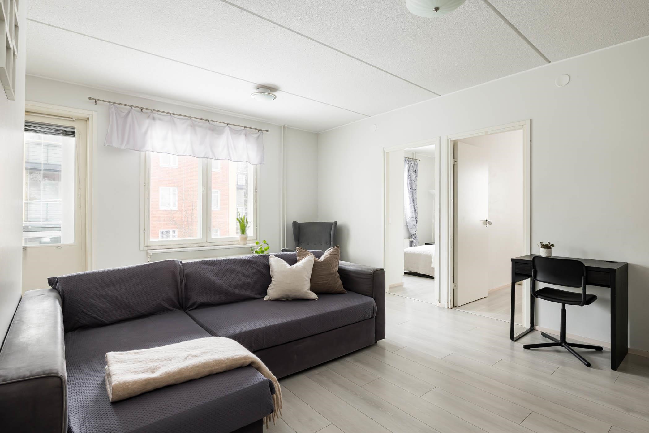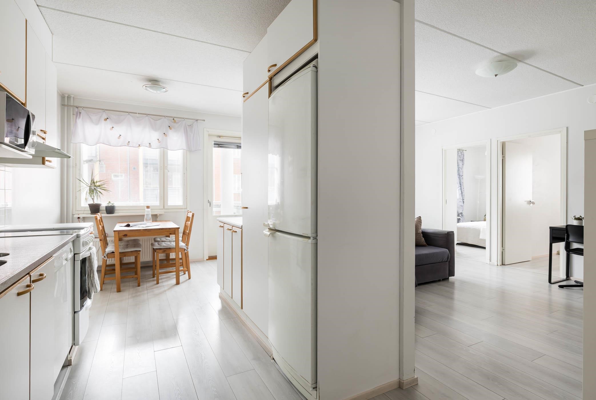 Asunnossa on kaksi makuuhuonetta, tilava olohuone sekä hyvin varusteltu keittiö, jossa arjen askareet sujuvat mutkattomasti. Keittiöstä löytyy jääkaappipakastin, keraaminen liesi, astianpesukone ja reilusti kaappitilaa. Koko huoneistossa on yhtenäinen laminaattilattia ja maalatut seinät. Kylpyhuone on laatoitettu ja siitä löytyy oma sauna, joka on täydellinen paikka rentoutumiseen. Säilytystilaa löytyy kellarista, ja huoneistossa on lisäksi sälekaihtimet.
