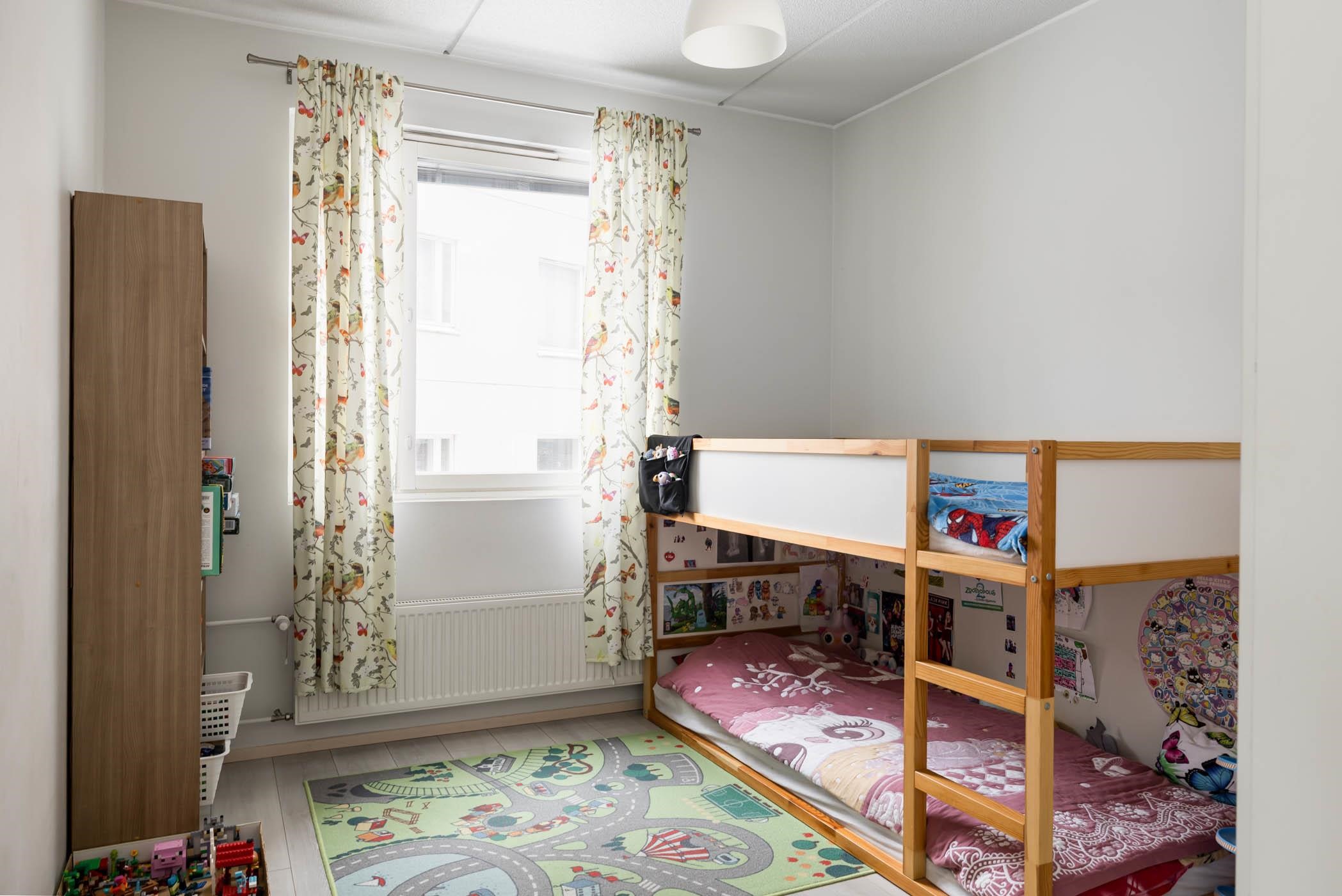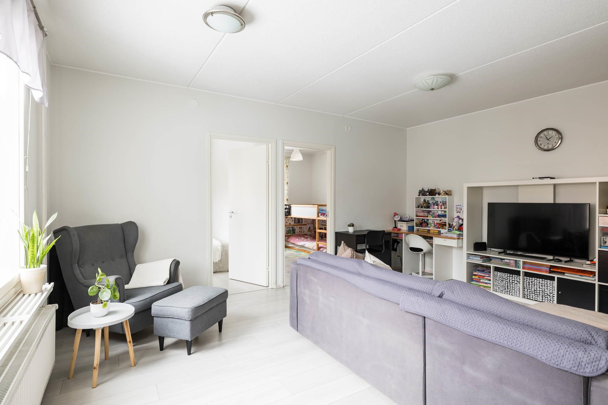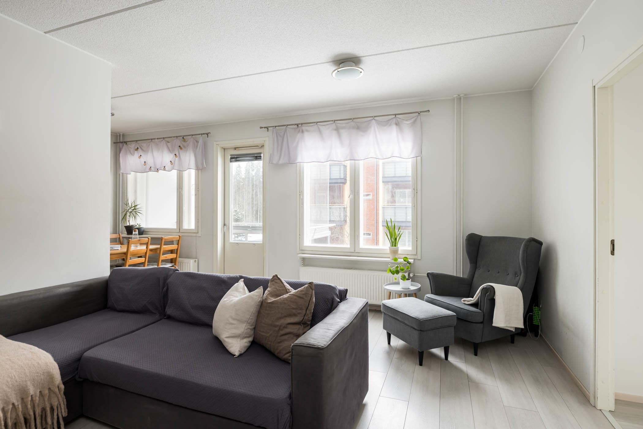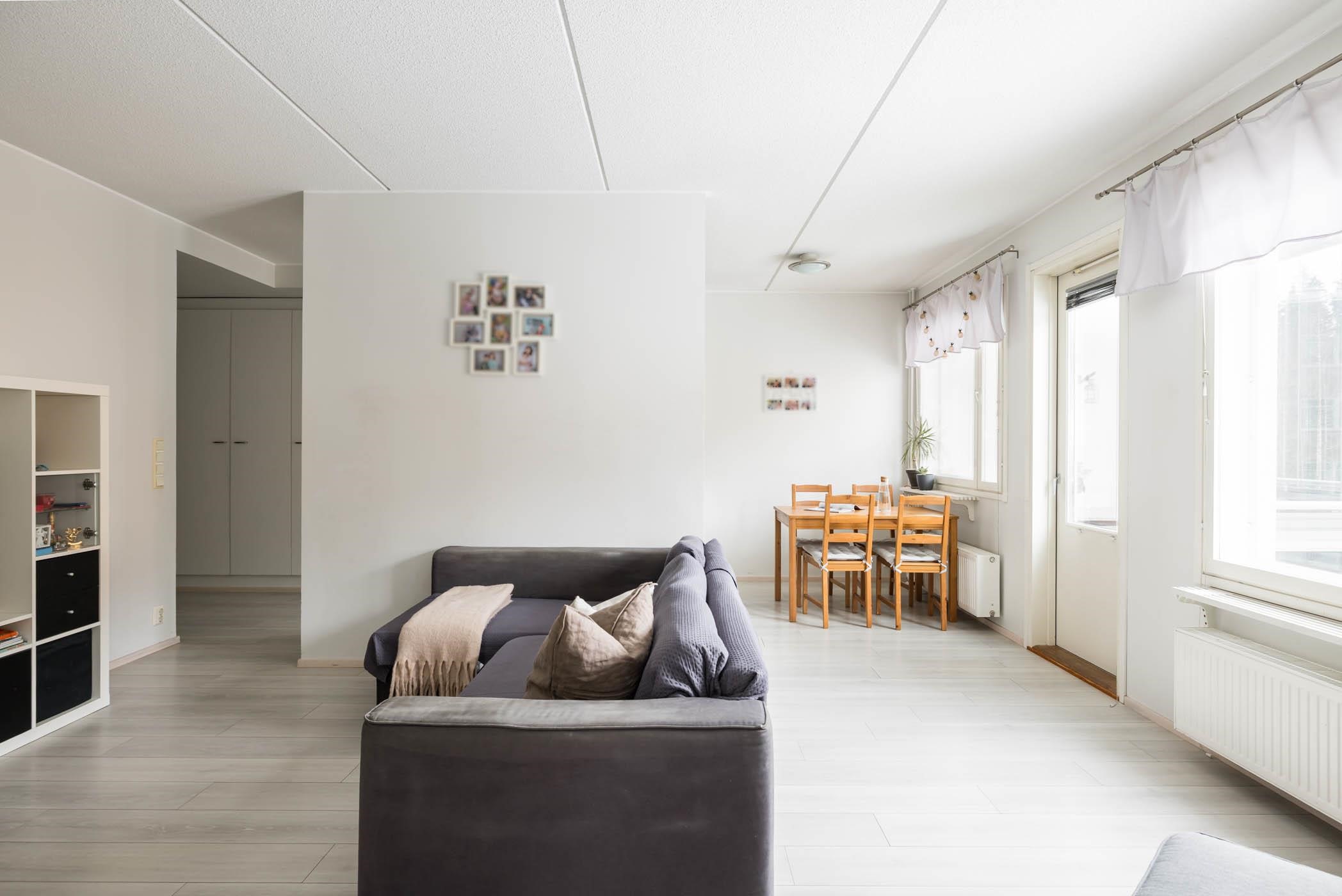 Asunnossa on kaksi makuuhuonetta, tilava olohuone sekä hyvin varusteltu keittiö, jossa arjen askareet sujuvat mutkattomasti. Keittiöstä löytyy jääkaappipakastin, keraaminen liesi, astianpesukone ja reilusti kaappitilaa. Koko huoneistossa on yhtenäinen laminaattilattia ja maalatut seinät. Kylpyhuone on laatoitettu ja siitä löytyy oma sauna, joka on täydellinen paikka rentoutumiseen. Säilytystilaa löytyy kellarista, ja huoneistossa on lisäksi sälekaihtimet.