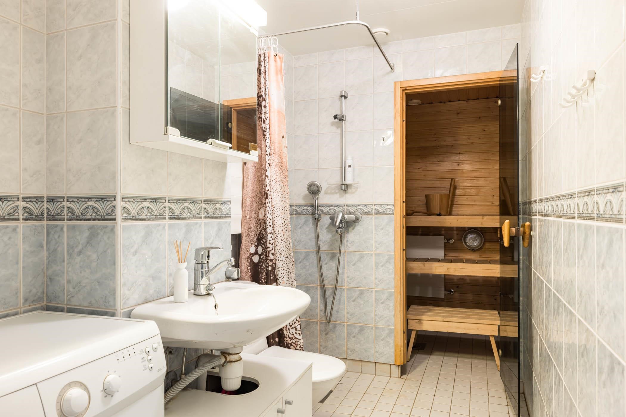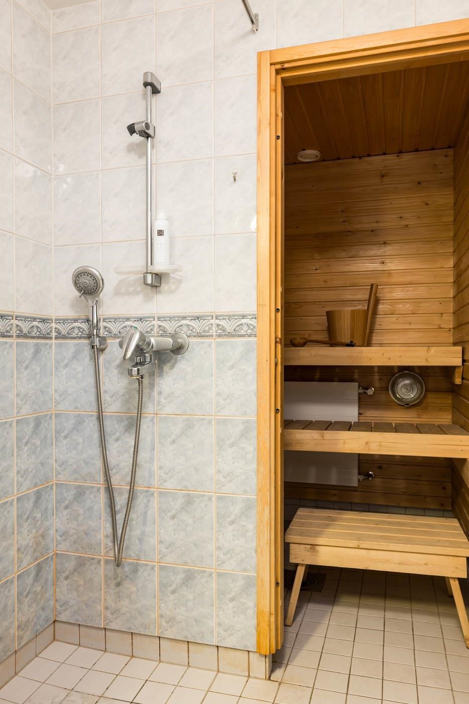 - Sauna, sähkökiuas, kylpyhuone, suihku, peilikaappi, allaskaappi, kiinteät valaisimet.
