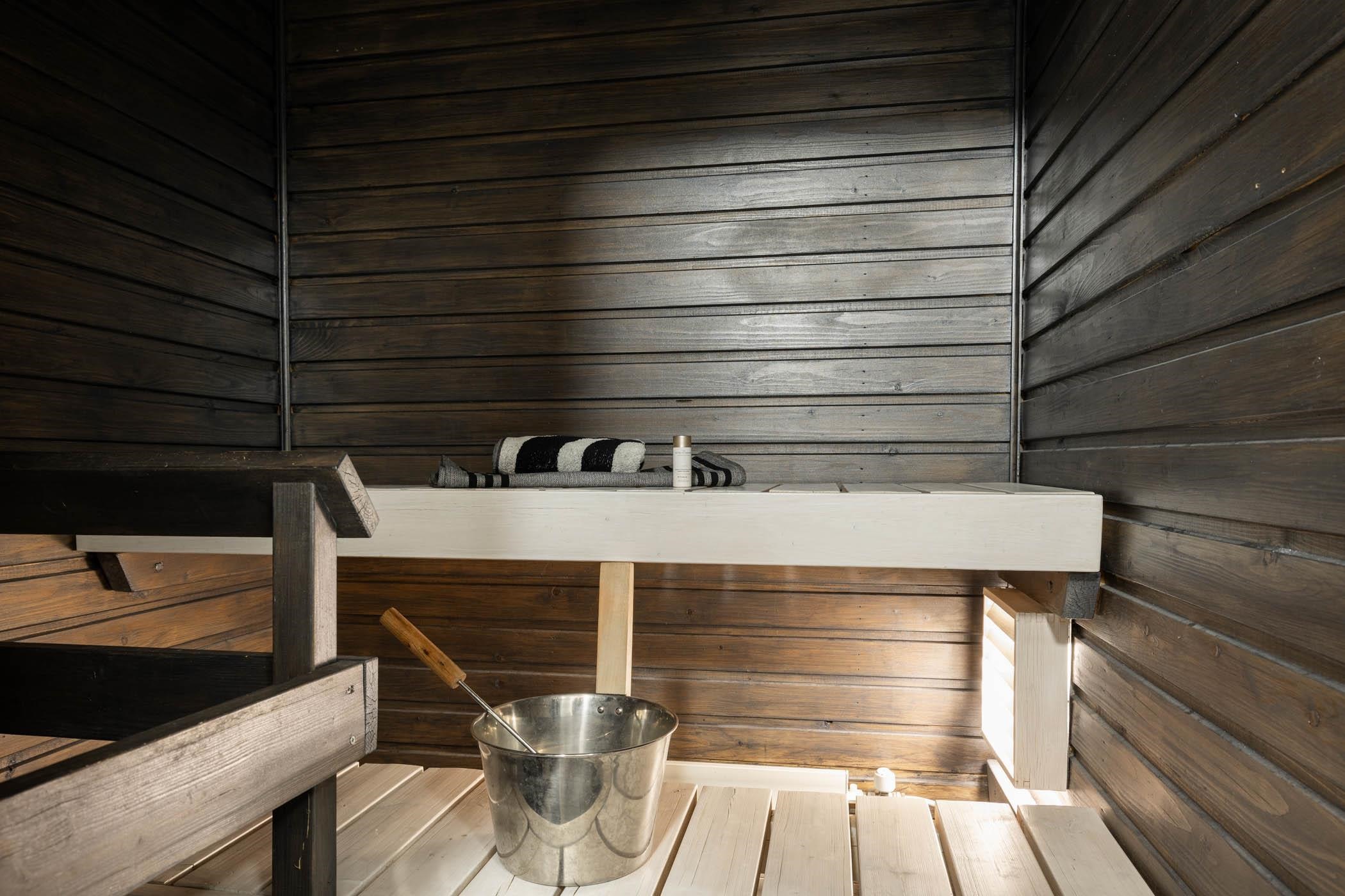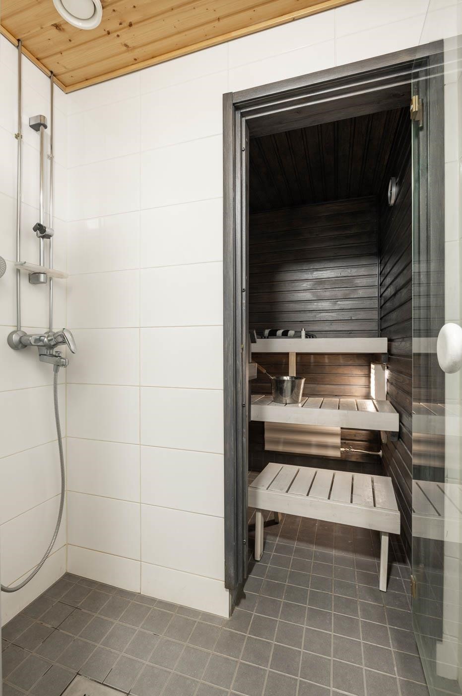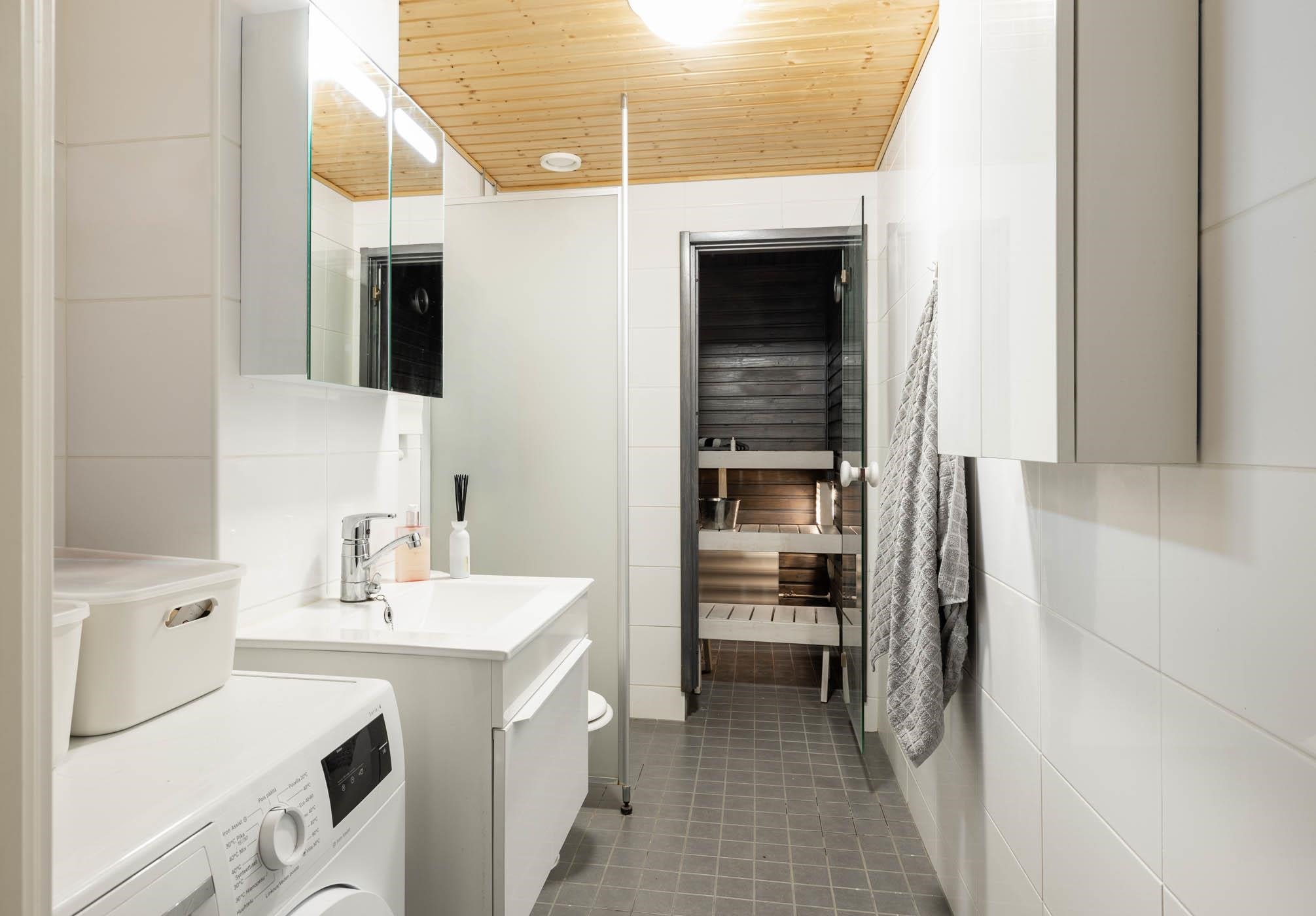 - Kylpyhuoneessa on suihku, suihkuseinä, pesukoneliitäntä, allaskaappi sekä peilikaappi. Saunassa on sähkökiuas.