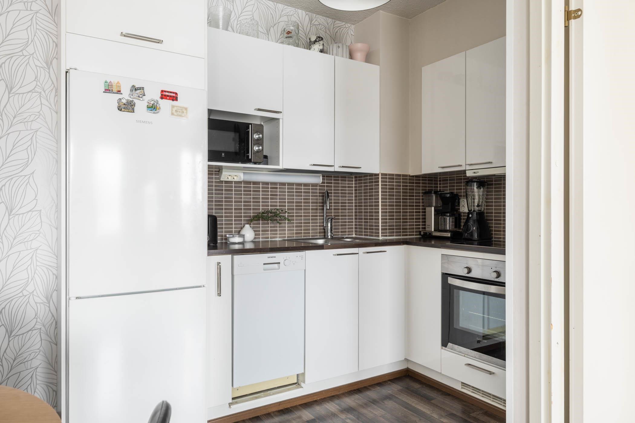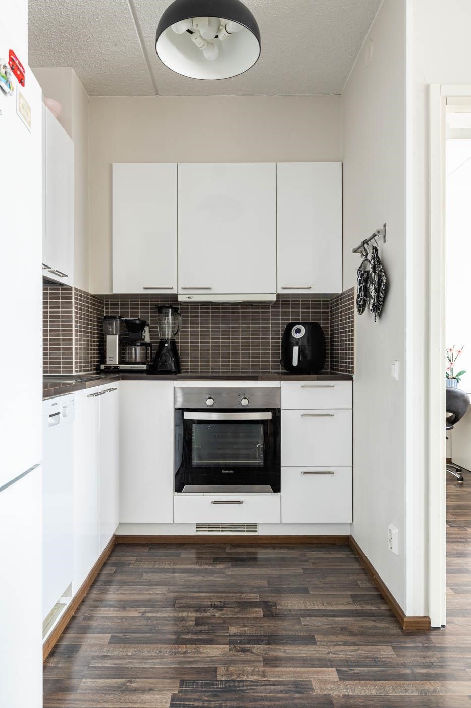 - Jääkaappipakastin, erillisuuni, liesitaso (keraaminen), liesituuletin (liesituulettimen moottoritoiminto ei ole käytössä), astianpesukone, kaapistot.