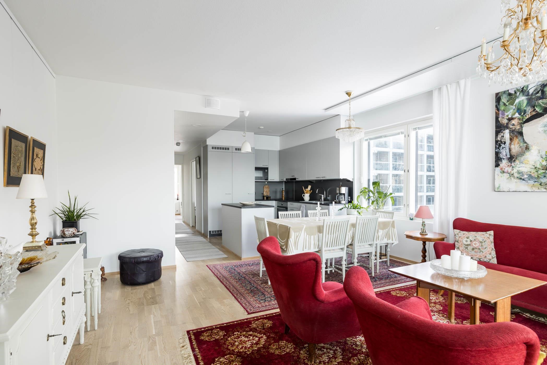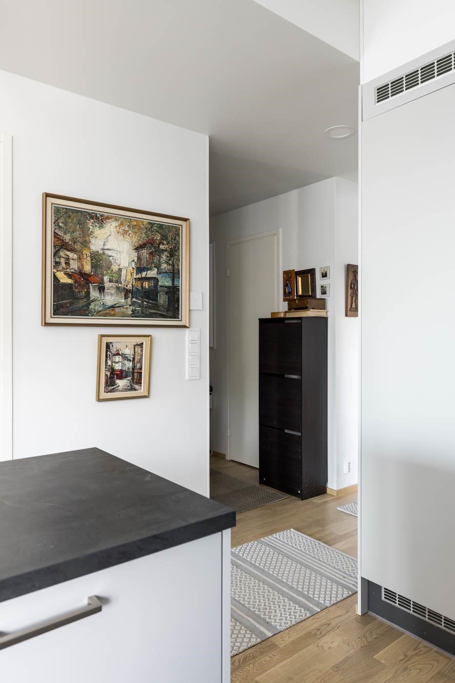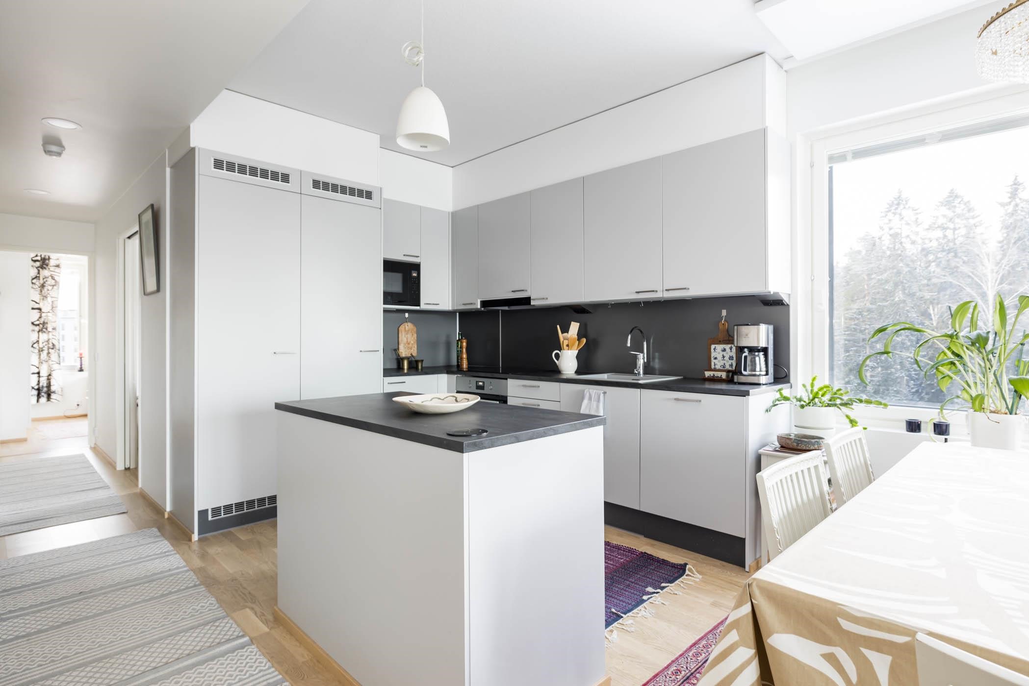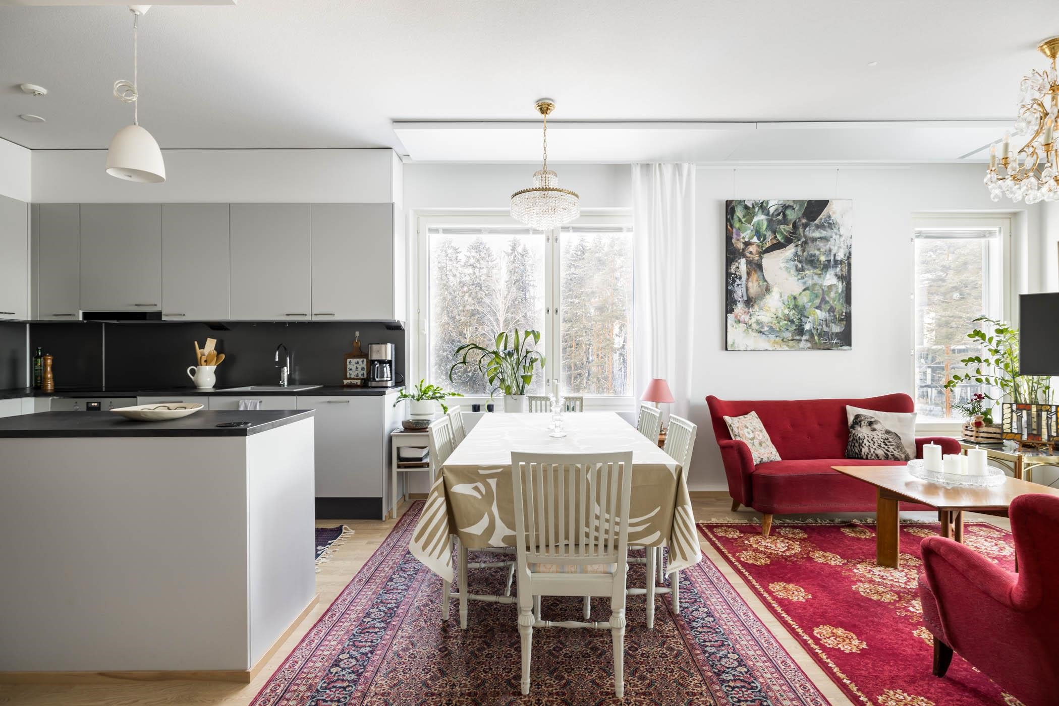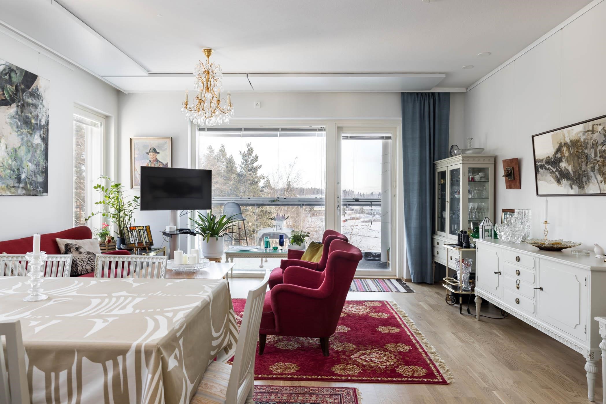 Kodissa avautuu ihastuttavan valoisa ja toimiva olohuonekeittiöyhdistelmä, jossa keskipisteenä toimii saareke eli kivasti lasku ja työskentelytilaa sekä väljyyttä oleskeluun ja yhdessäoloon.