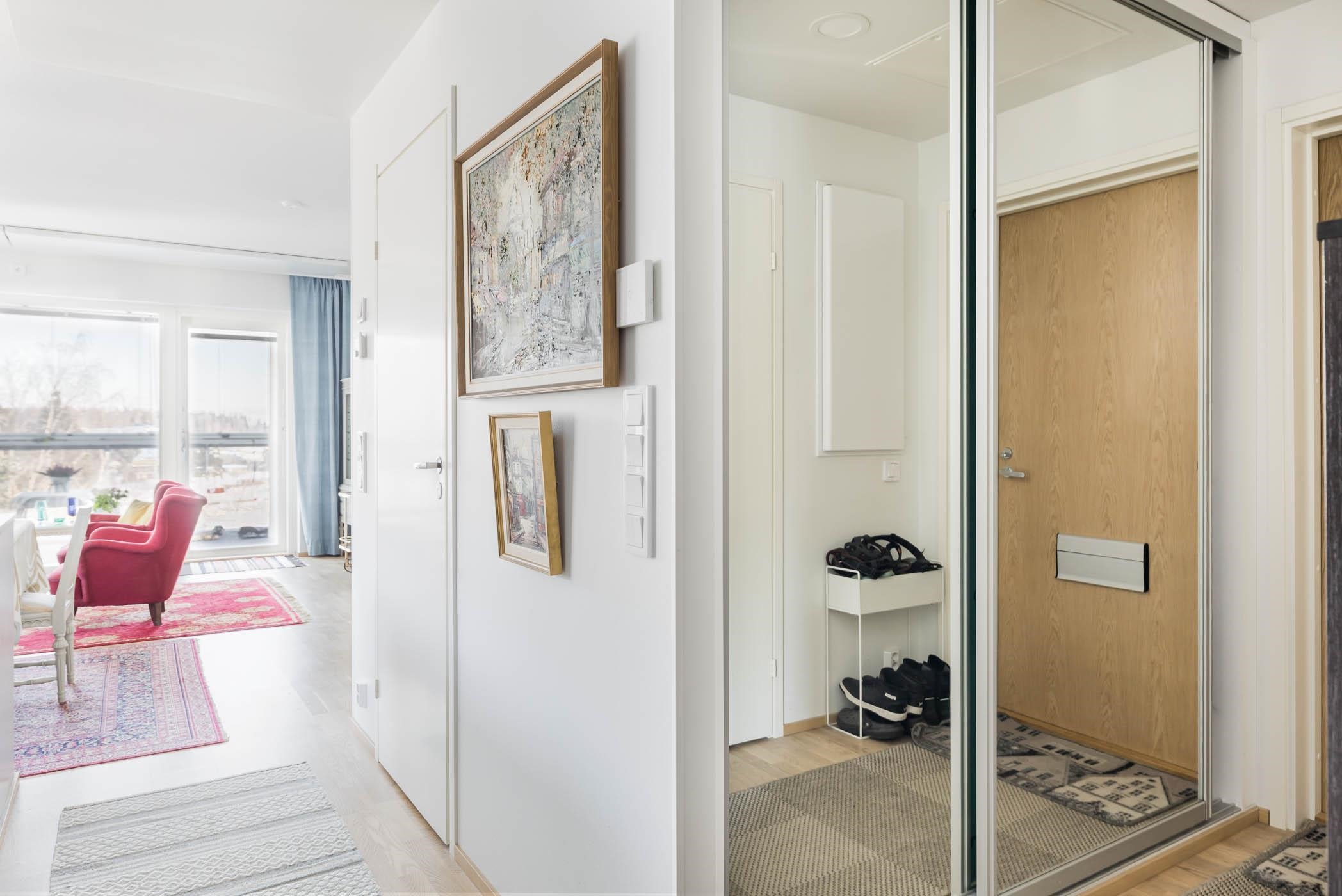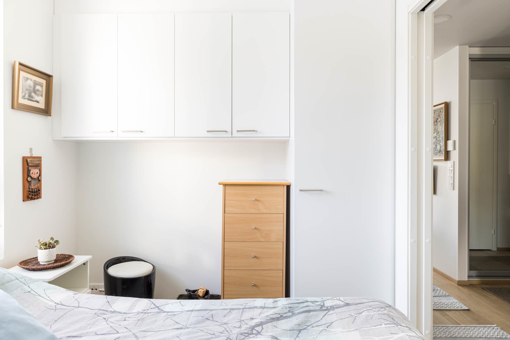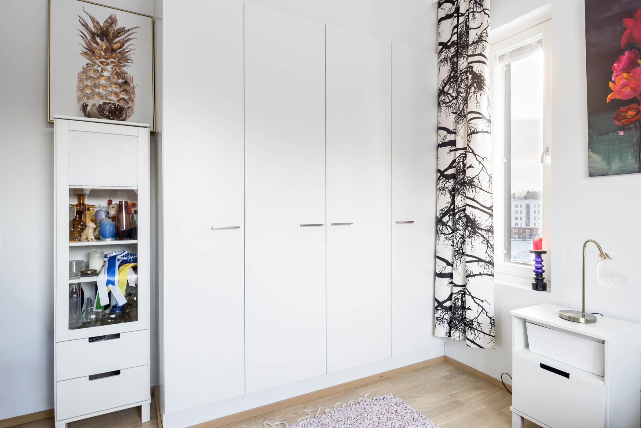 muutostöinä: liukuovet, kaappimuutos makuuhuoneessa, kaihtimet parvekkeelle.