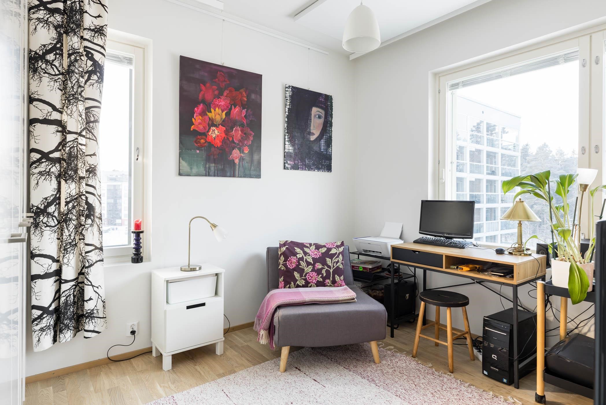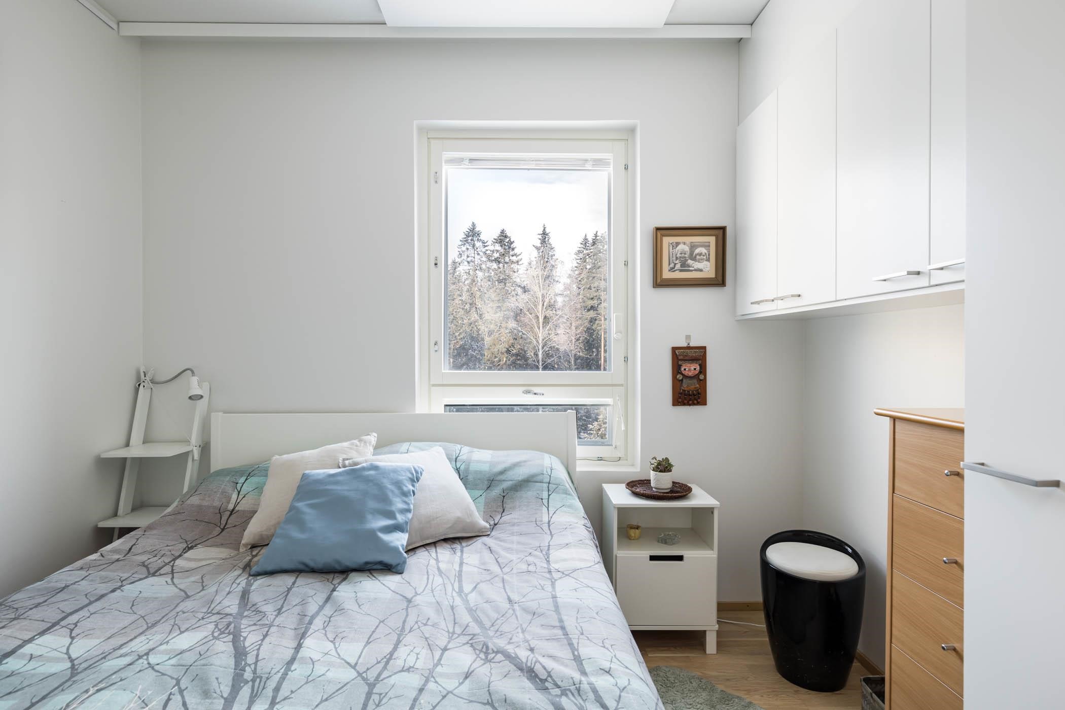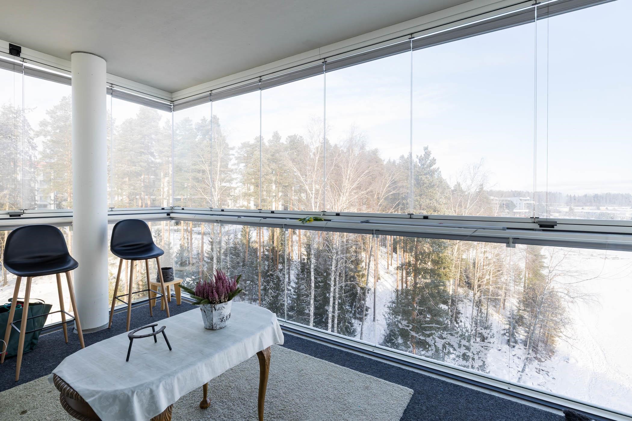 muutostöinä: liukuovet, kaappimuutos makuuhuoneessa, kaihtimet parvekkeelle.