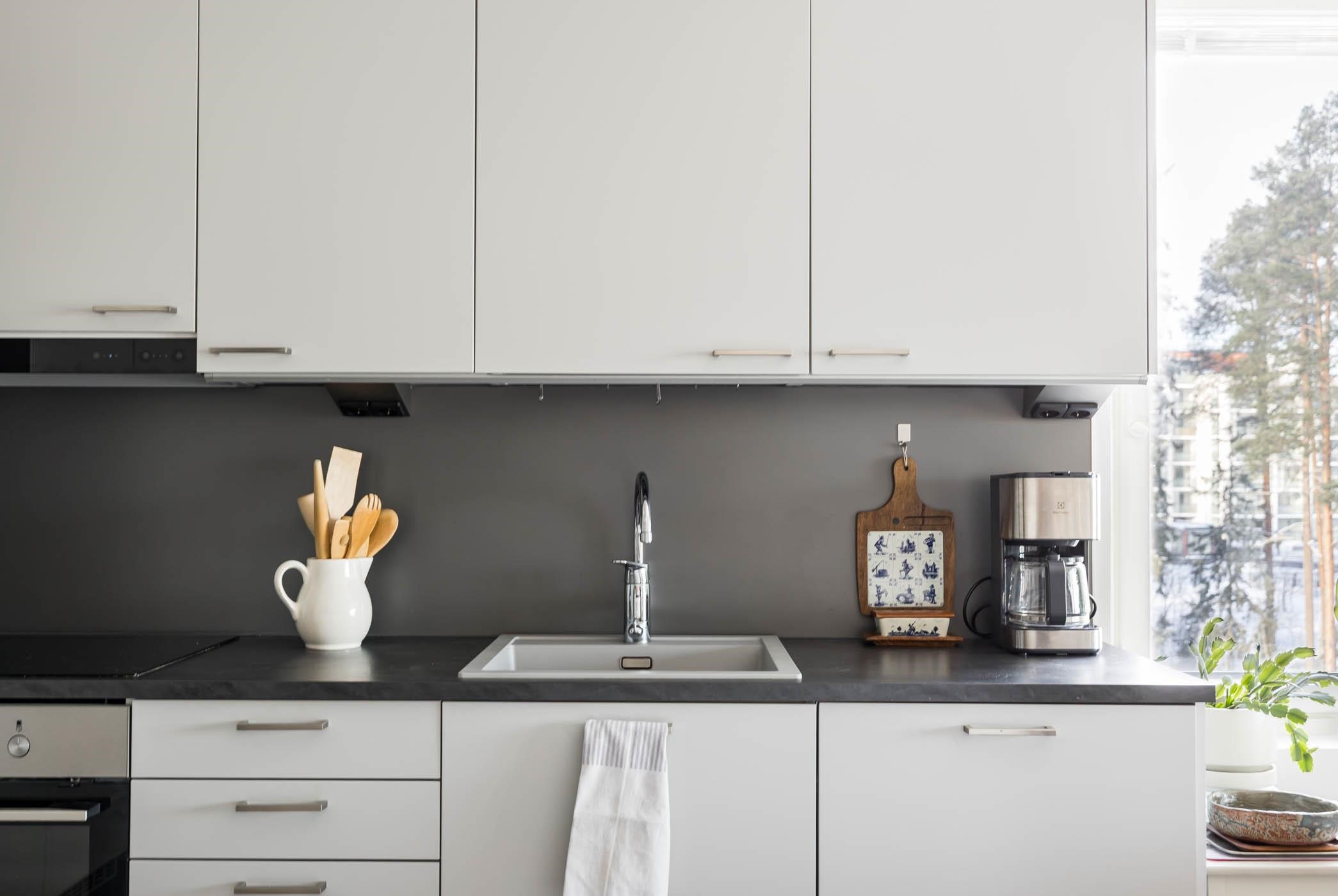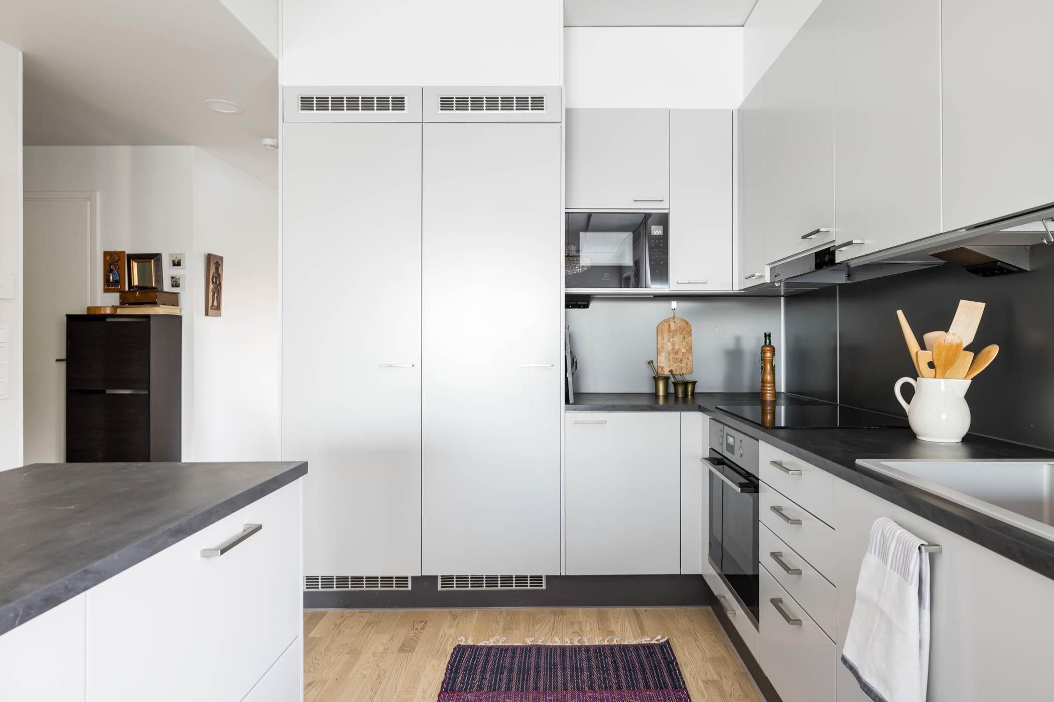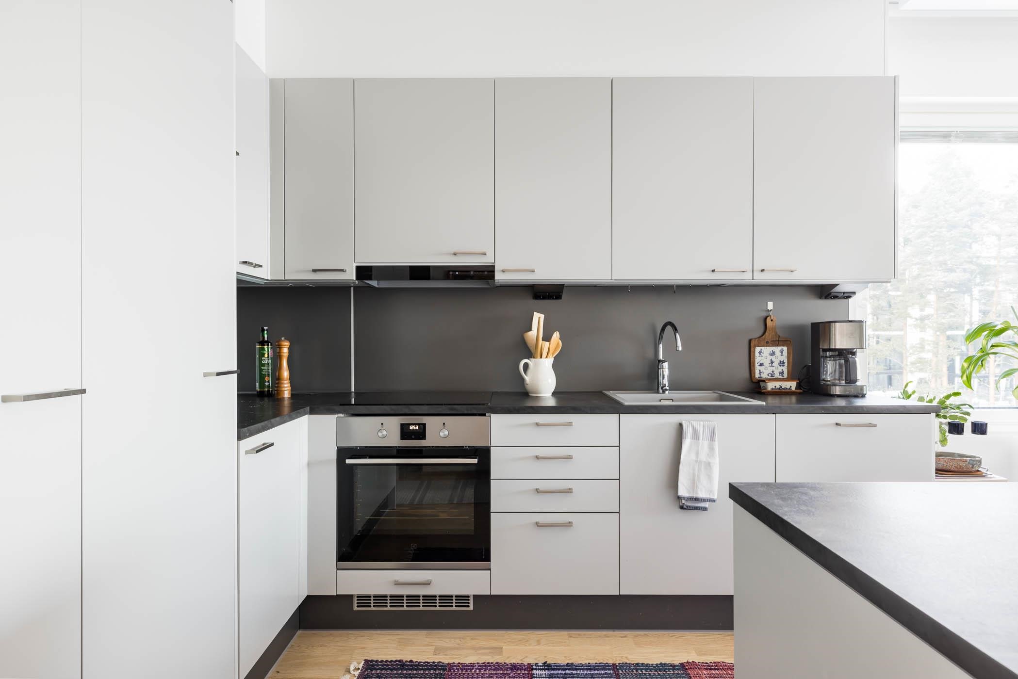 - Jääkaappi, pakastekaappi, erillisuuni, liesitaso induktio, liesituuletin, mikroaaltouuni, astianpesukone, kaapistot, kiinteät valaisimet.