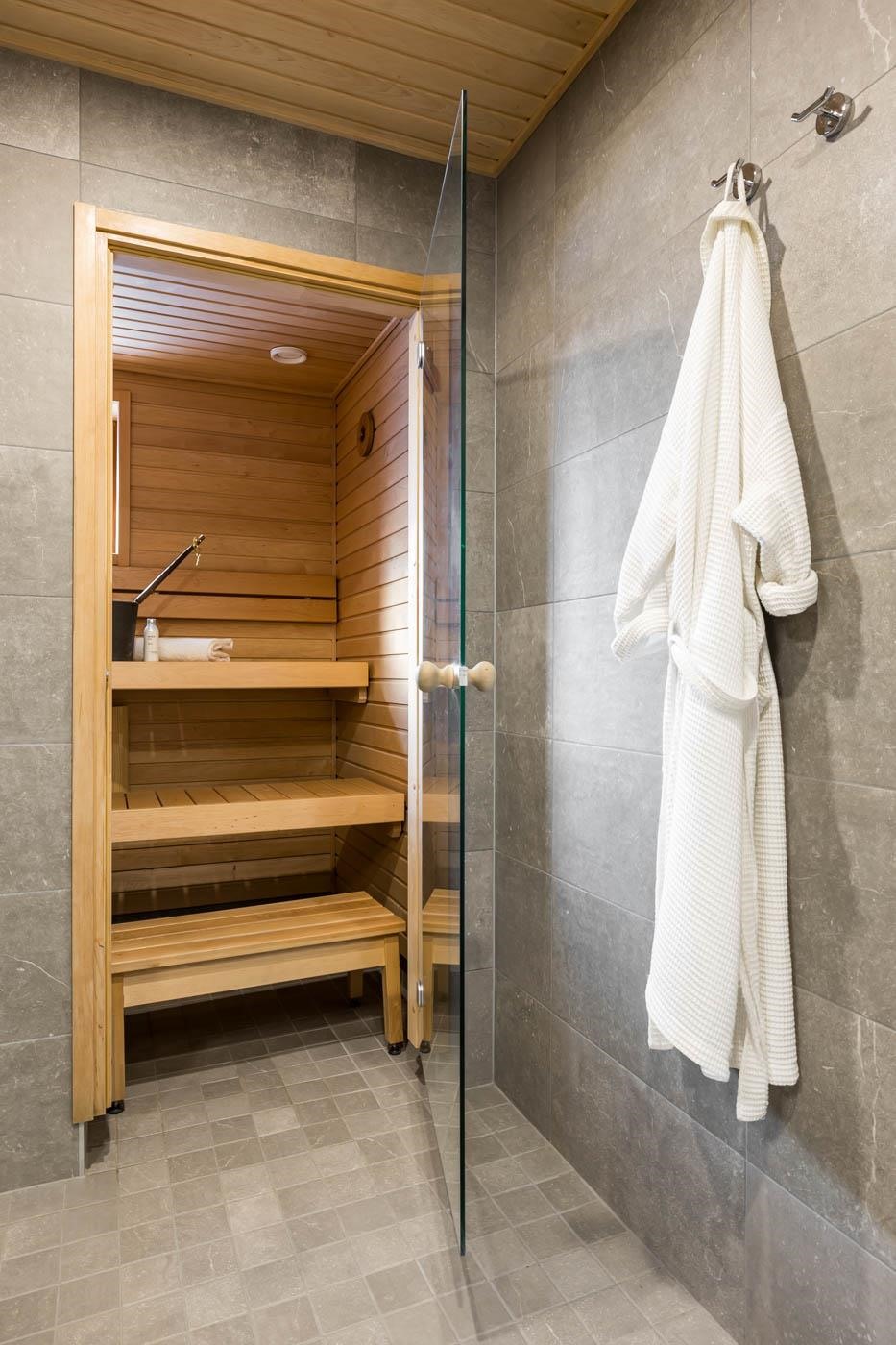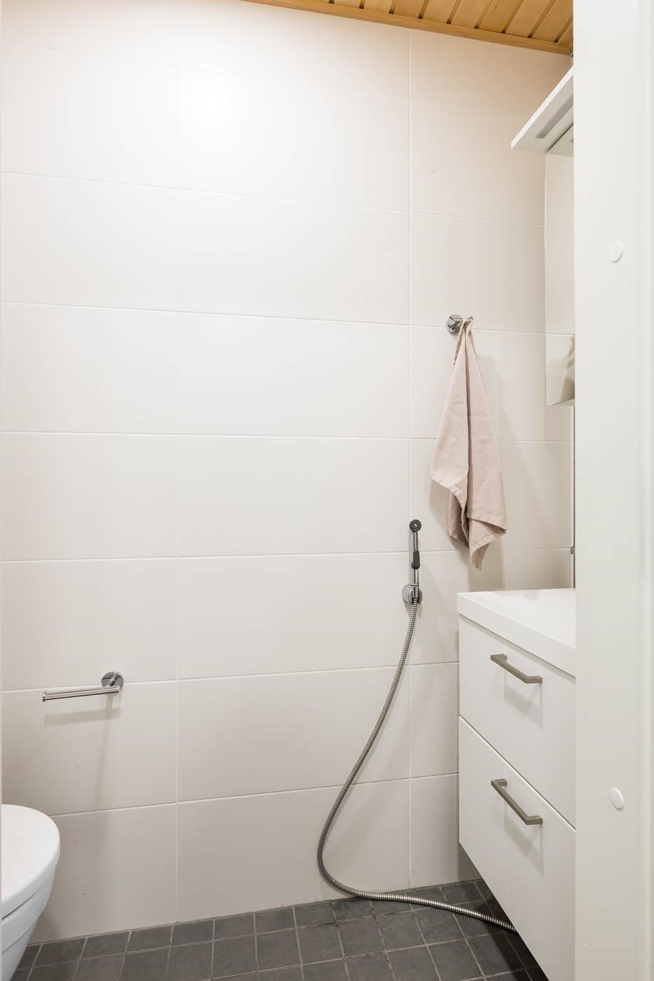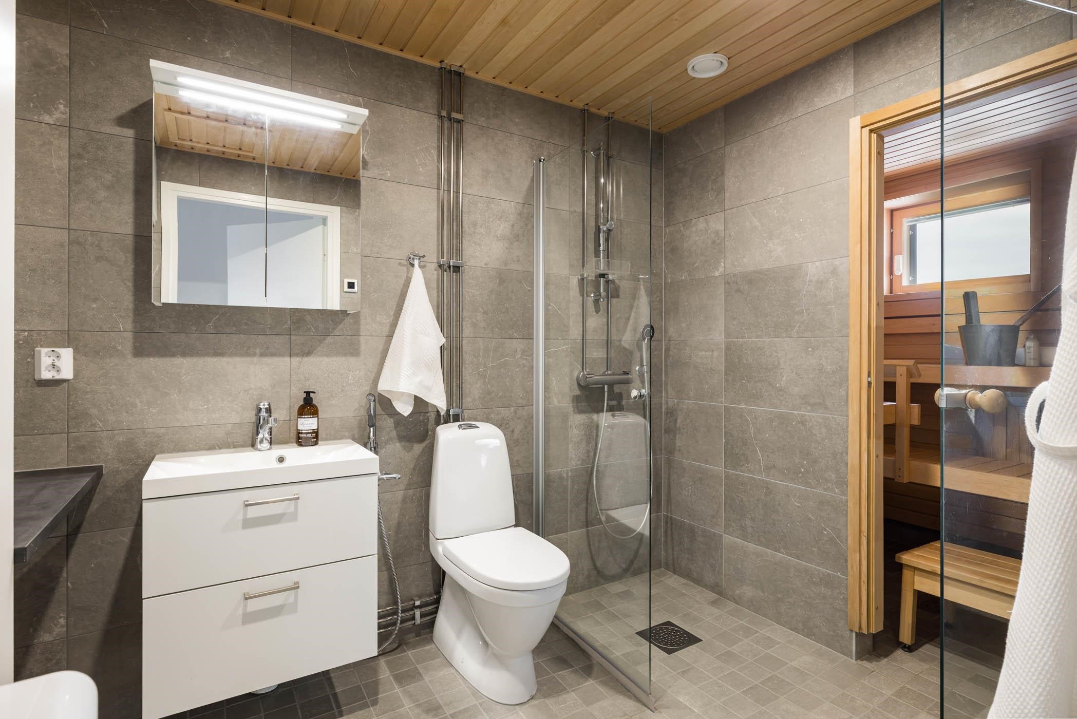 - Sauna, sähkökiuas, kylpyhuone, erillinen wc, suihku, suihkuseinä, peilikaappi, kaapit, allaskaappi, pesukoneliitäntä, lattialämmitys ( sisältyy vastikkeeseen ), kiinteät valaisimet.