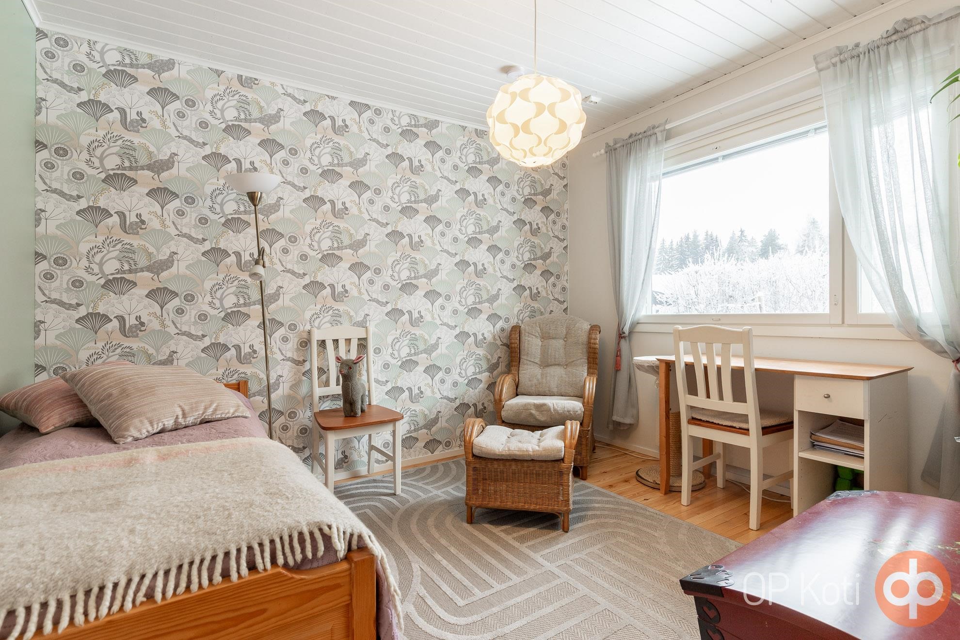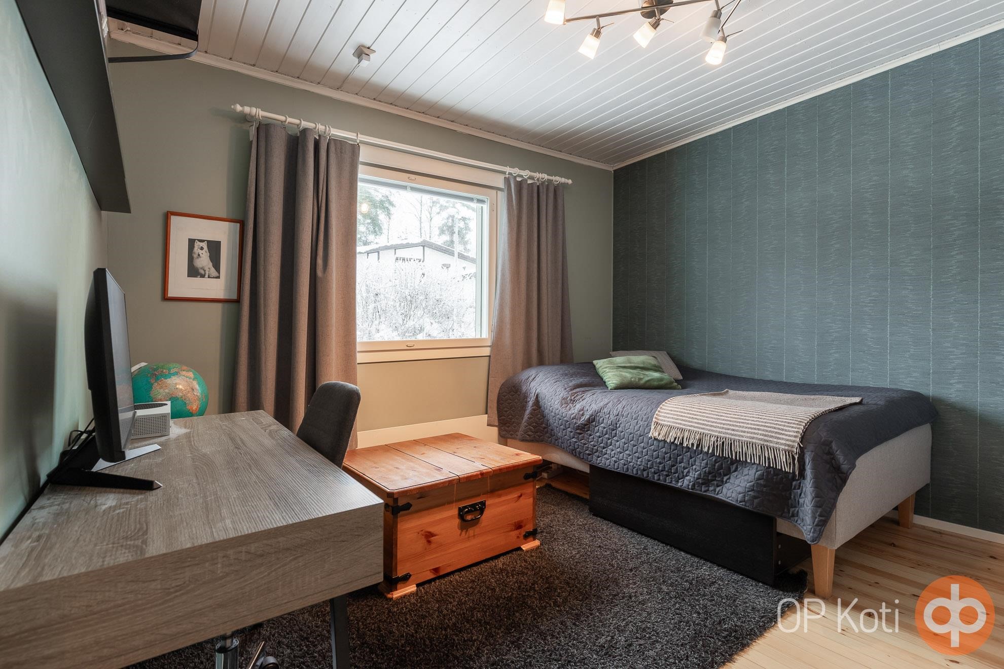 Keittiö: Korkkilaatta, maalattu. Olohuone: puu, seinät tapetoitu, osa maalattu. Makuuhuone 1: puu, seinät tapetoitu, osa maalattu. Makuuhuone 2: puu, seinät tapetoitu, osa maalattu. Makuuhuone 3: puu, seinät tapetoitu, osa maalattu. Kodinhoitohuone: Laatta, maalattu. Sauna: Laatta, paneloitu. Kylpyhuone: Laatta/kaakeli. Eteinen: Muovimatto, seinät maalattu. Wc: Laatta/seinät laatta, yläosa maalattu.