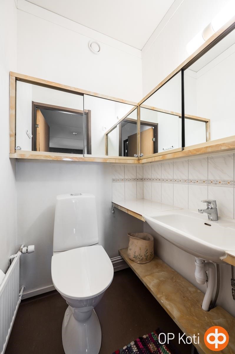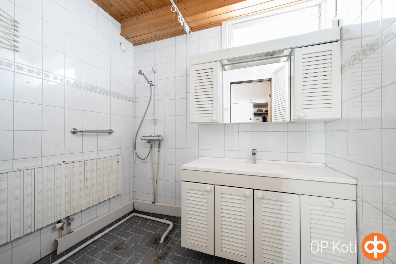 - Kylpyhuone, erillinen wc, suihku, pesukoneliitäntä, peilikaappi, allaskaappi, kiinteät valaisimet.