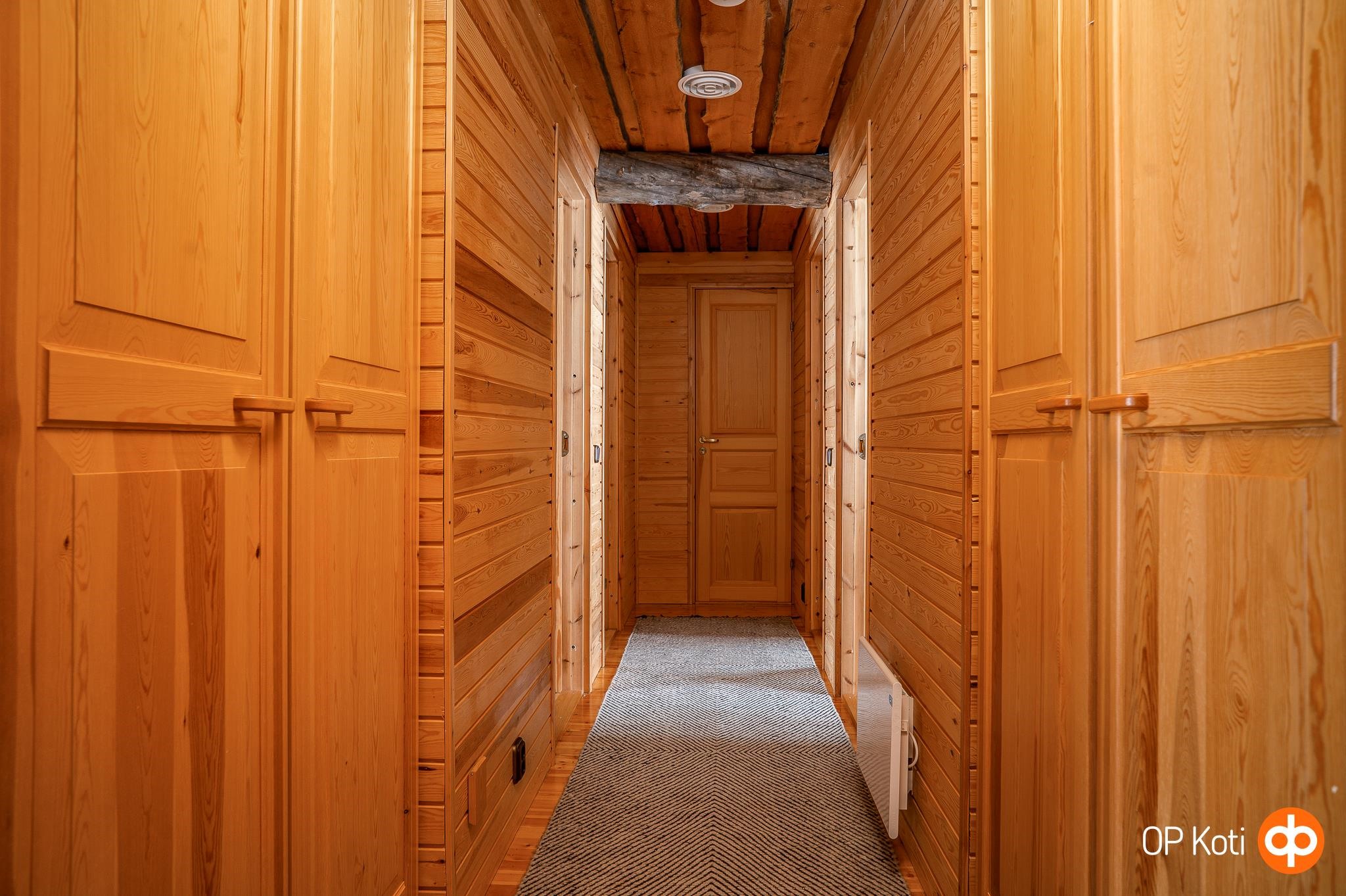 Keittiö: Mäntylautalattia, keloseinät. Olohuone: Mäntylautalattia, keloseinät. Makuuhuone 1: Mäntylautalattia, keloseinät. Makuuhuone 2: Mäntylautalattia, keloseinät. Makuuhuone 3: Mäntylautalattia, keloseinät. Sauna: Laatta, kelo. Kylpyhuone: Laatta, seinä: osittain laatta ja kelo. Eteinen: Laatta, kelo. Wc: Laatta, kelo. Makuuhuone 4: Mäntylautalattia, keloseinät. Pukuhuone: Laatta, kelo / paneeli. Parvi: Mäntylautalattia, keloseinät.