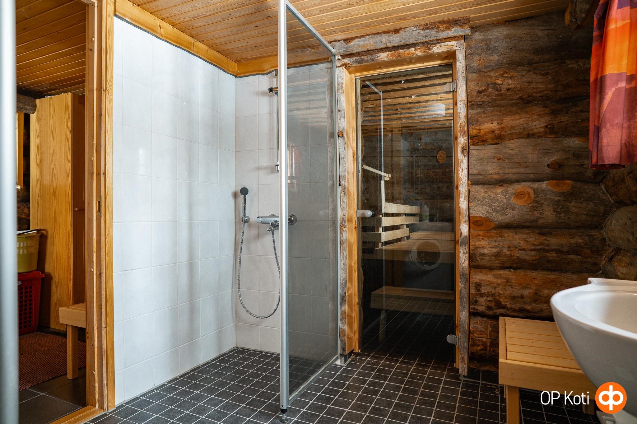 - Sauna, sähkökiuas, kylpyhuone, erillinen wc x 2, suihku x 2, suihkuseinä, peilit, allaskaappi, pesukoneliitäntä, lattialämmitys, kiinteät valaisimet.