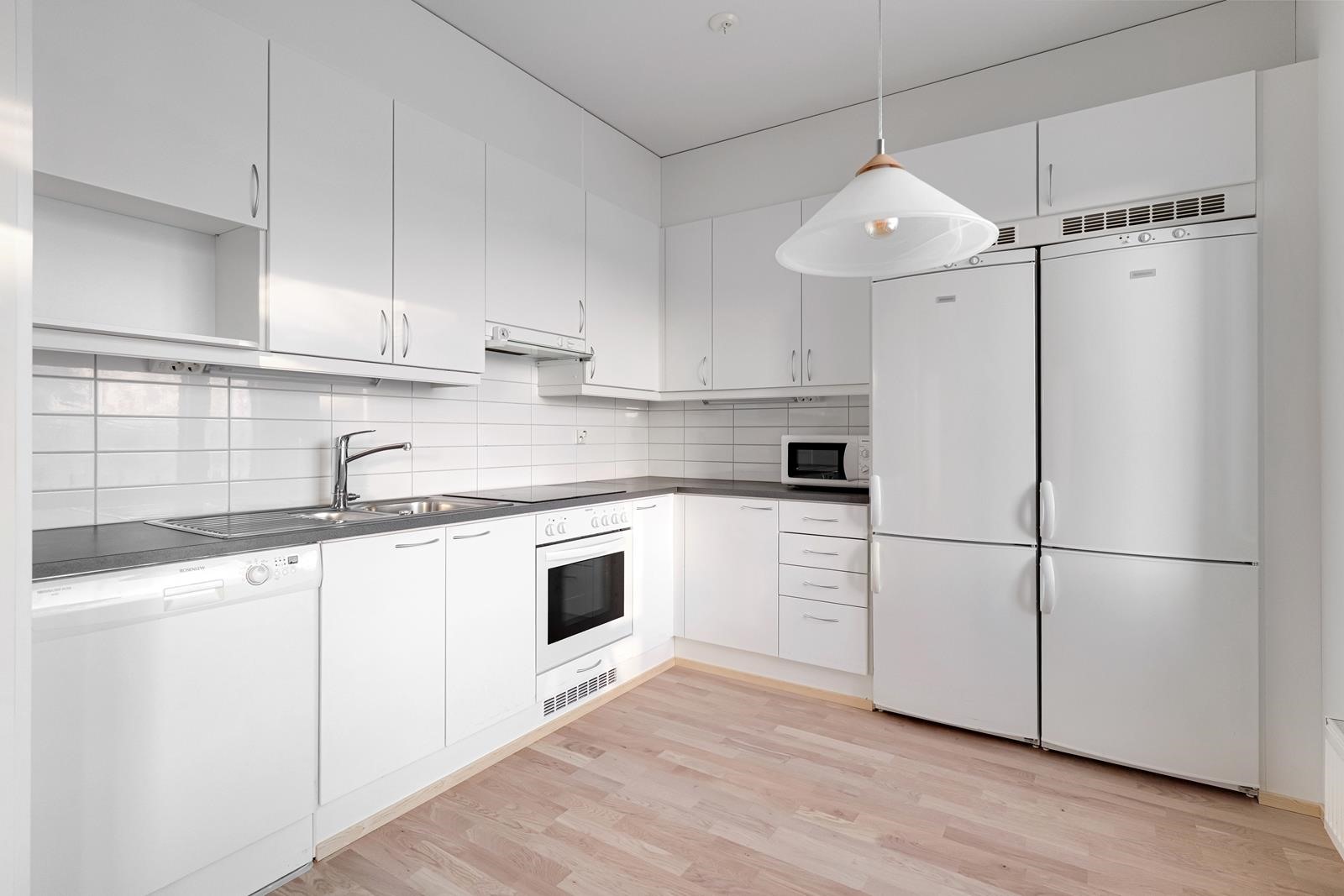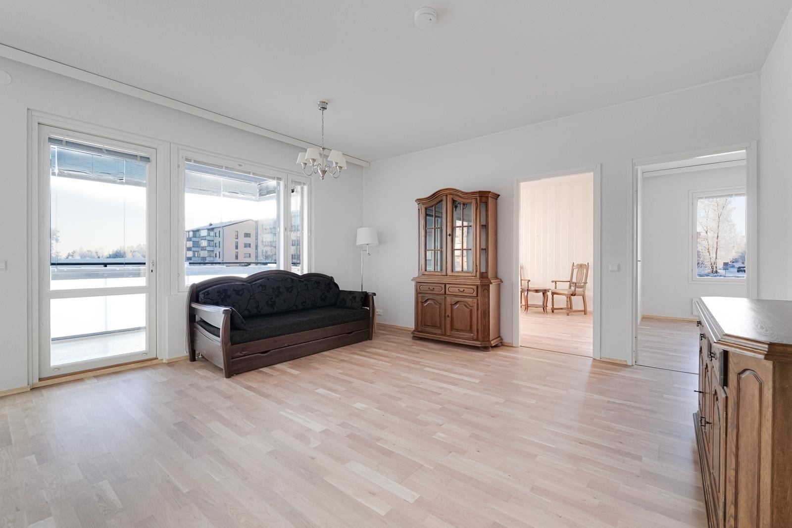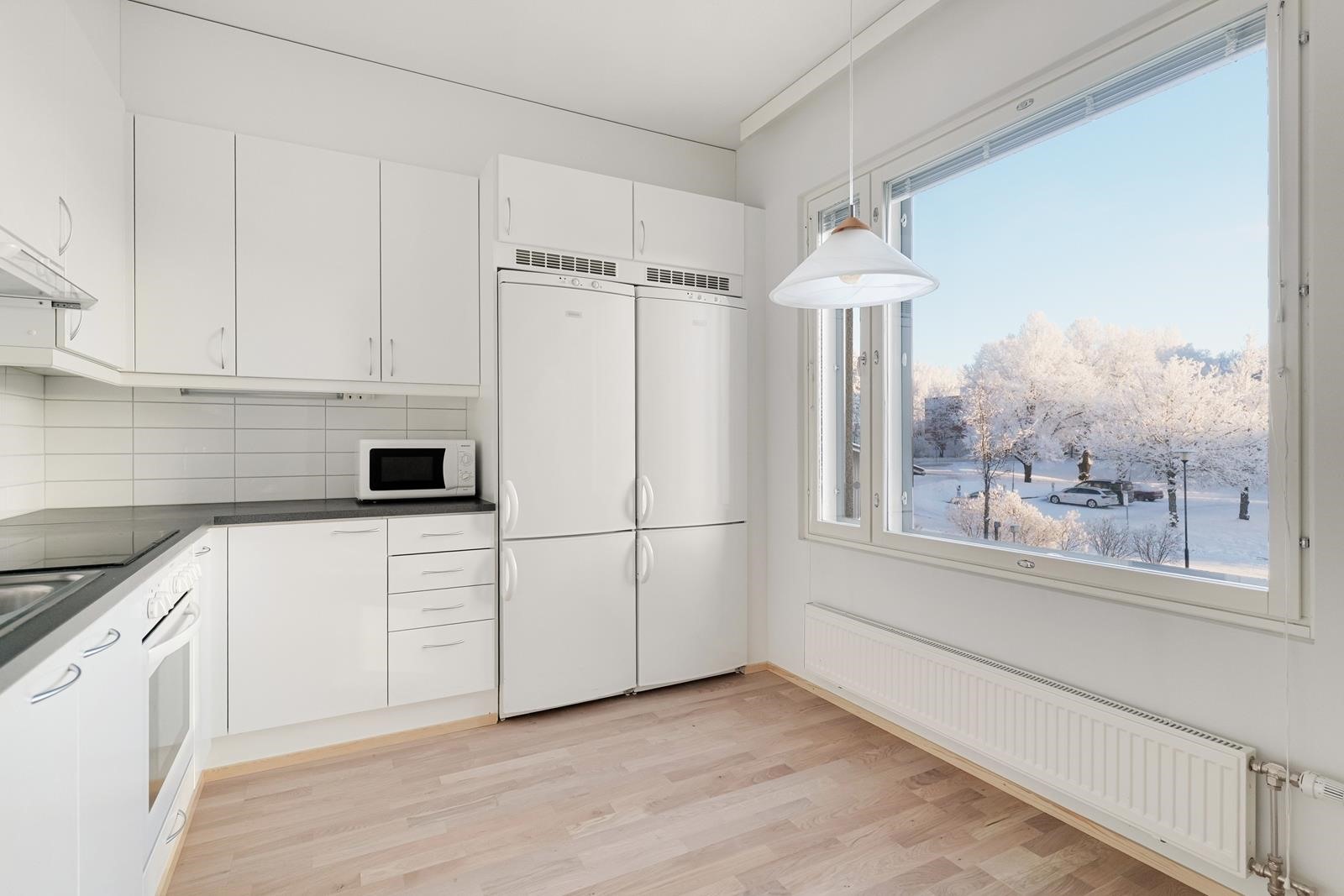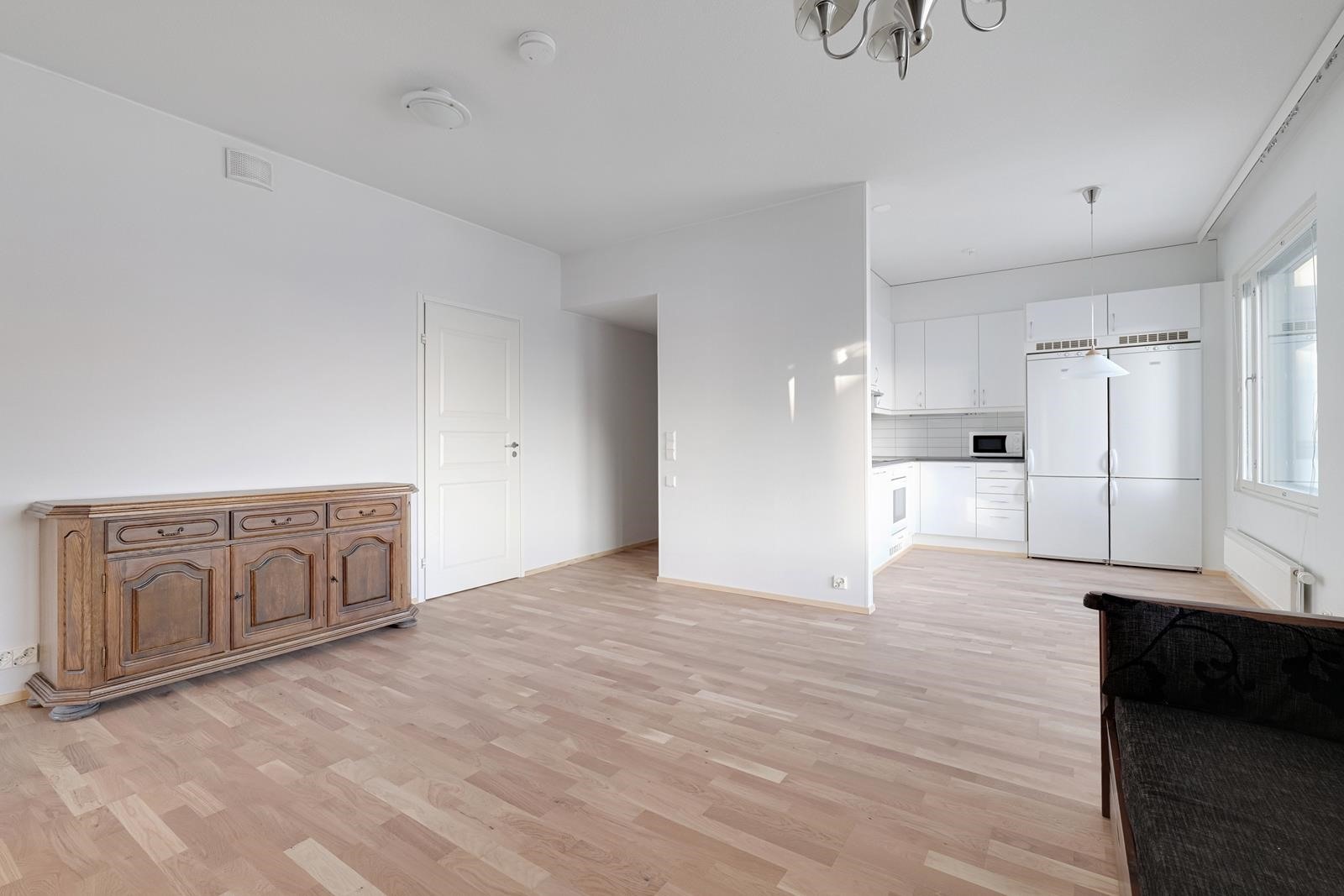Tämä hissitalon valoisa koti tarjoaa toimivan pohjaratkaisun, jossa keittiö avautuu olohuoneeseen luoden viihtyisän oleskelutilan. Asunnon parkettilattiat on juuri uusittu.