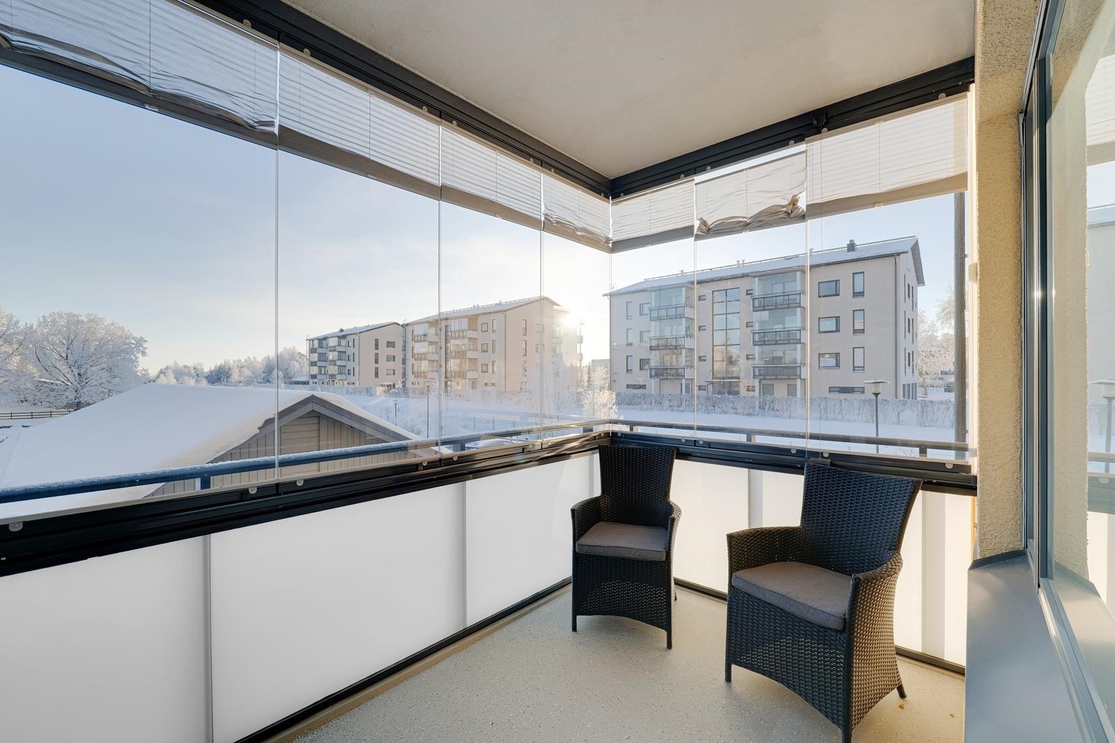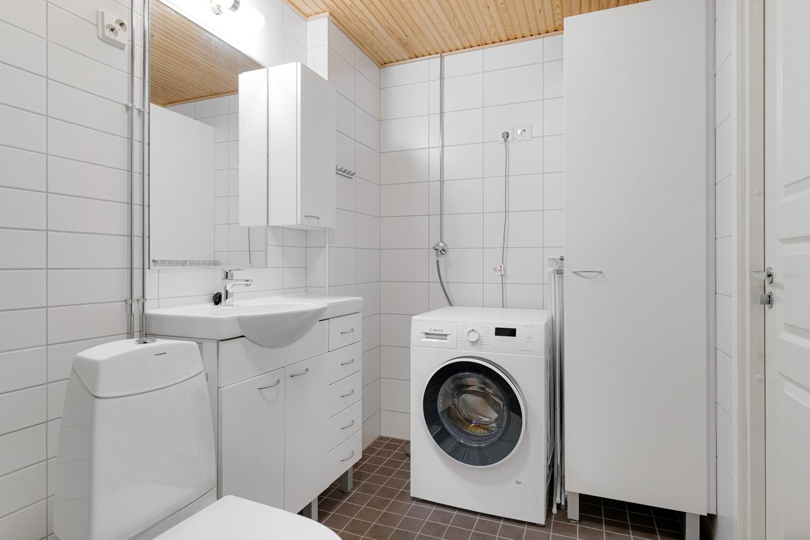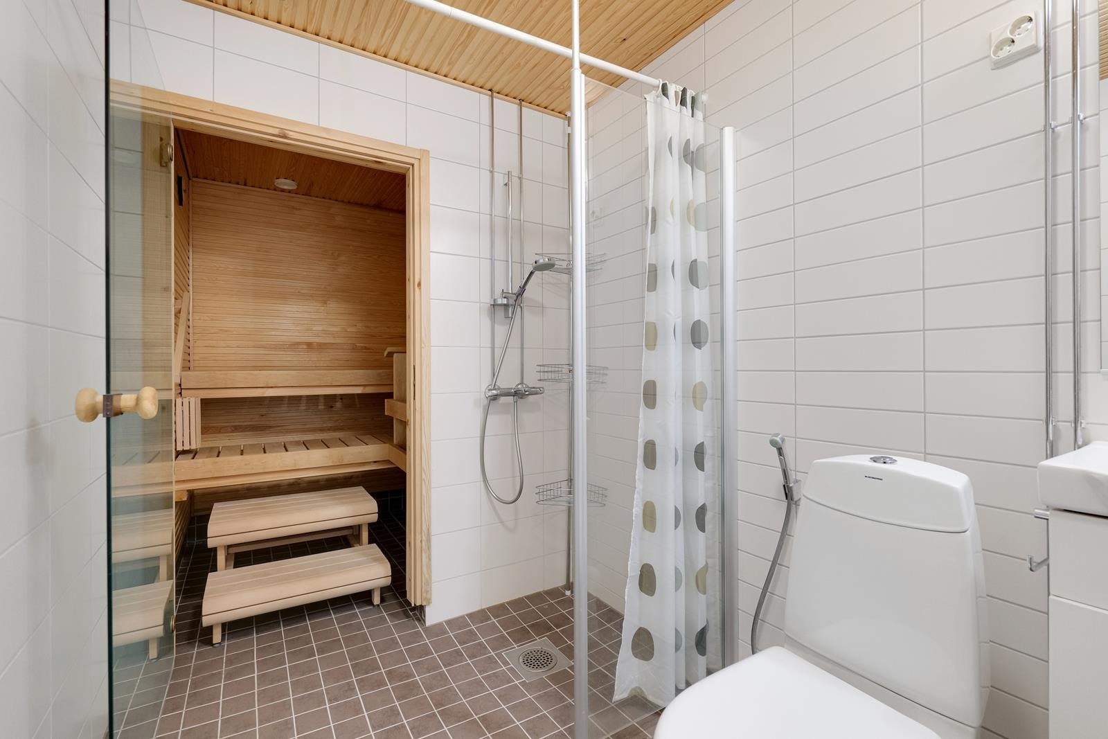 Oma sauna ja lasitettu parveke lisäävät asumismukavuutta ja tekevät tästä kodista nautinnon asua ympäri vuoden. Reilun kokoinen kylpyhuone tarjoaa myös käytännöllisen kodinhoito-osion.