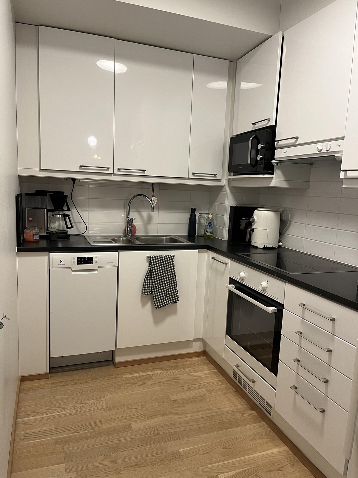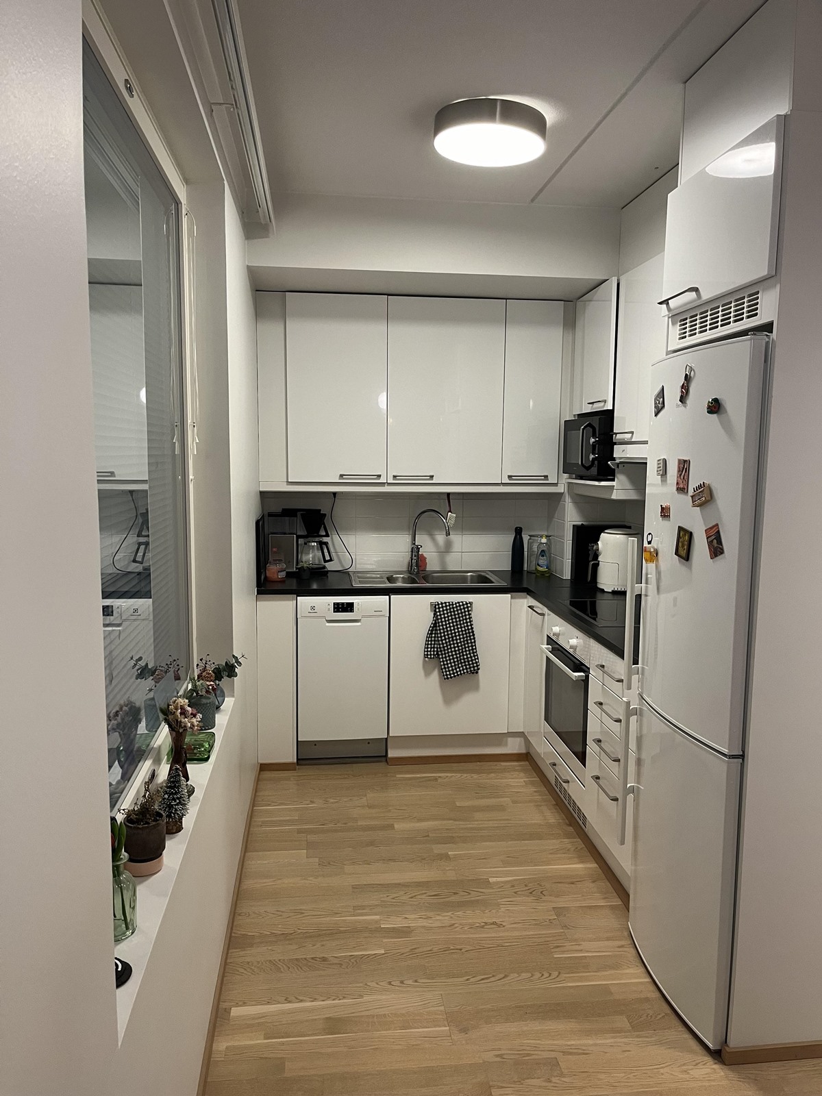 - Jääkaappipakastin, keraaminen liesi, liesikupu, astianpesukone, kaapistot, kiinteät valaisimet.