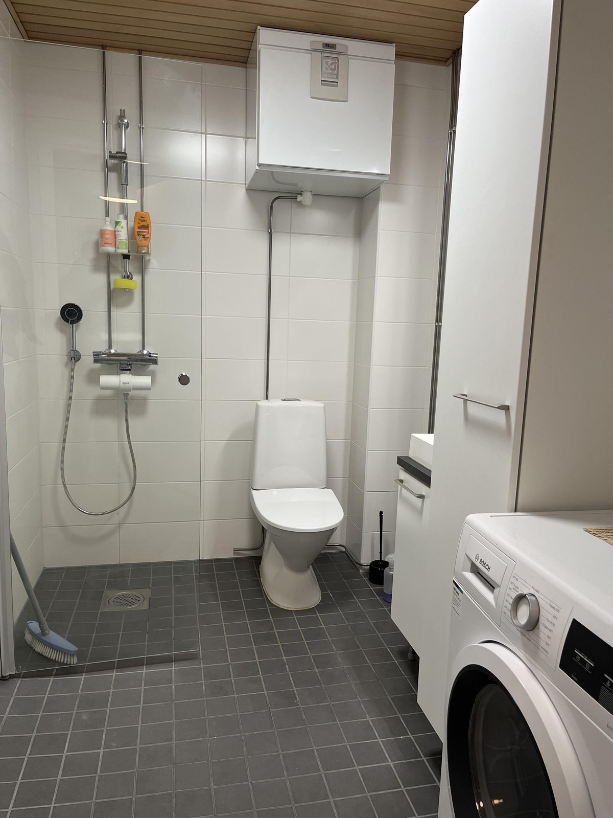 - Kylpyhuone, suihku, suihkuseinä, peilit, allaskaappi, pesukoneliitäntä, lattialämmitys, kiinteät valaisimet, Pesukone.
