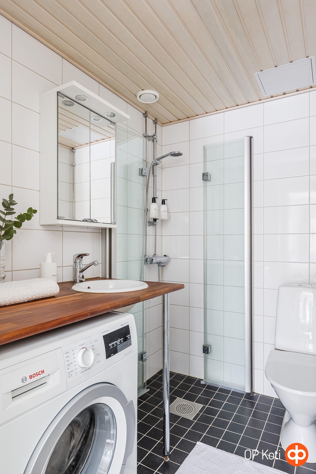 - Kylpyhuone: suihku, suihkuseinä, peilikaappi, pesukoneliitäntä, lattialämmitys sähkötoiminen, kiinteät valaisimet, taso ja käsienpesuallas, pyyhepatteri vesikiertoinen