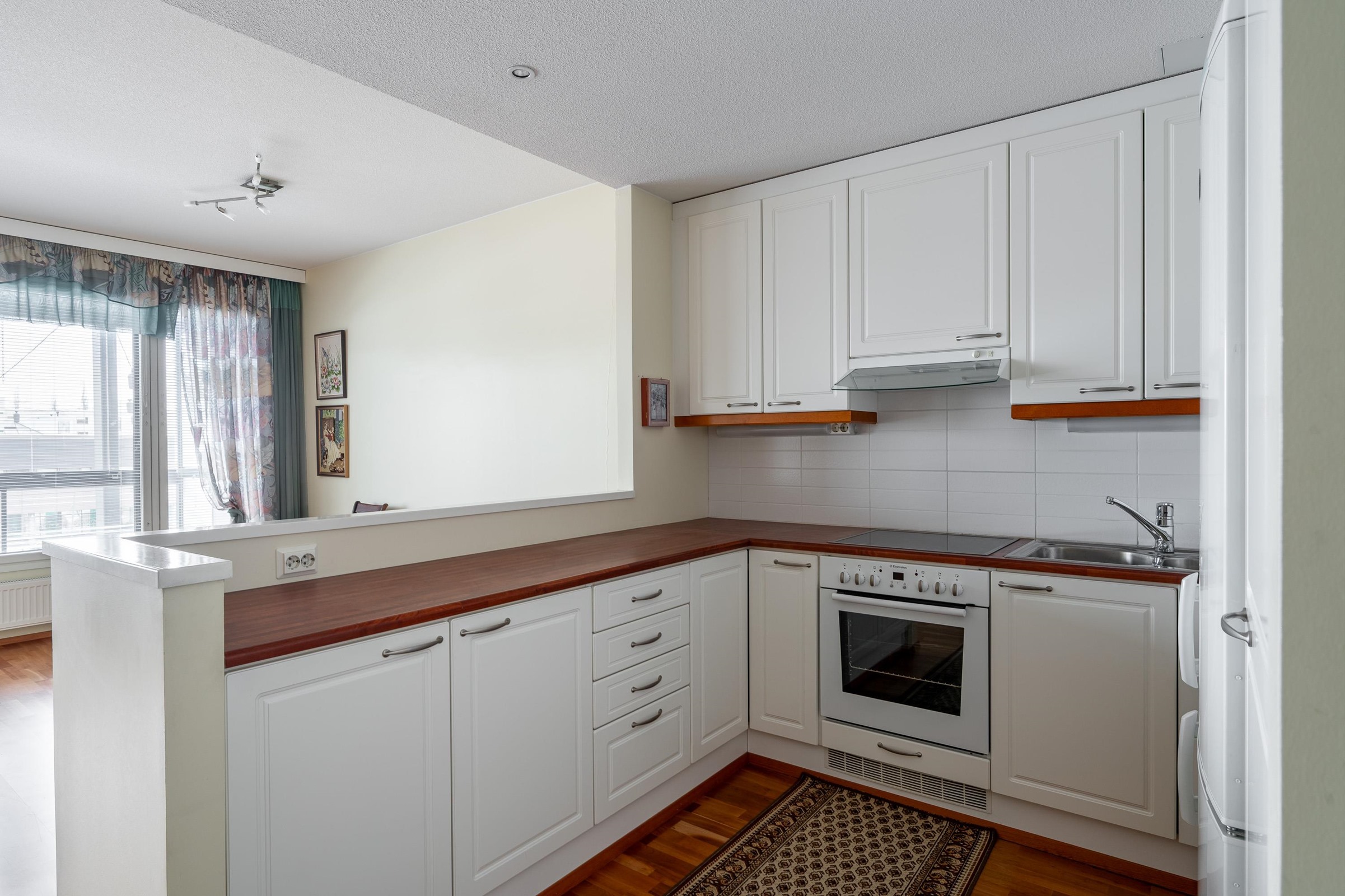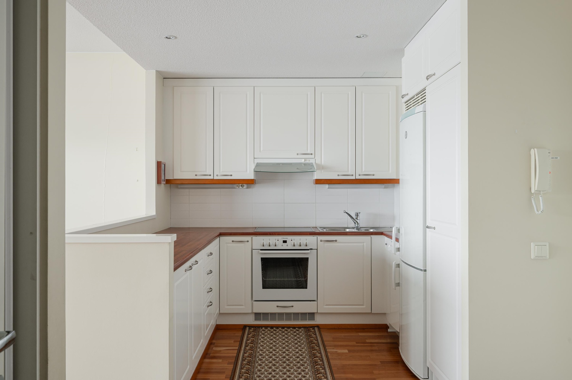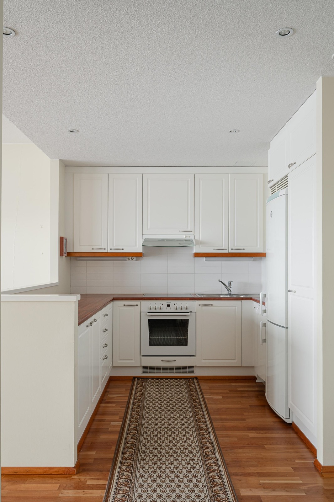 - Jääkaappipakastin, erillisuuni, liesitaso, liesituuletin, astianpesukone, kaapistot, kiinteät valaisimet.