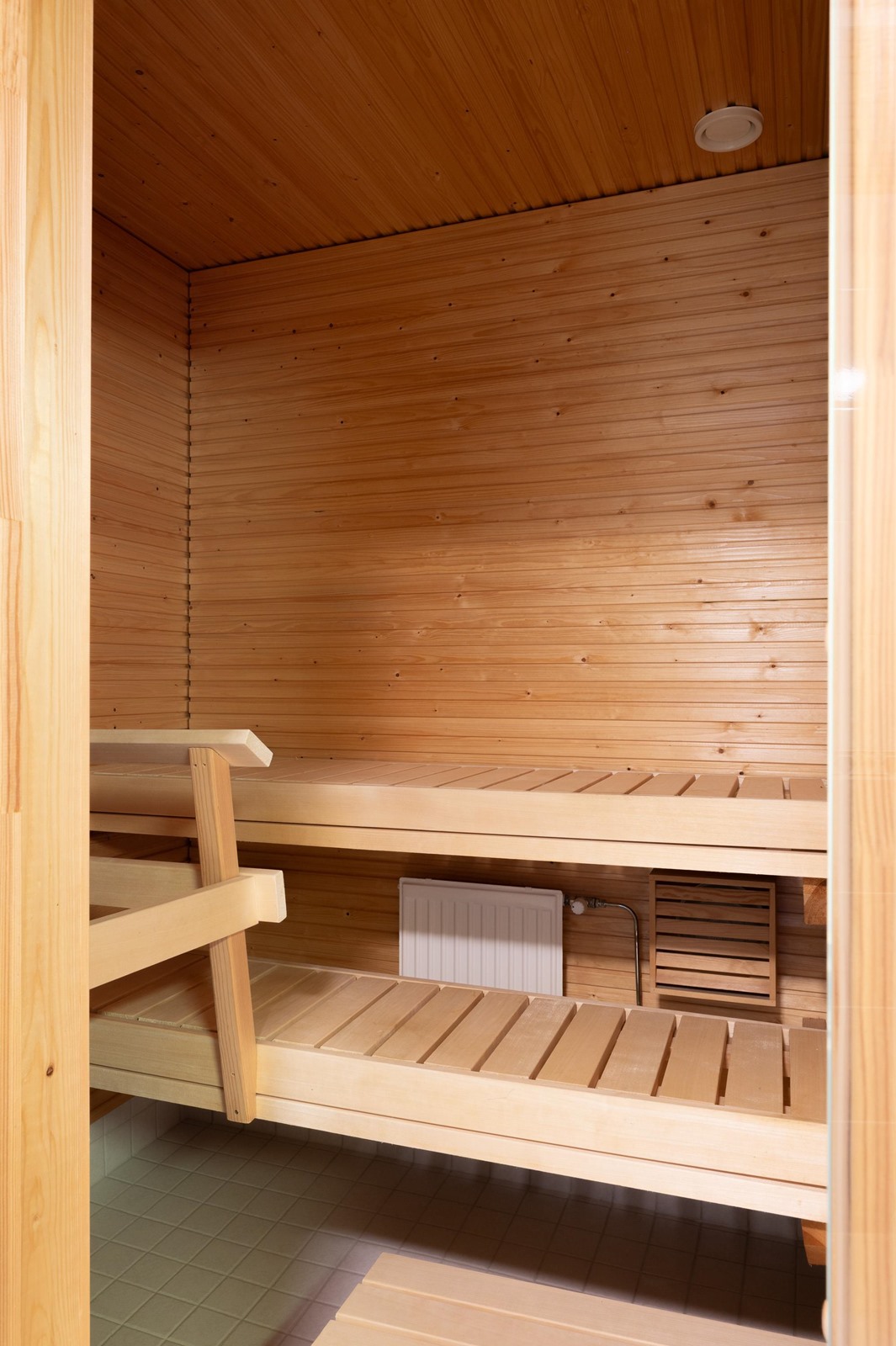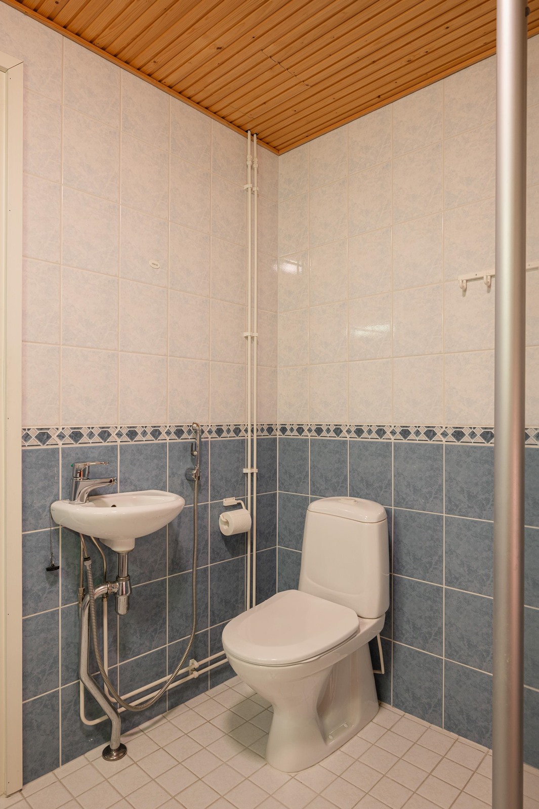 - Sauna, sähkökiuas, kylpyhuone wc, suihku, suihkuseinä, peilikaappi, allaskaappi, pesukoneliitäntä, lattialämmitys, kiinteät valaisimet.