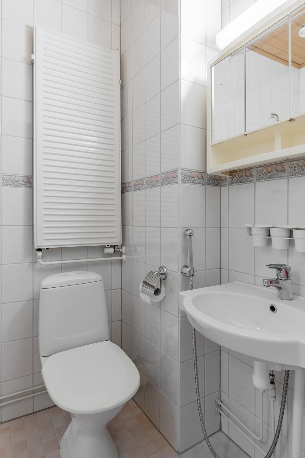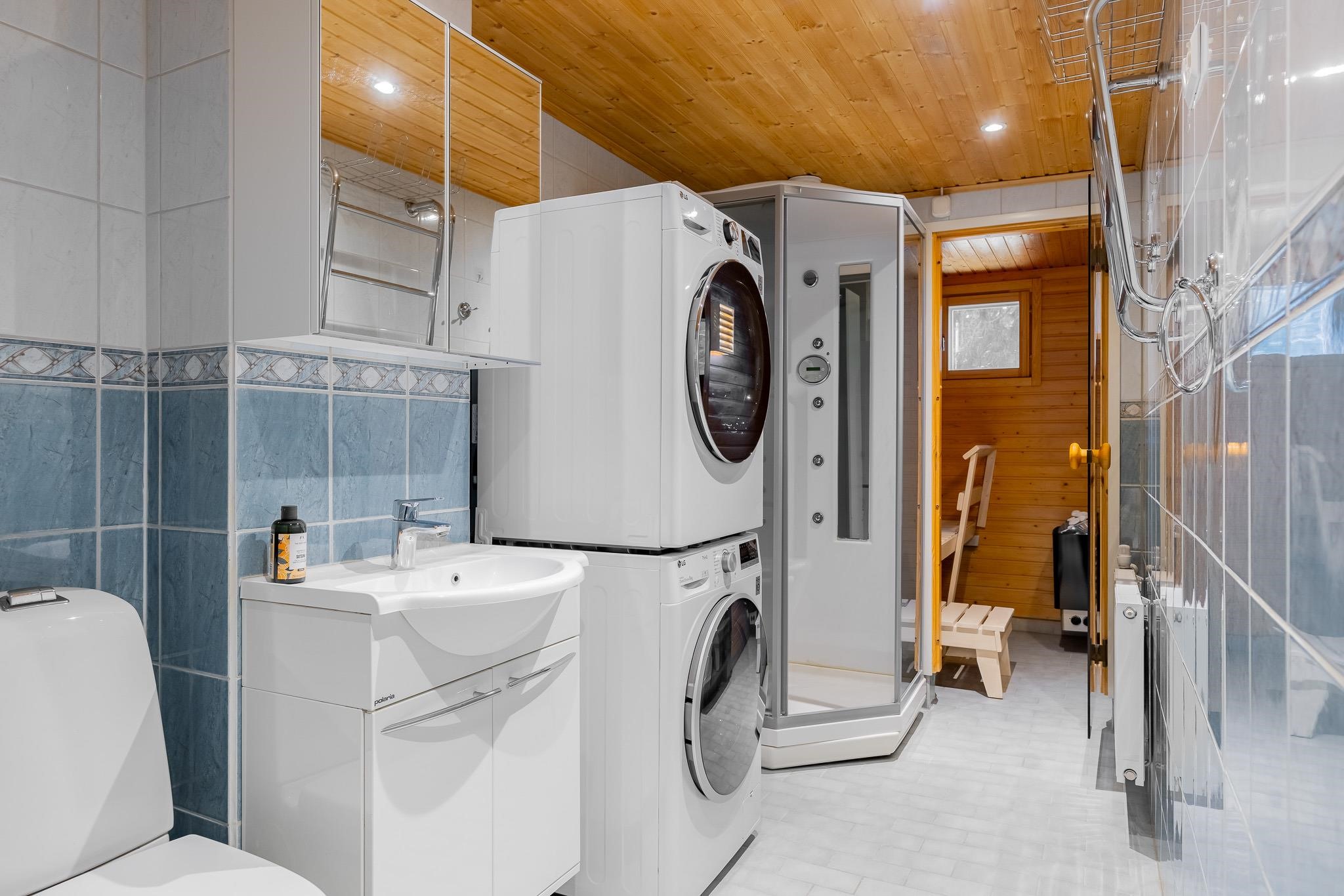 - Kph/wc alakerta: Suihku, wc-istuin, suihkukaappi, allas, allaskaappi, peilikaappi, pesukoneliitäntä, lattialämmitys, lääkekaappi ja pyyhekuivain. Kph/wc yläkerta: Suihku, wc-istuin, allas, bide ja peilikaappi. Sauna: ikkuna ja sähkökiuas.