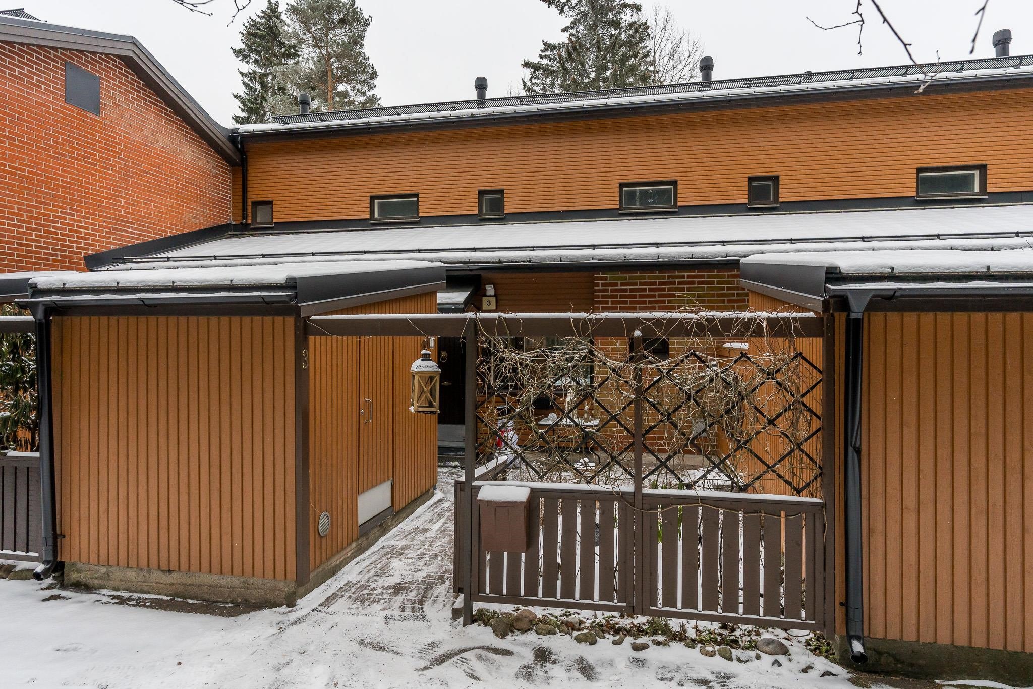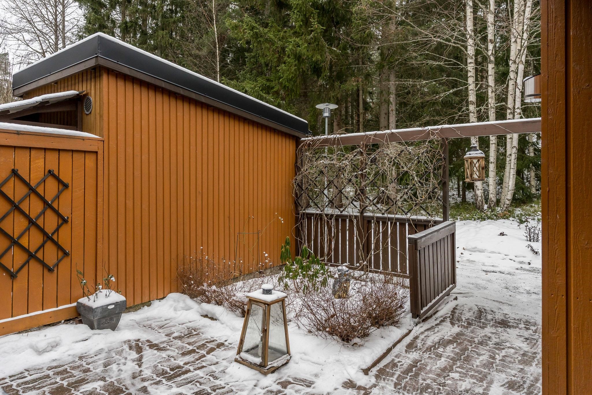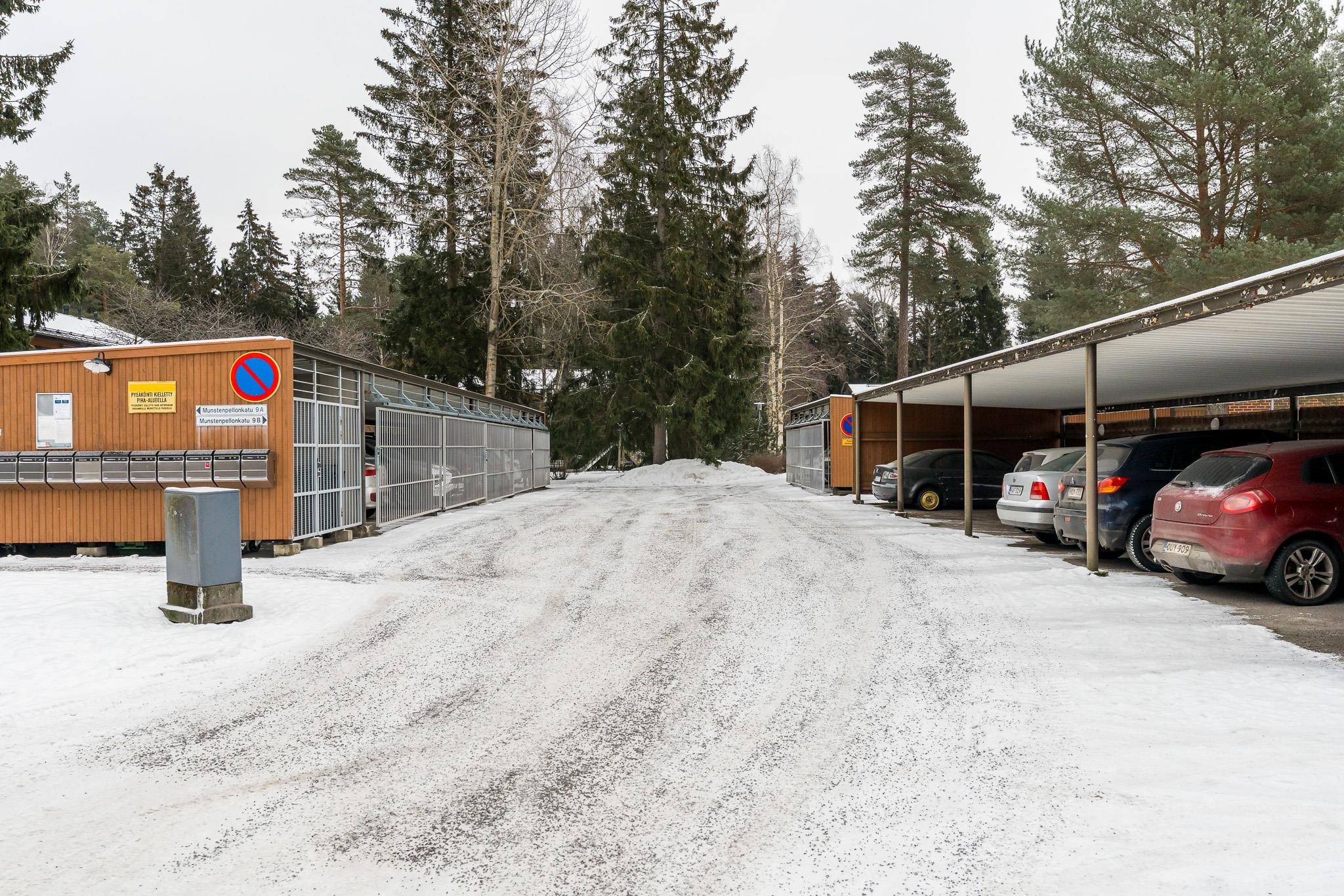 Asunnon yhteydessä ovat sekä etupiha että takapiha. Etupihalta löytyy kätevä varasto, ja asuntoon kuuluu lisäksi autokatospaikka.