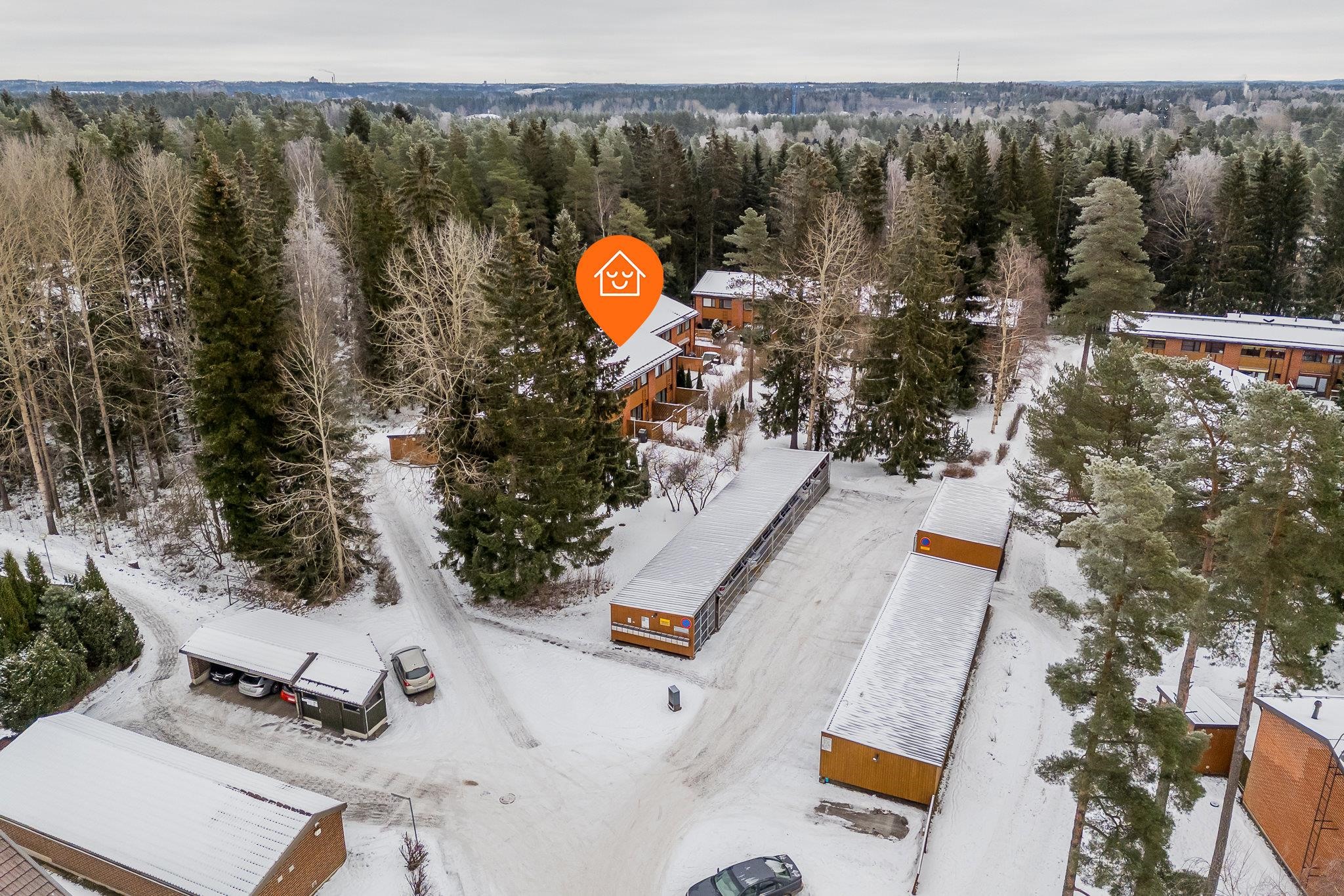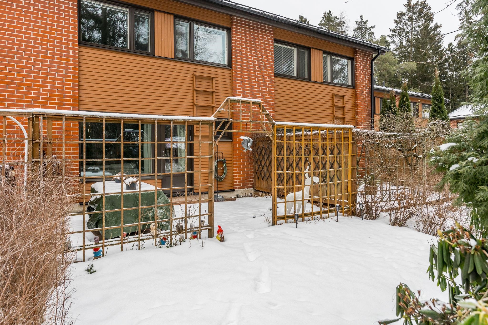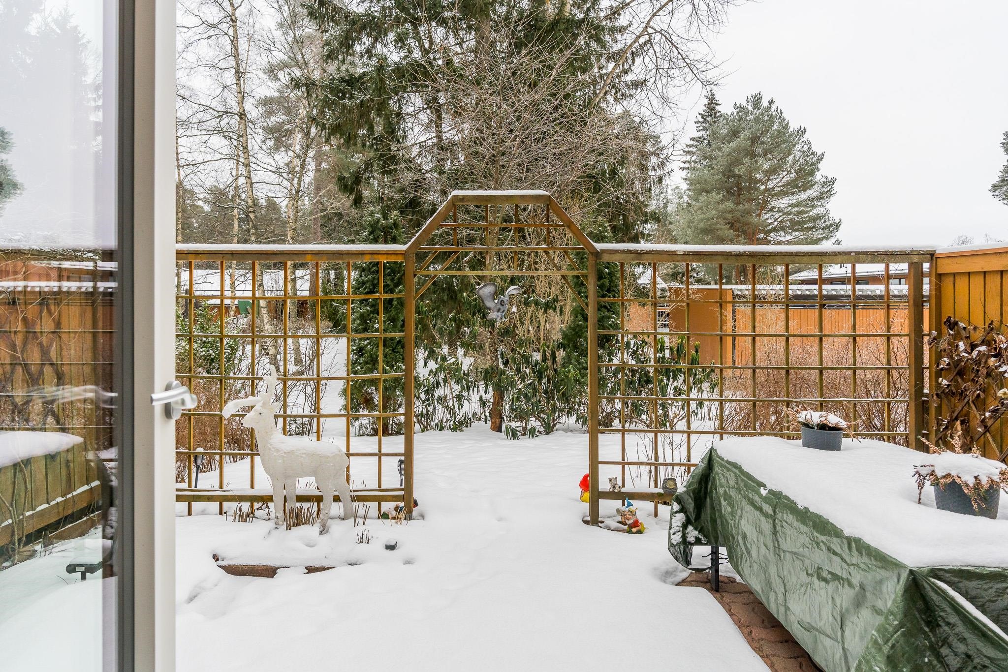 Asunnon yhteydessä ovat sekä etupiha että takapiha. Etupihalta löytyy kätevä varasto, ja asuntoon kuuluu lisäksi autokatospaikka.