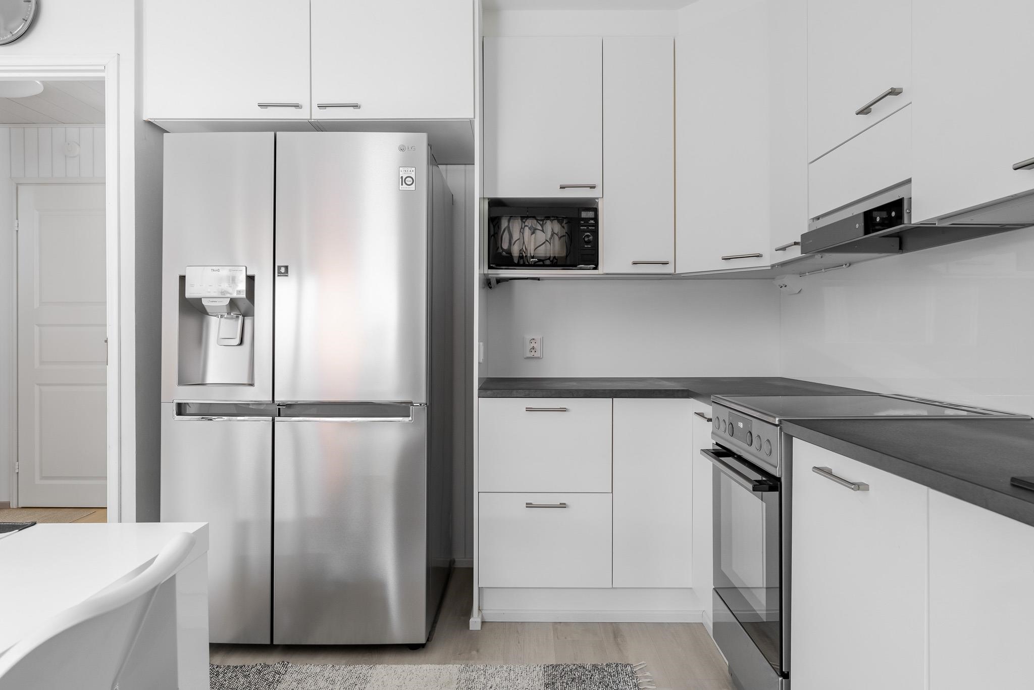 - Keraaminen liesi, liesituuletin, astianpesukone integroitu, kaapistot, kiinteät valaisimet, Side by Side ja pyrolyysiuuni (grilli).