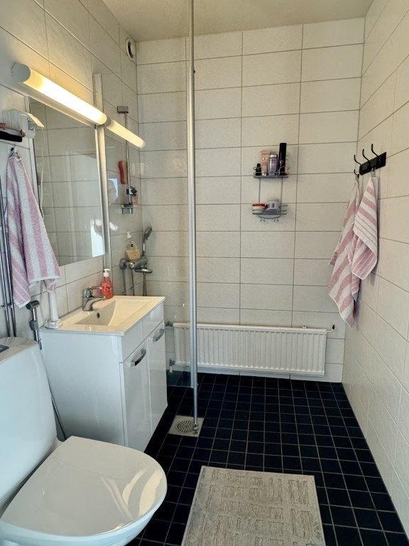 - Kylpyhuone, suihku, suihkuseinä, peilit, allaskaappi, kiinteät valaisimet.