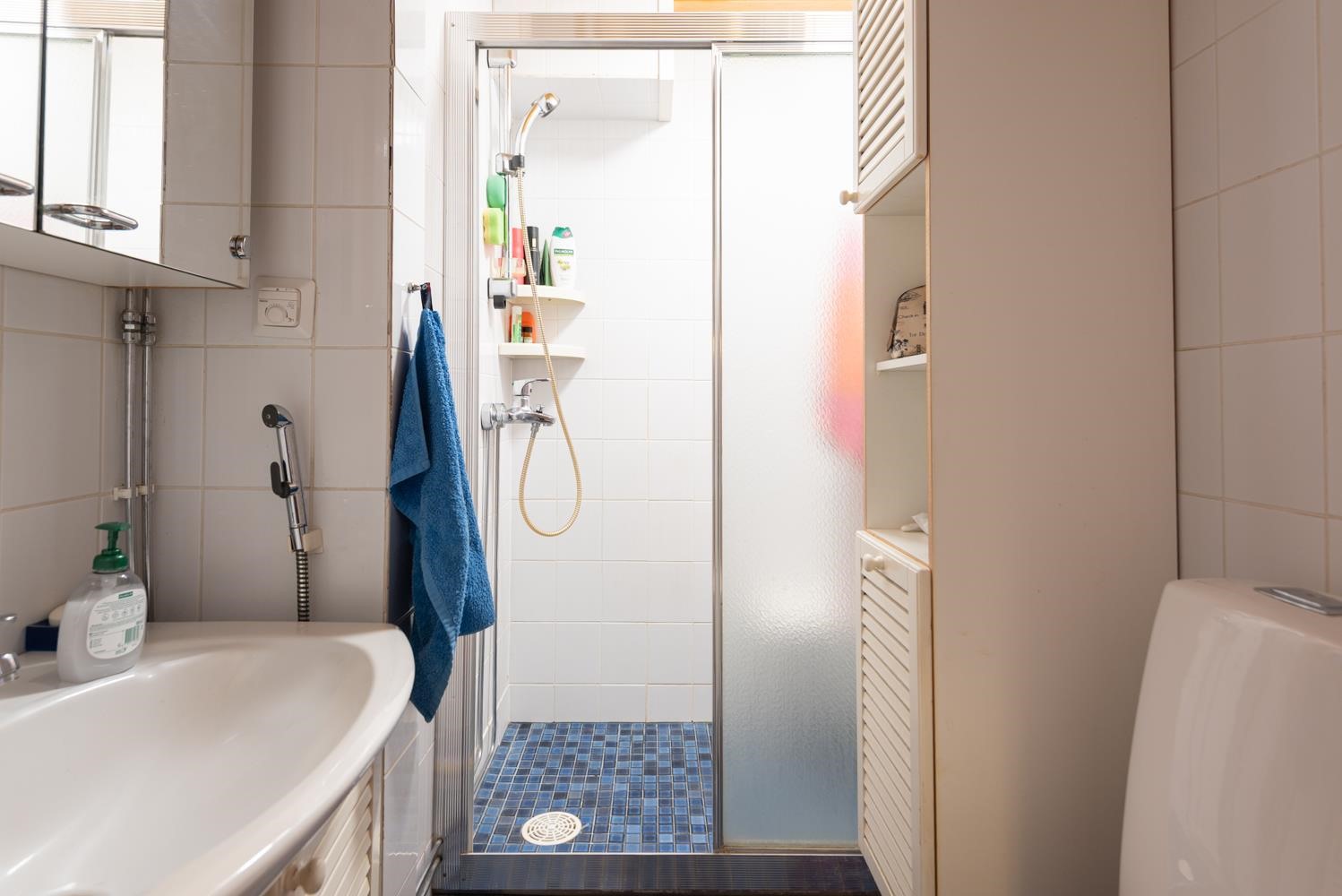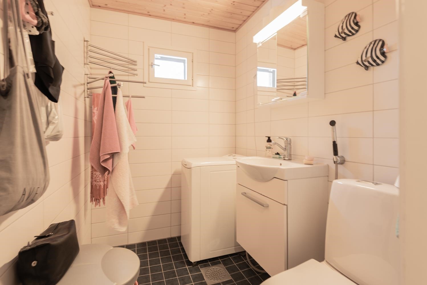 - Kylpyhuone, erillinen wc, suihku, suihkuseinä, peilikaappi, kaapit, allaskaappi, pesukoneliitäntä, lattialämmitys, kiinteät valaisimet. pyykinpesukone sisältyy kylpyhuoneen varusteluun