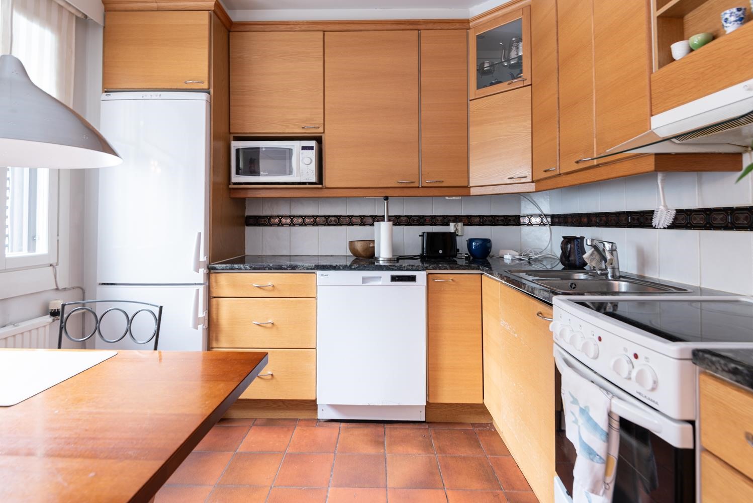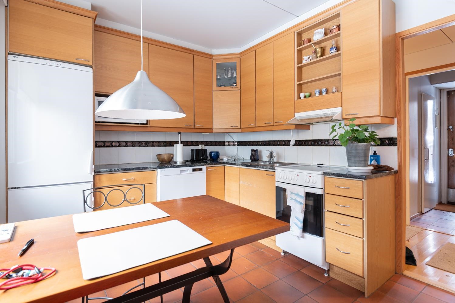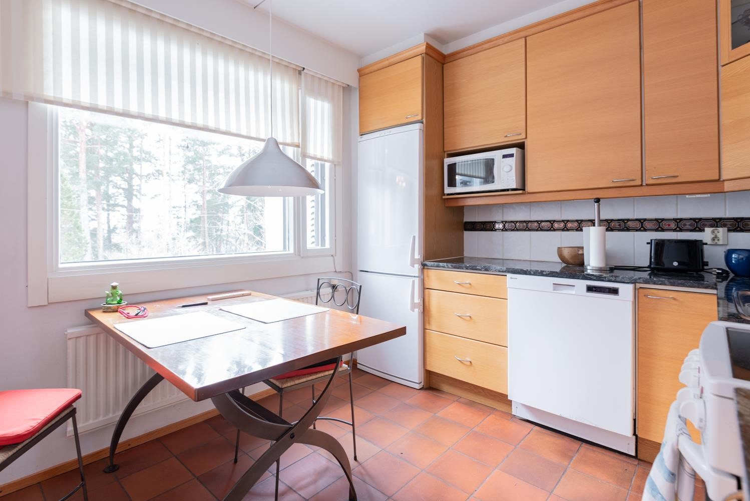 - Jääkaappipakastin, lattialiesi, liesituuletin, mikroaaltouuni, astianpesukone, kaapistot.
