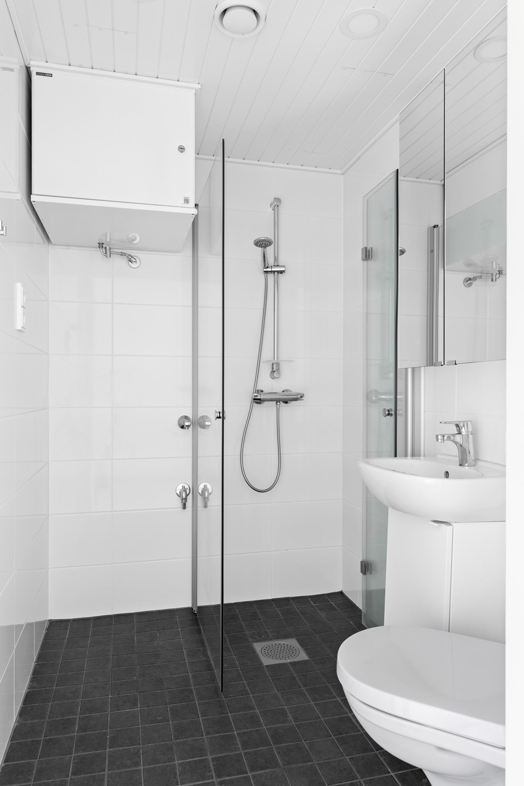 - Kylpyhuoneen varusteet: Peilikaappi, allaskaappi, suihku, lasinen suihkuseinä, pesukoneliitäntä, lattialämmitys.