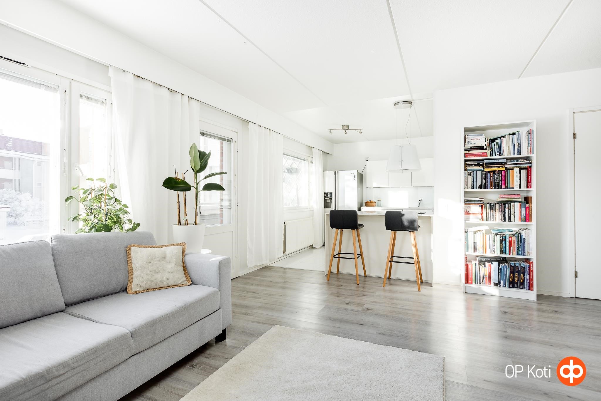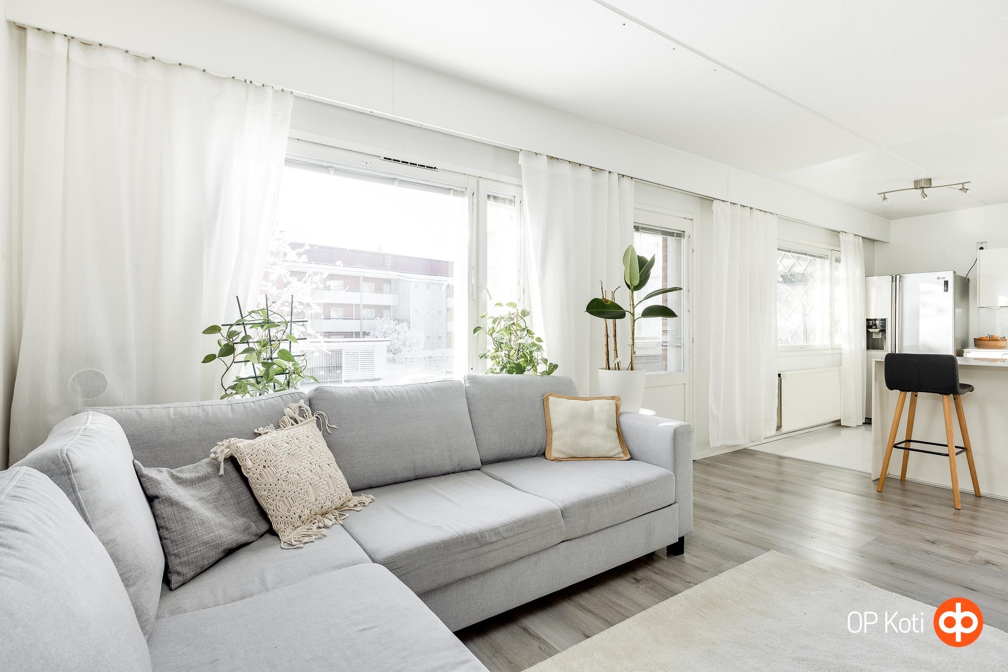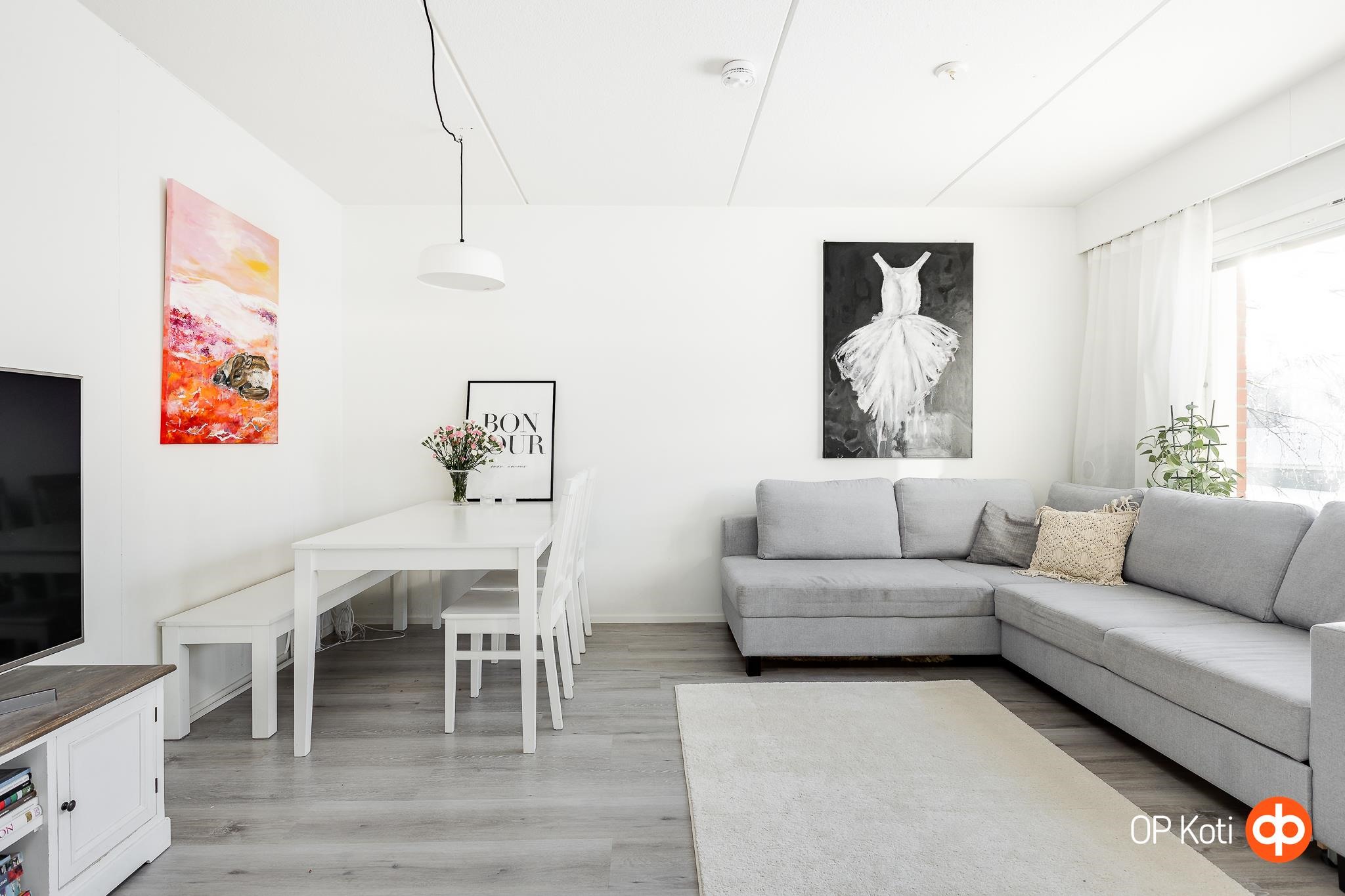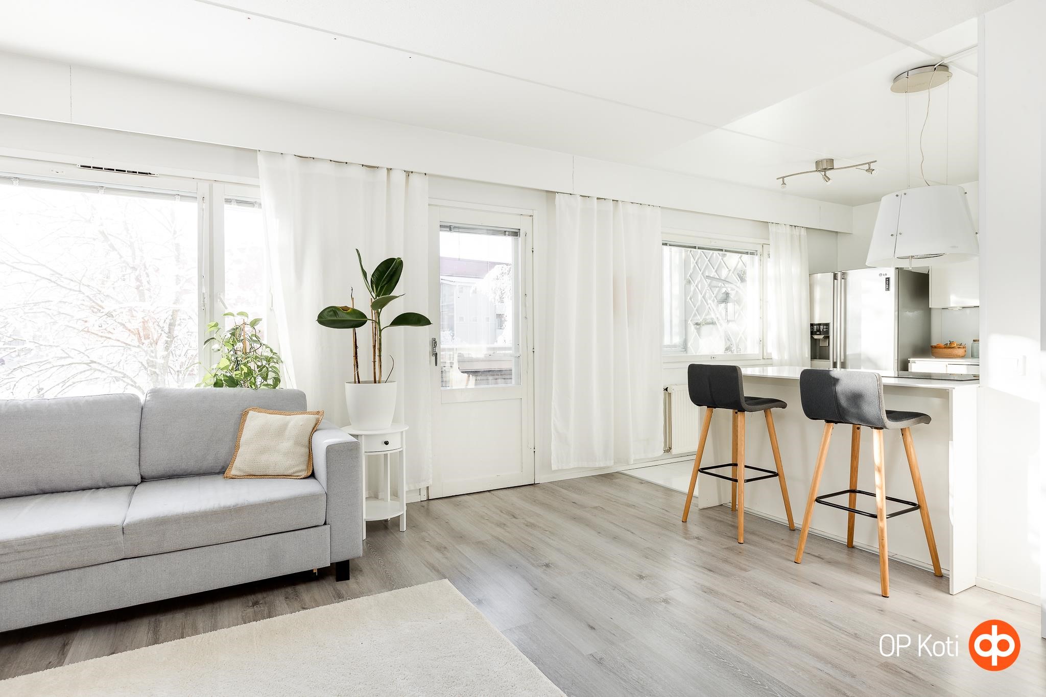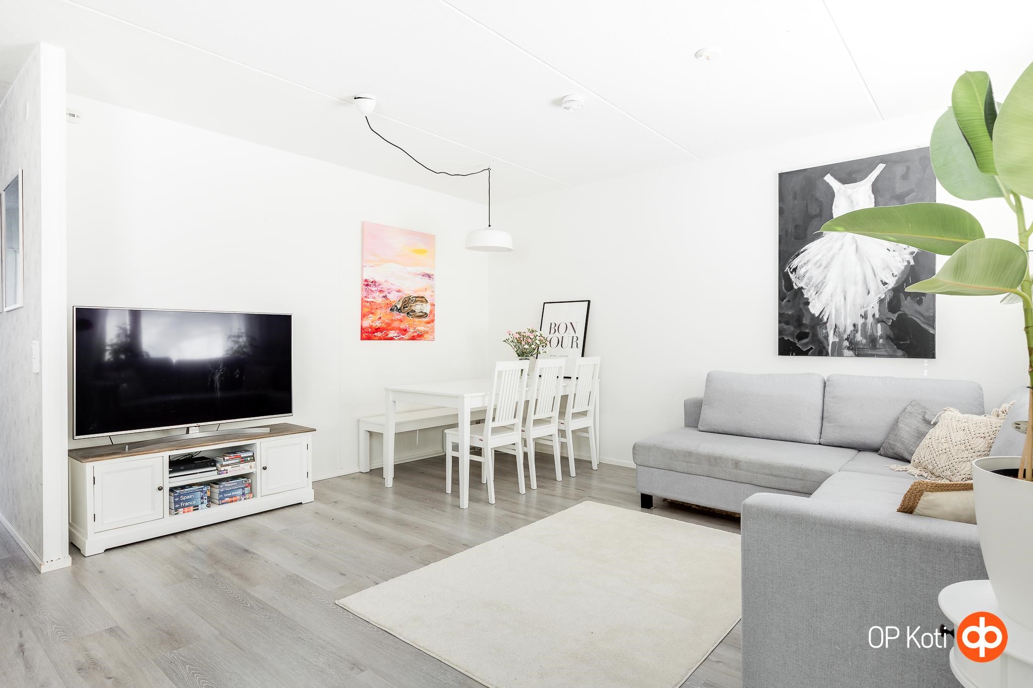 Tämän kodin avaran ja harkitun pohjaratkaisun ansiosta arki on sujuvaa, olohuone ja keittiö muodostavat yhtenäisen tilan, joka kutsuu viihtymään yhdessä. Kolmen makuuhuoneen ansiosta jokaiselle löytyy oma rauhallinen soppi, ja lasitettu parveke tuo mukavasti lisätilaa niin kesäaamujen kahvihetkiin kuin iltaisin rentoutumiseen.