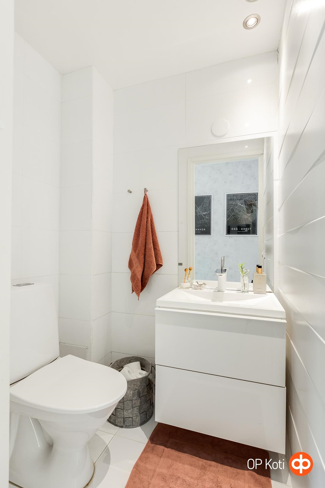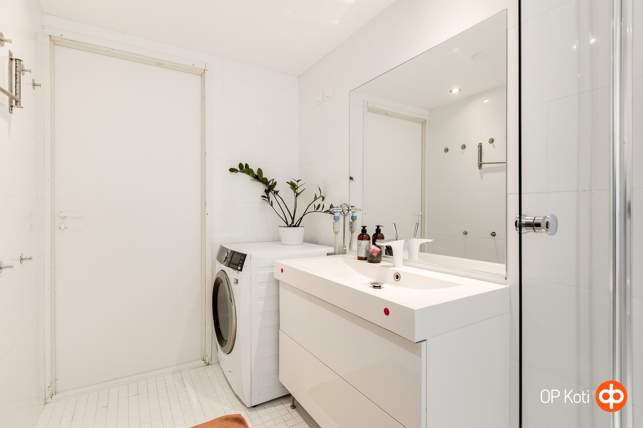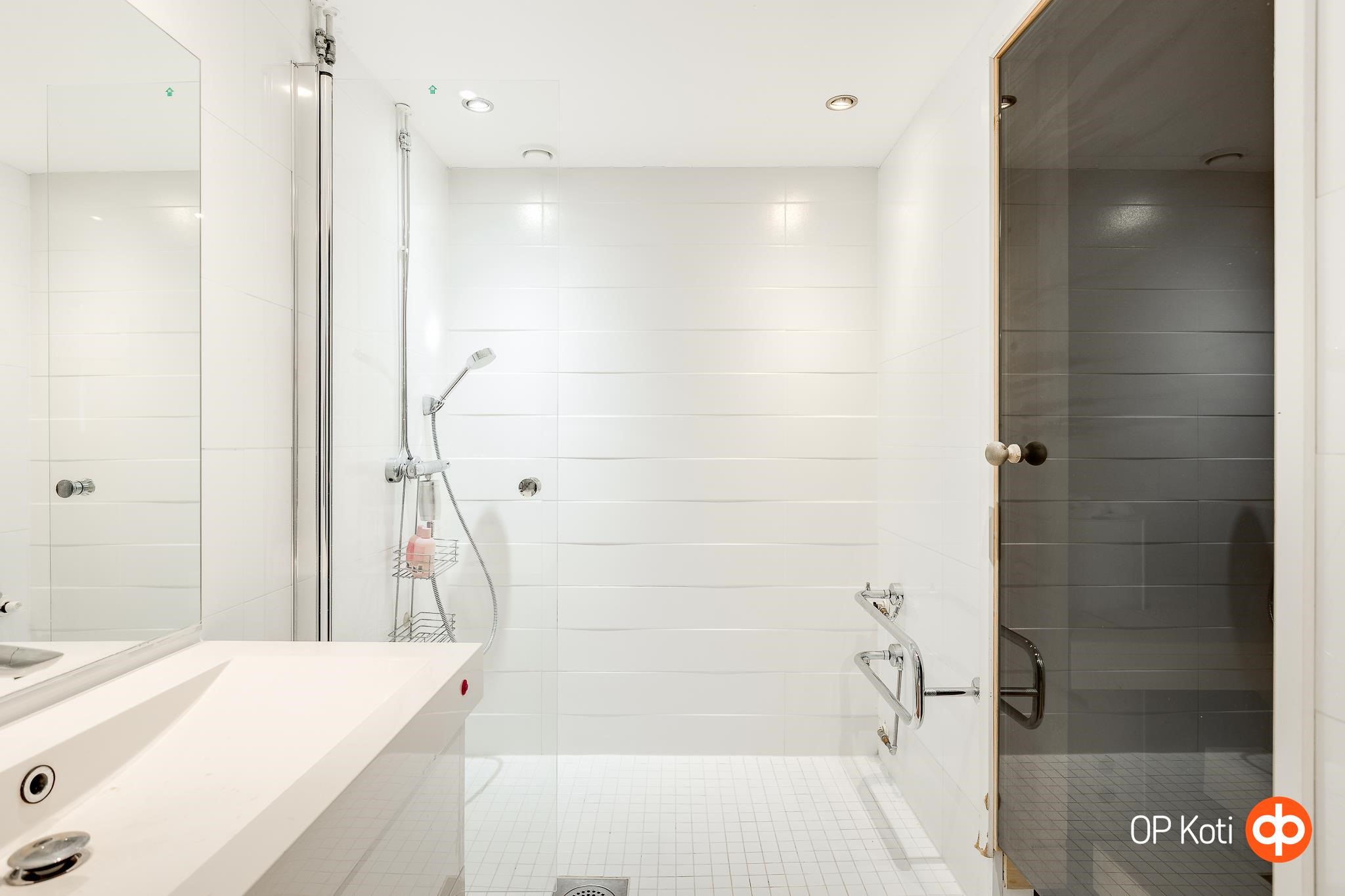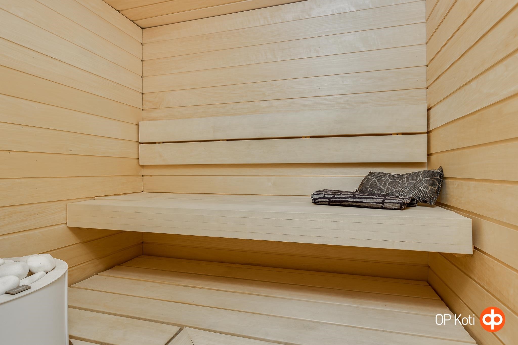 - Sauna, sähkökiuas, erillinen wc, suihku, suihkuseinä, peilit, kaapit, allaskaappi, pesukoneliitäntä, lattialämmitys, kiinteät valaisimet.