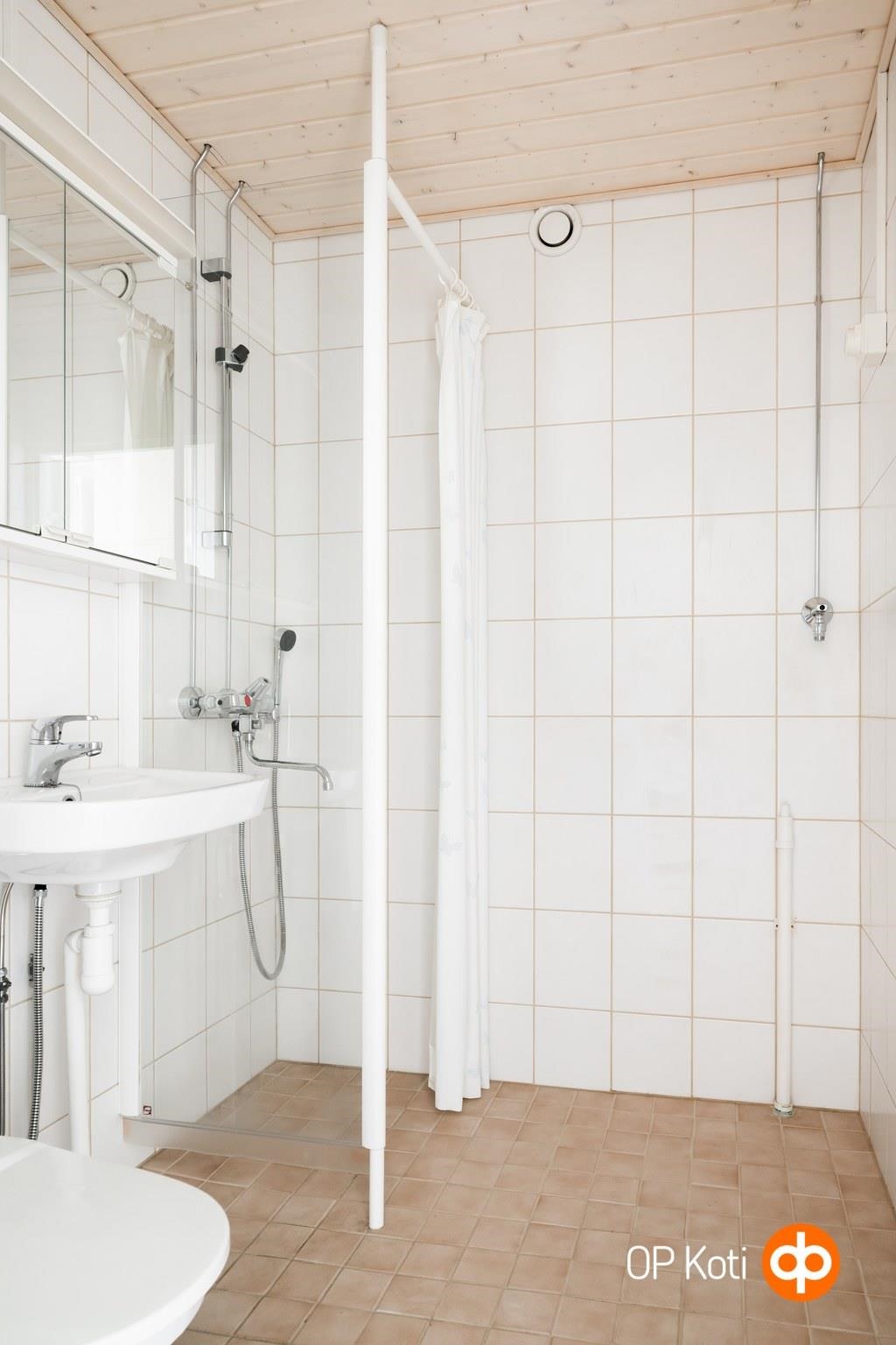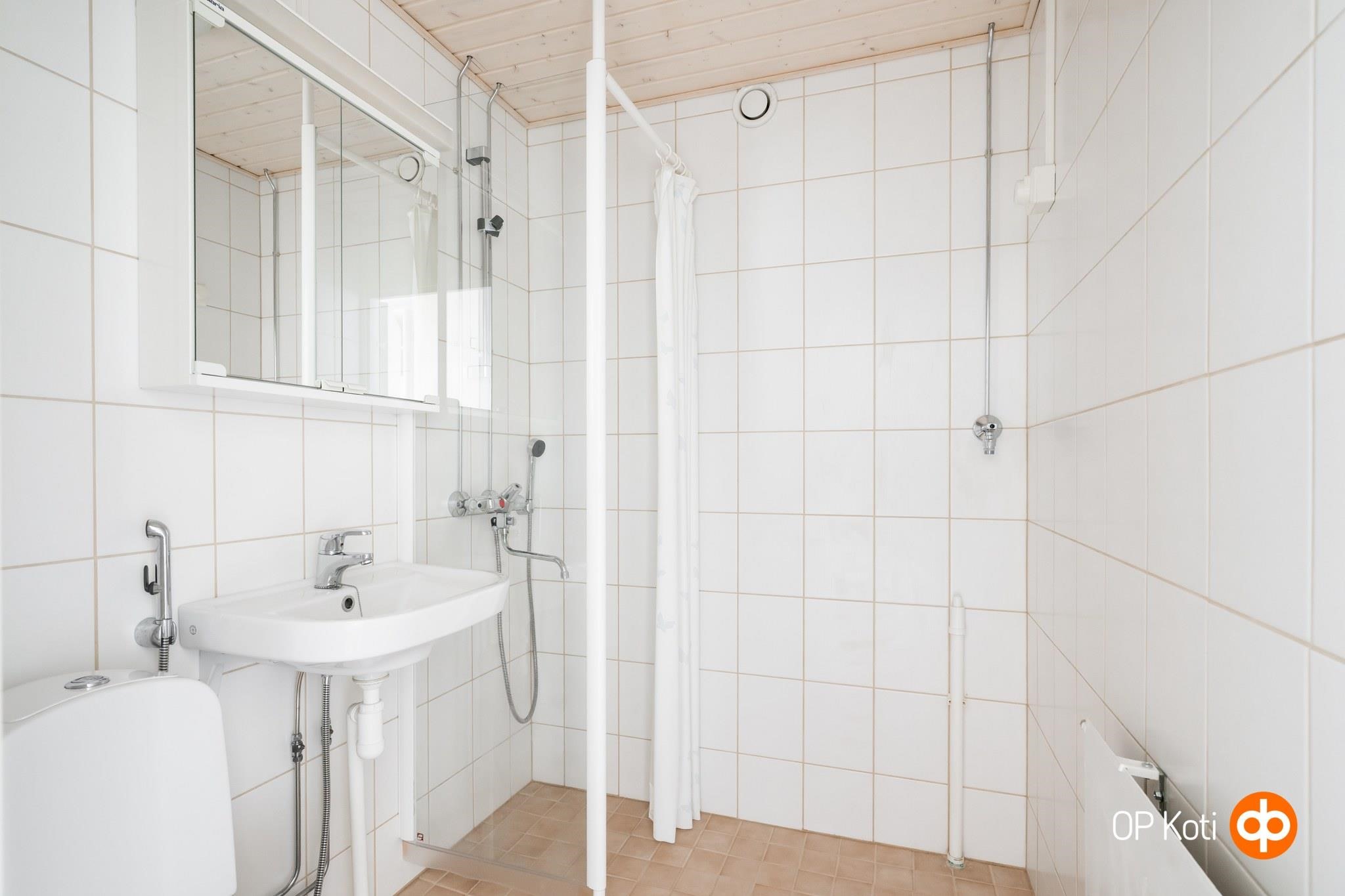 - Kylpyhuone, suihku, suihkuseinä, peilikaappi, pesukoneliitäntä, kiinteät valaisimet.