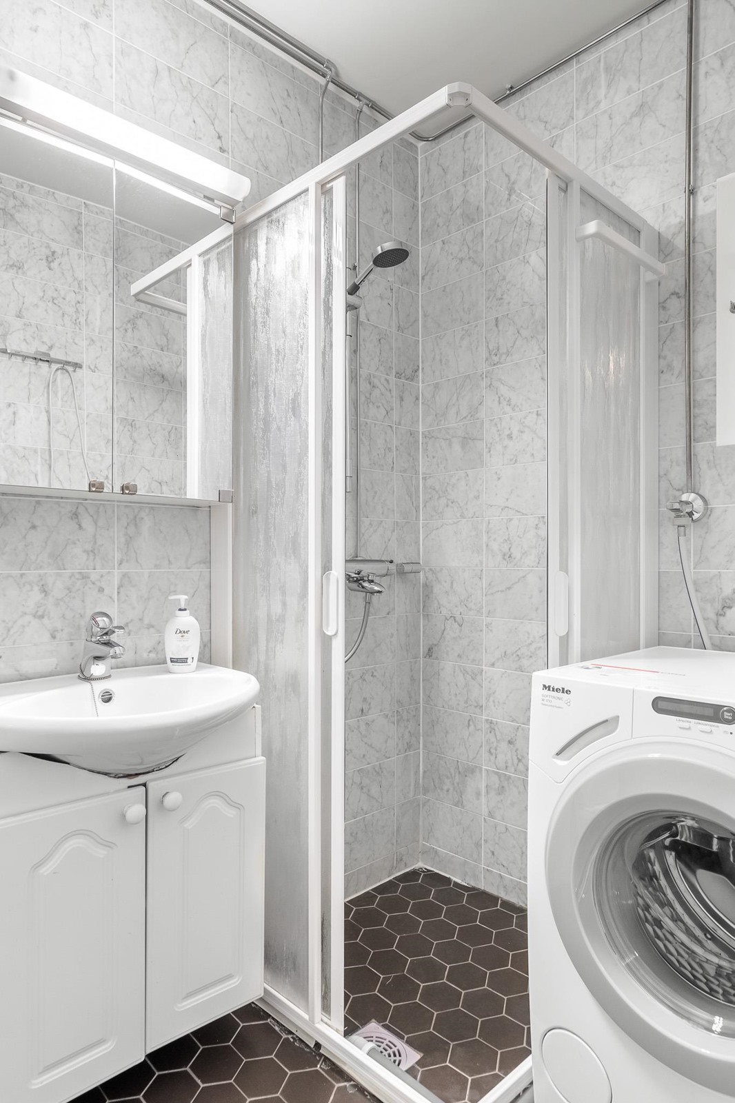 - Kylpyhuone, suihku, suihkukaappi, peilikaappi, allaskaappi, pesukoneliitäntä, kiinteät valaisimet.