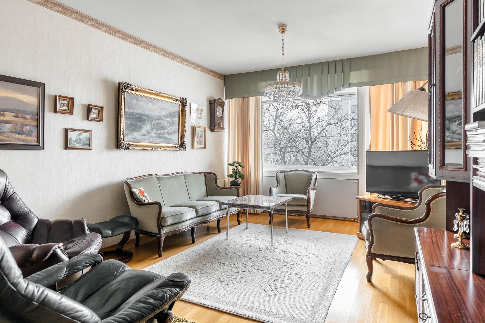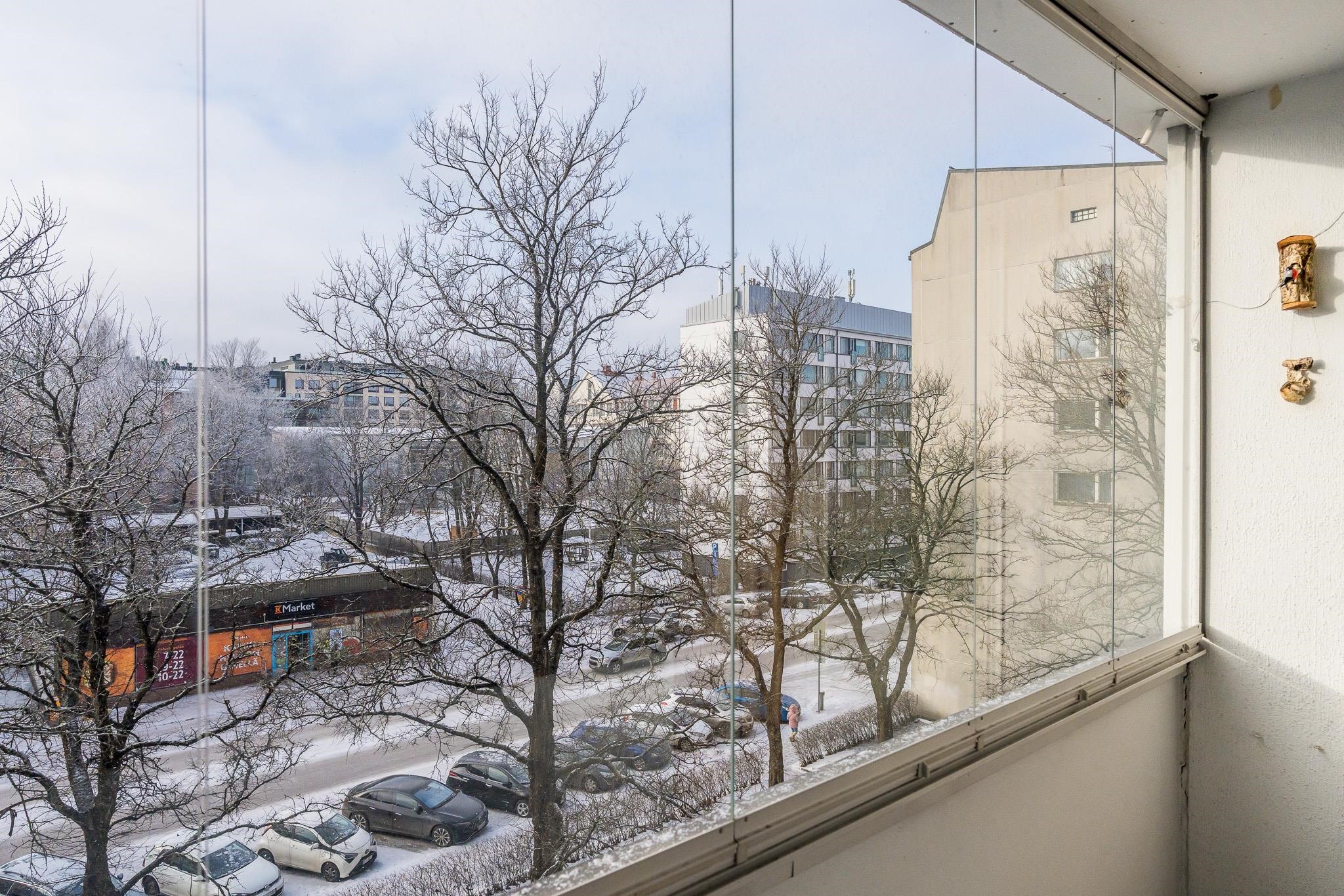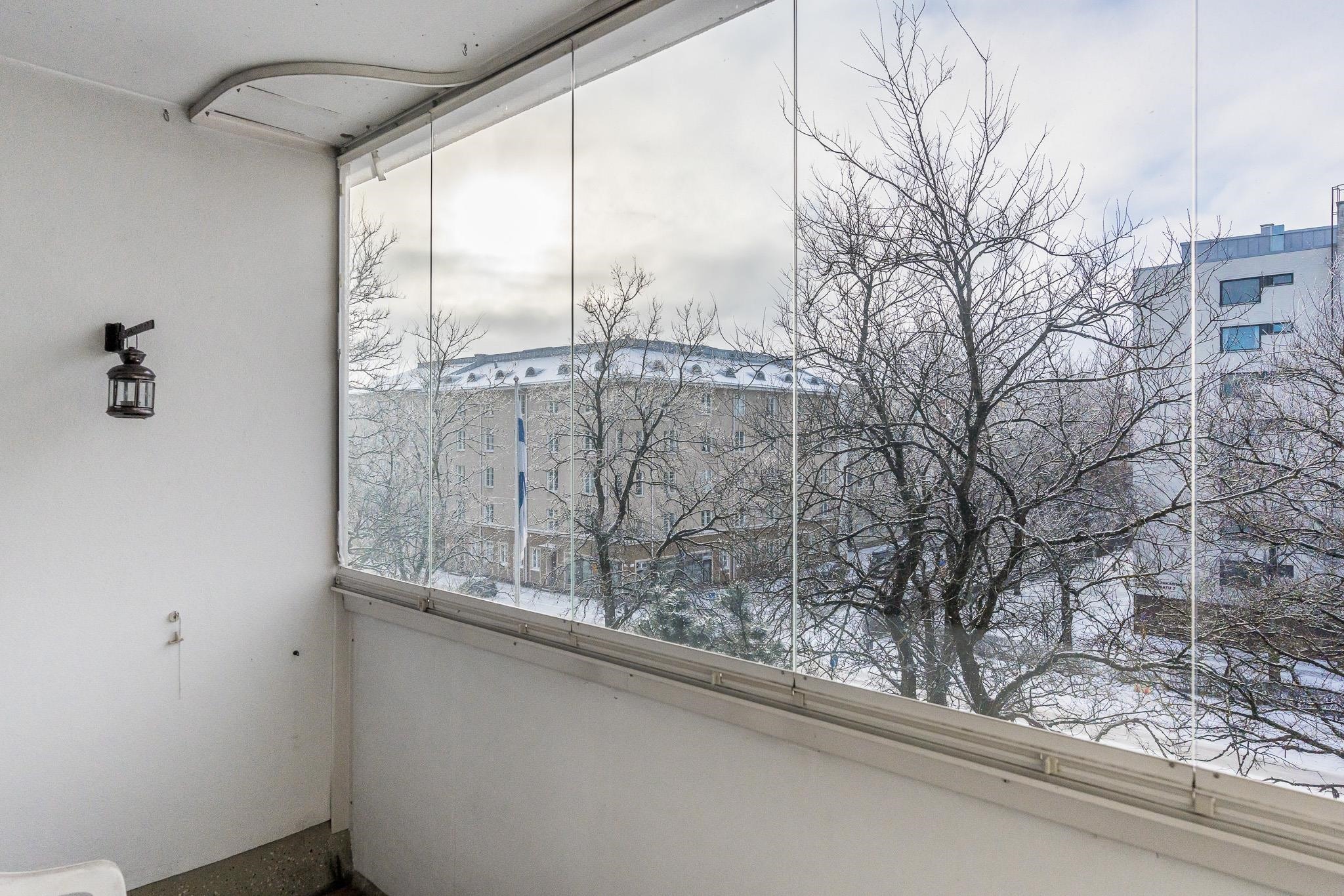 - Olohuoneen levyinen lasitettu parveke länteen vehreillä pihanäkymillä.
