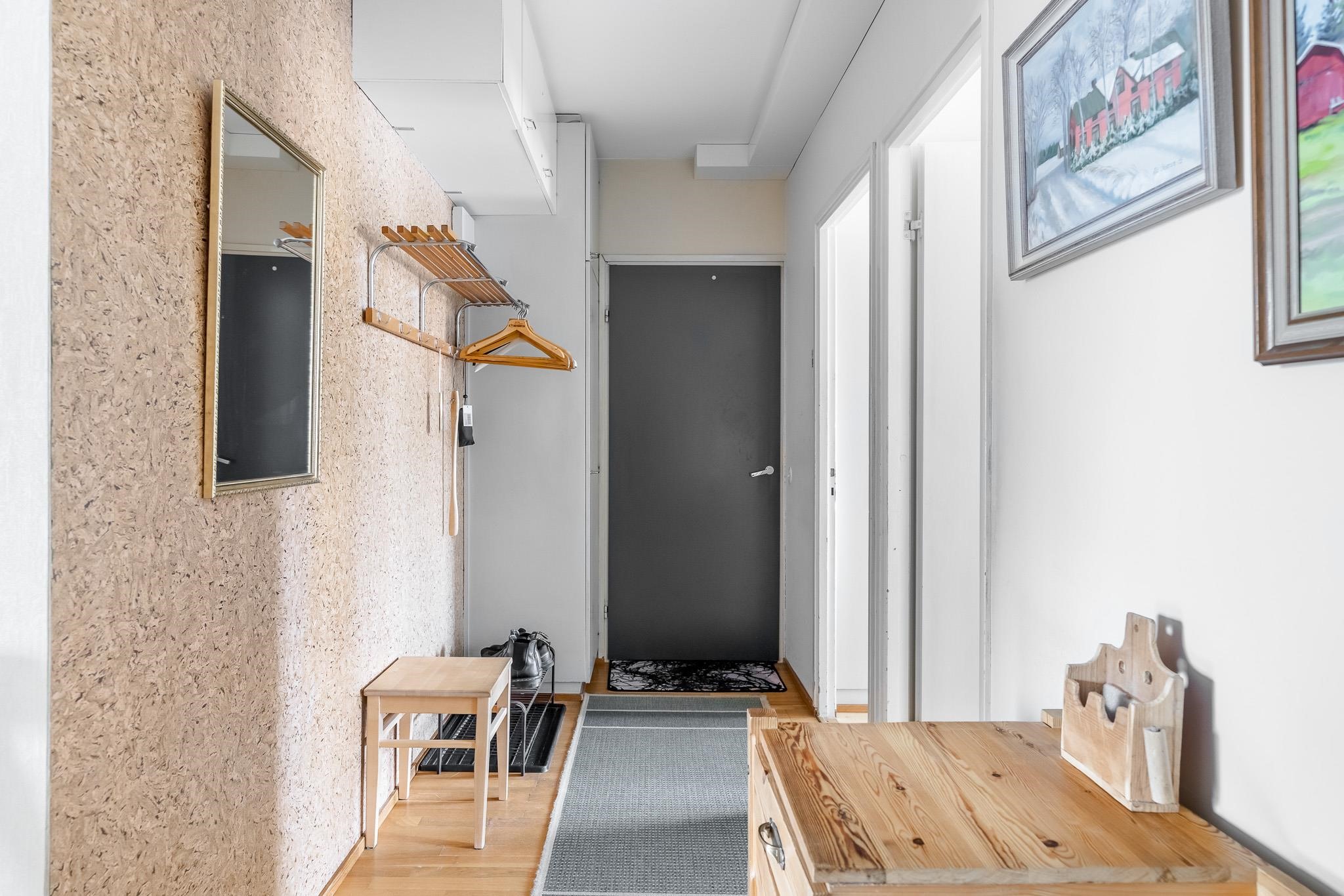 Keittiö: parkettilattia, seinät maali. Olohuone: parkettilattia, seinät tapetti/maali. Makuuhuone 1: muovilattia, seinät tapetti/maali. Makuuhuone 2: muovilattia, seinät tapetti/maali. Kylpyhuone: lattia ja seinät laatoitettu. Eteinen: parkettilattia, seinät maali.