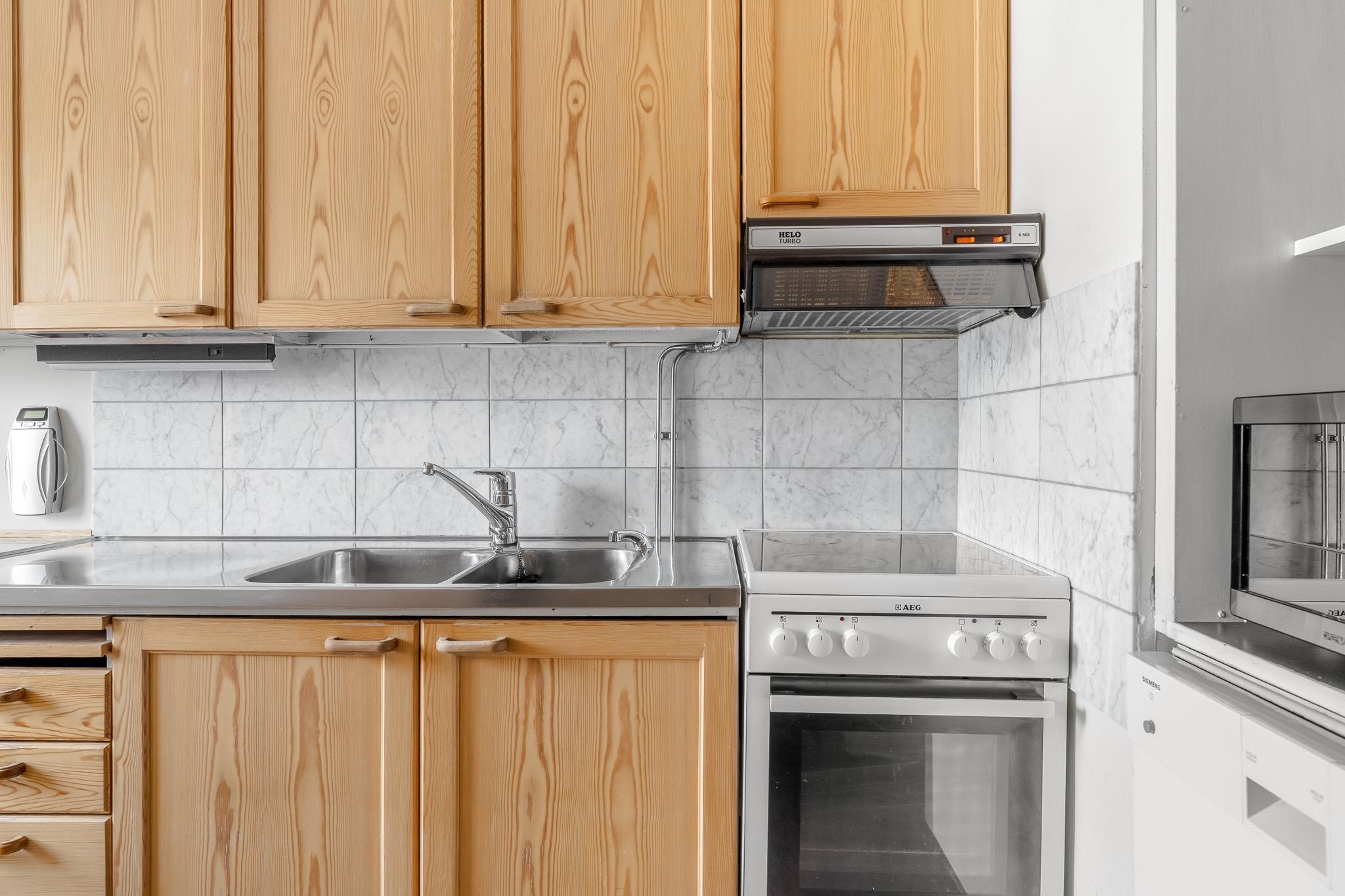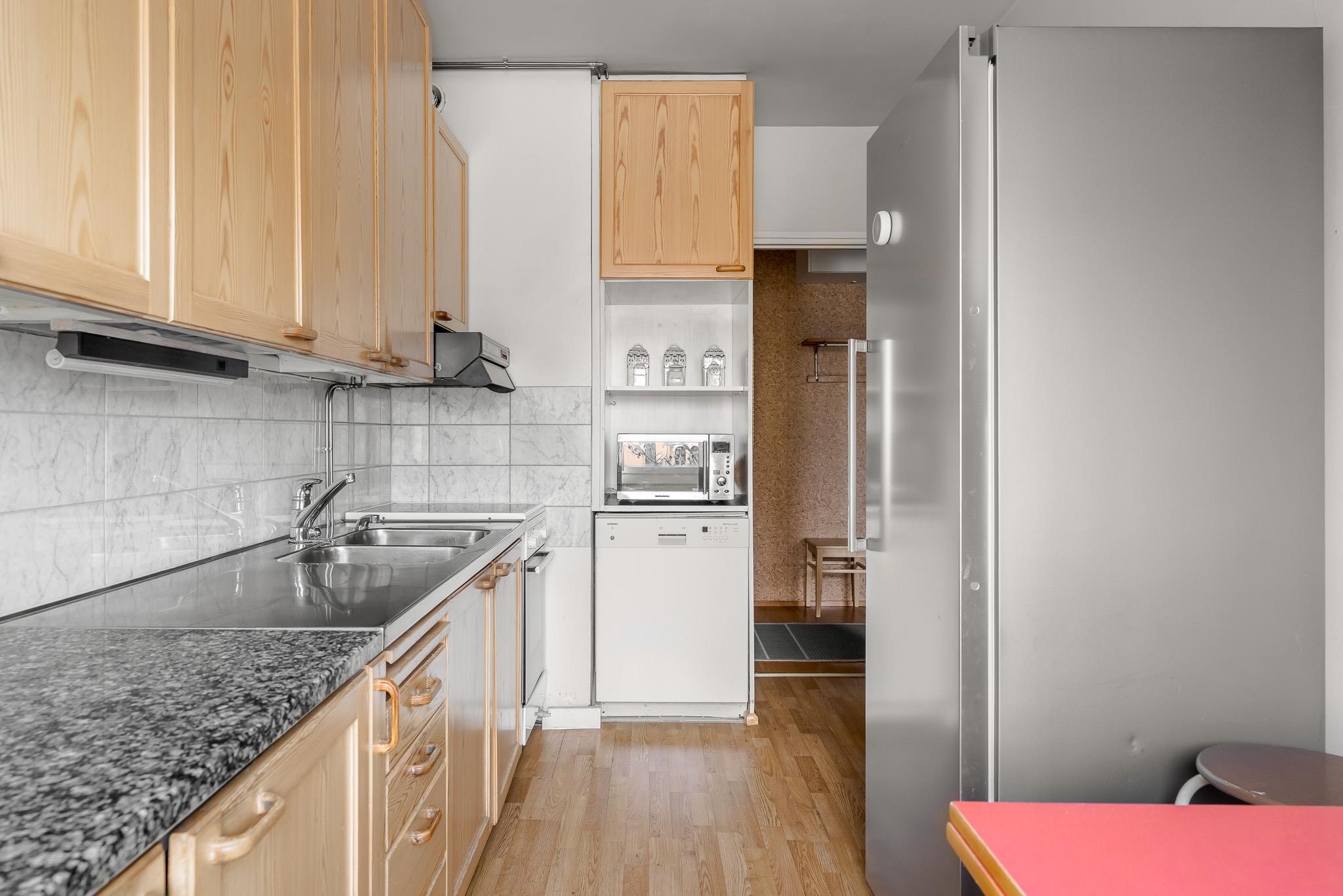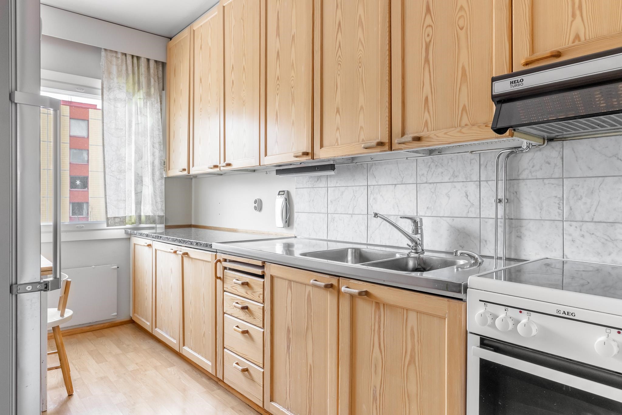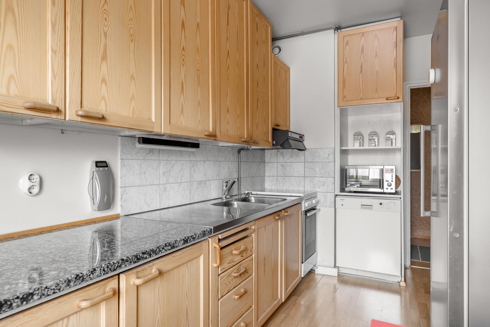 - Jääkaappi, keraaminen liesi, liesituuletin, astianpesukone, kaapistot, kiinteät valaisimet.