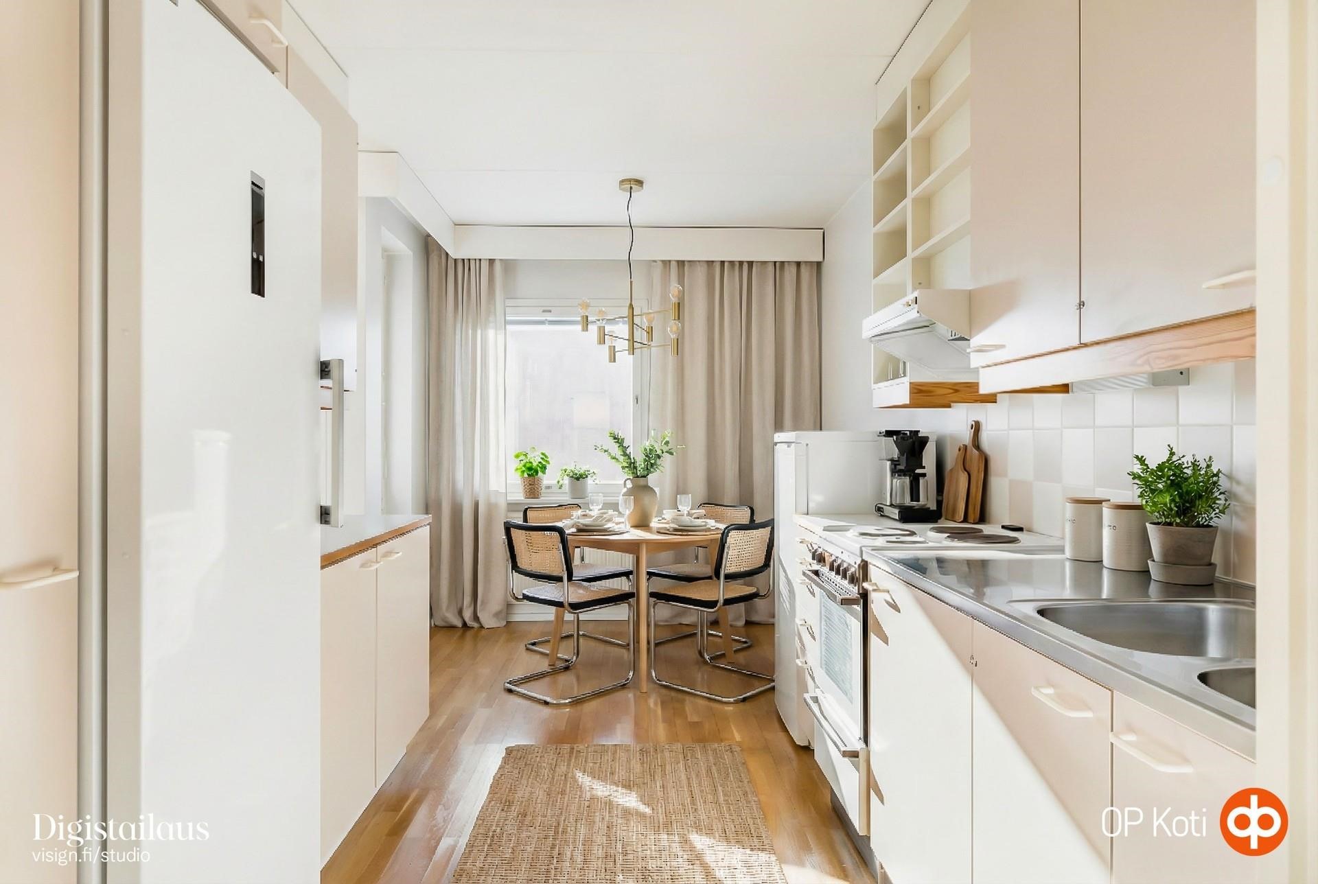 Valoisa ja erittäin siistinä pidetty koti huippupaikalta. Tässä kodissa on viihdytty pitkään, joten se etsii vasta toista omistajaansa. Toimivapohjainen läpitalon kaksio hissillisen talon toisessa kerroksessa. Tilava olohuone, josta suora yhteys keittiöön ruokailutiloineen. Olohuoneesta on käynti parvekkeelle, josta on avarat näkymät lounaaseen. Makuuhuoneessa on paljon säilytystilaa. Loistava mahdollisuus tehdä kodista oman näköinen.